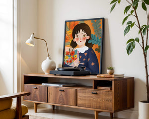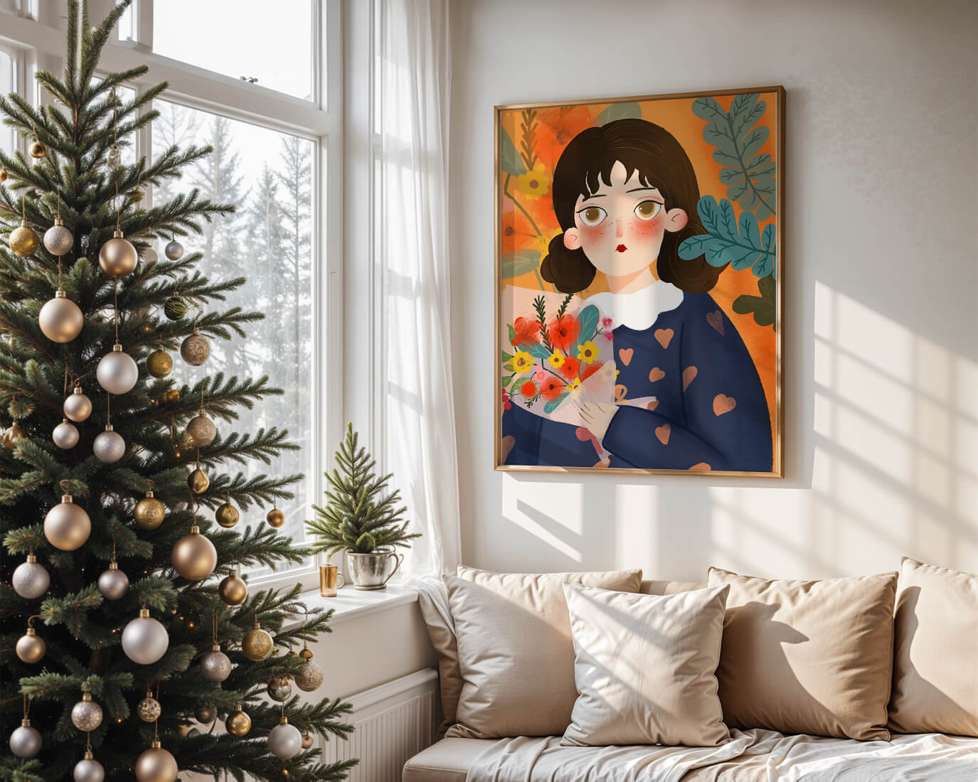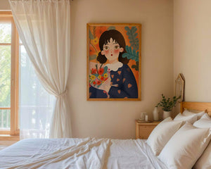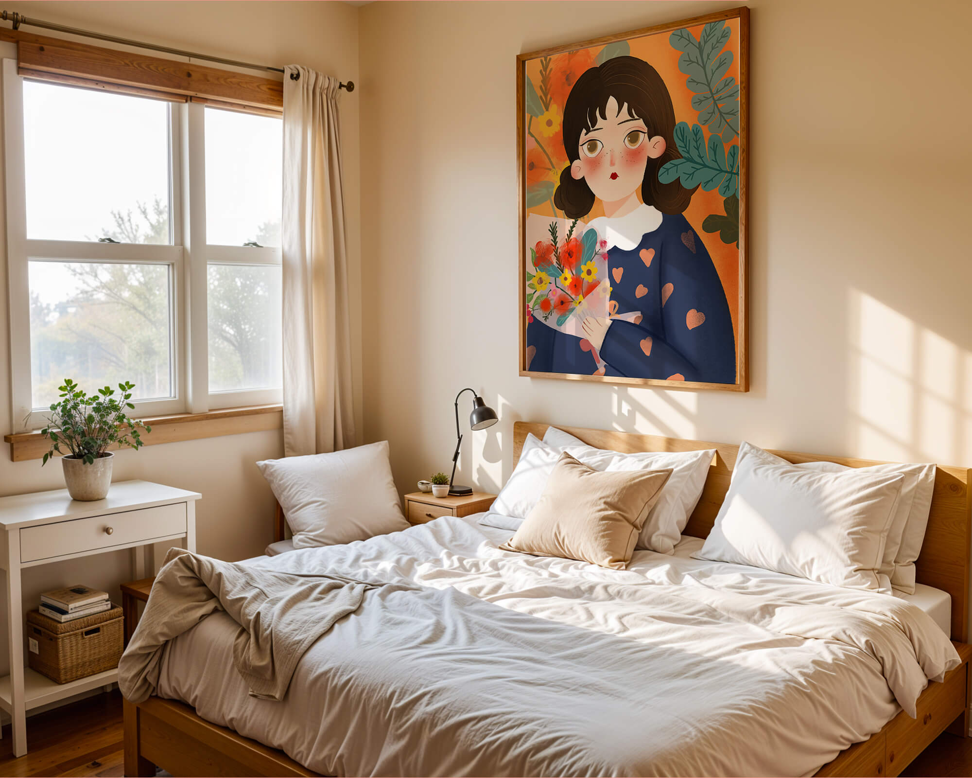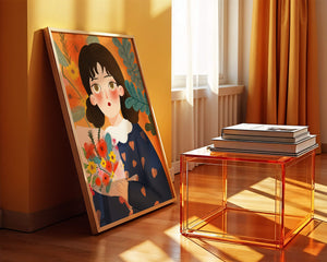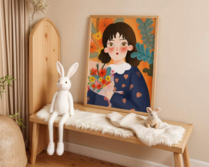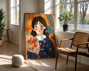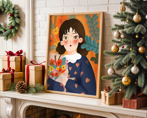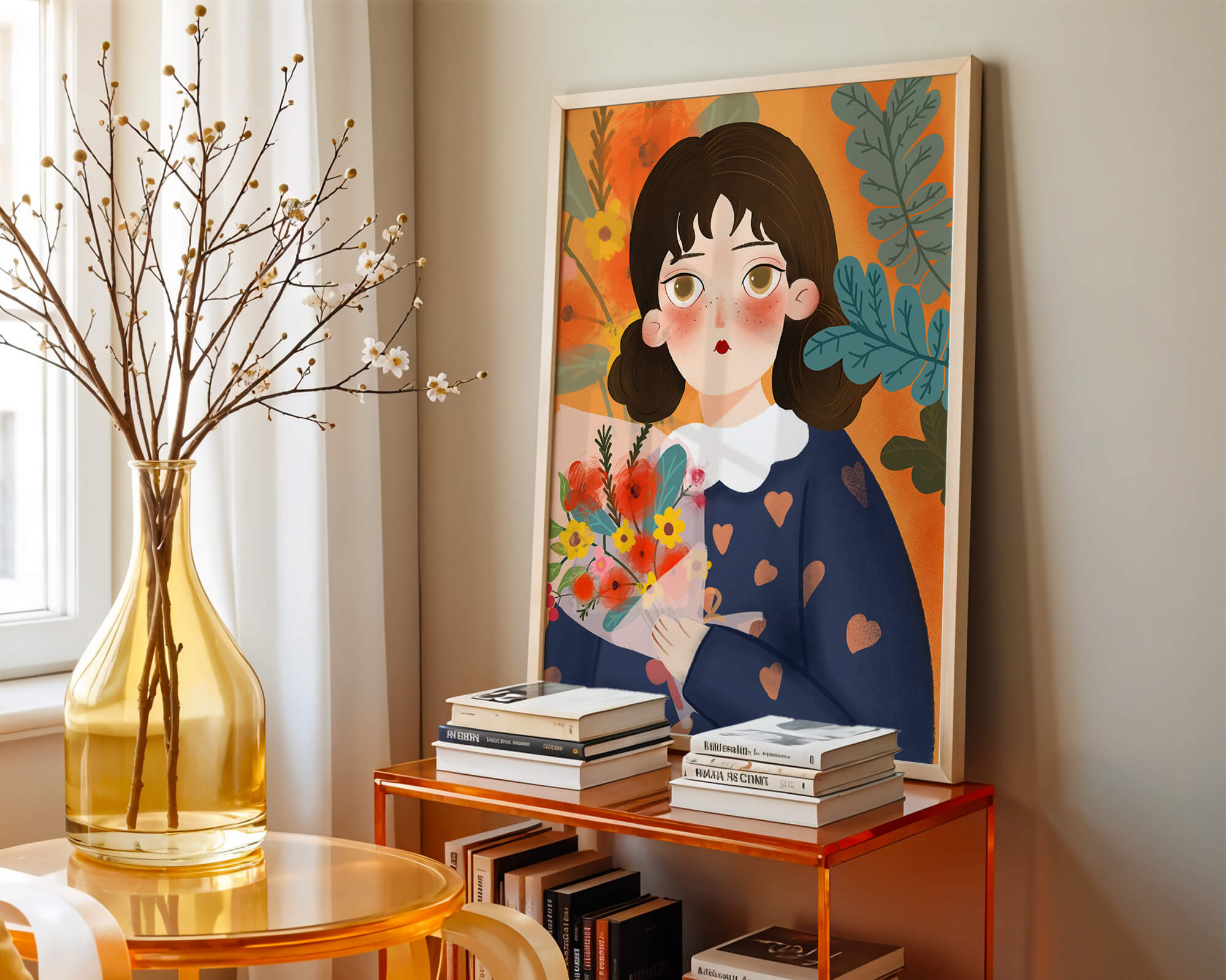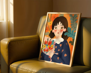 The girls expression is soft and serene, adding a whimsical touch to the scene. Her dark hair is accentuated by the vivid colors of the flowers and surrounding leaves. The bouquet she holds is brimming with various flowers, showcasing a delightful mix of orange, red, and yellow hues that harmonize with the background. The background itself is a lively array of stylized leaves and flowers, contributing to the cheerful and artistic feel of the illustration. The girls outfit, adorned with heart-shaped patterns, complements the overall theme, making this piece a delightful addition to any art collection or home decor setting. This illustration would make a thoughtful gift or a perfect piece for brightening up a living space with its vivid and artistic flai