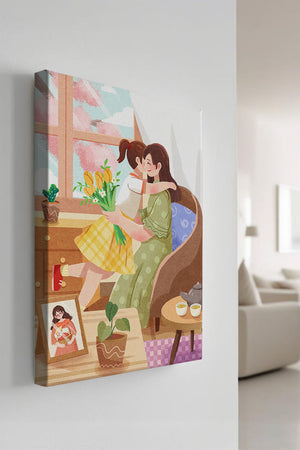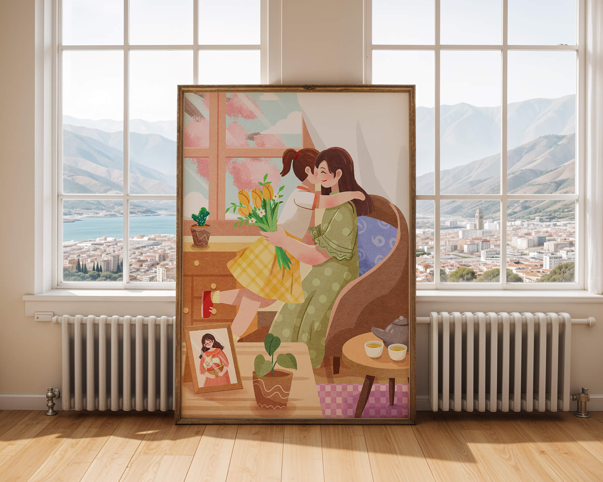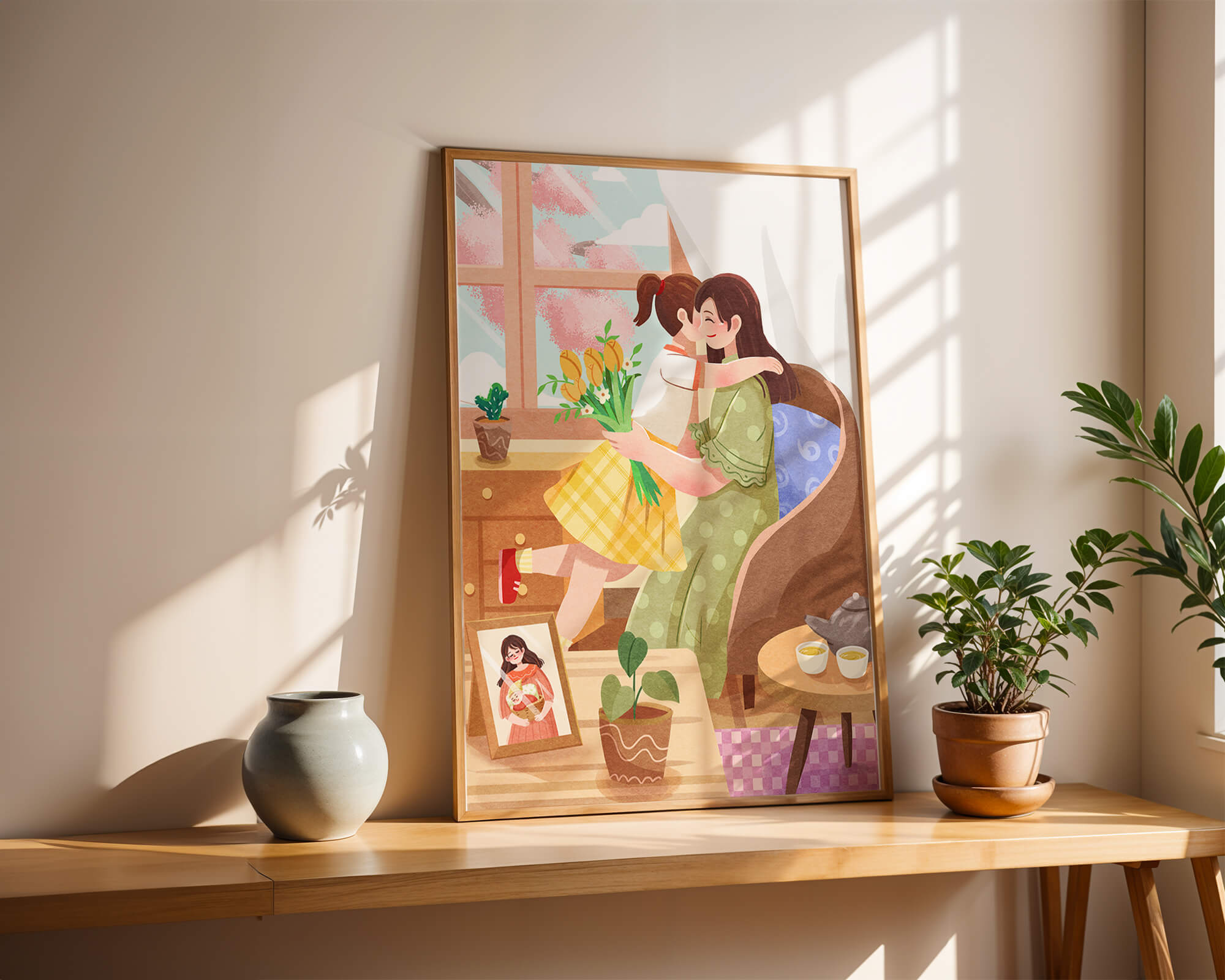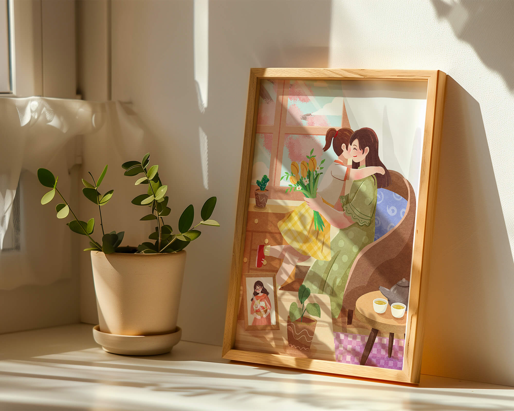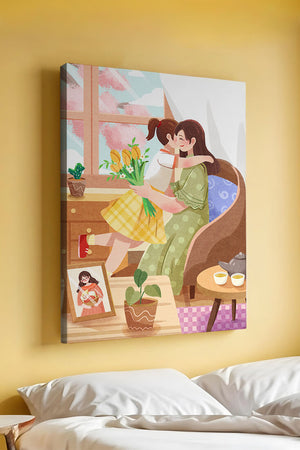 The main focus is on the mother and daughter hugging lovingly, sitting on a comfortable chair by a large window that allows light to stream in, casting a gentle glow on the interior. The daughter, wearing a yellow plaid dress, holds a bouquet of vibrant flowers, symbolizing affection and appreciation.A small table beside them holds a tea set, suggesting a moment of relaxation and conversation. A framed photo on the table adds a personal touch, reminding us of cherished memories. The room is adorned with potted plants, adding a touch of nature and freshness to the scene. The overall mood conveys a sense of familial love, coziness, and tranquility, making it a perfect representation of intimate and joyful family moments.| Type |