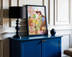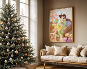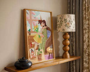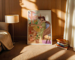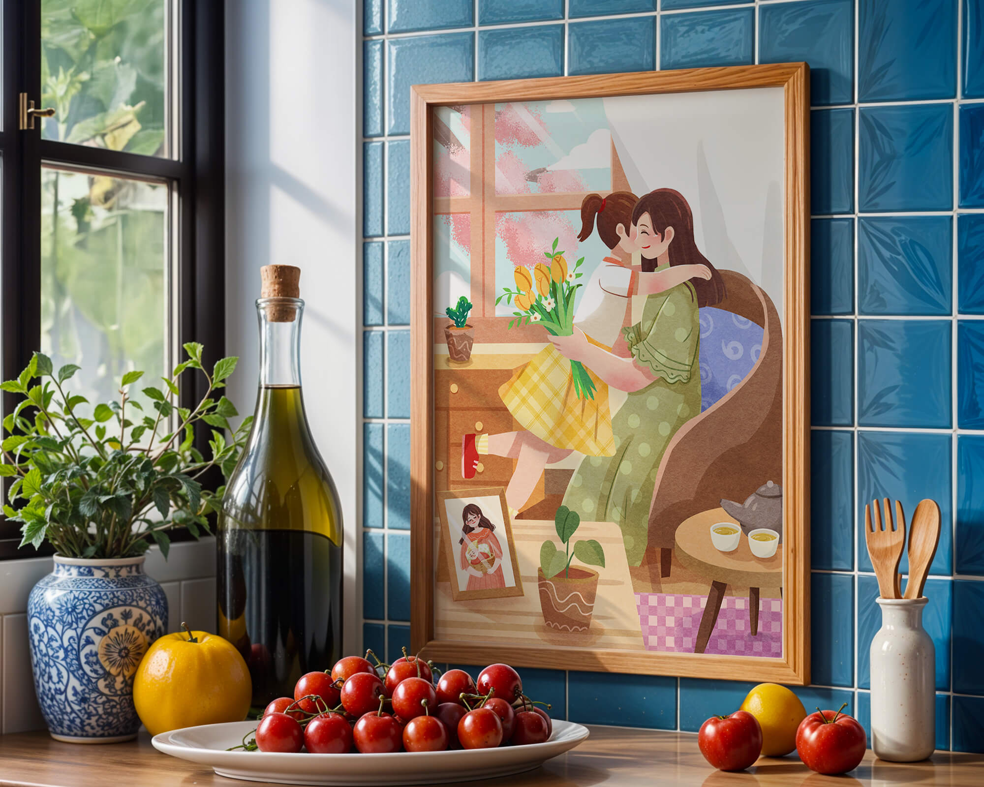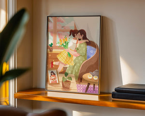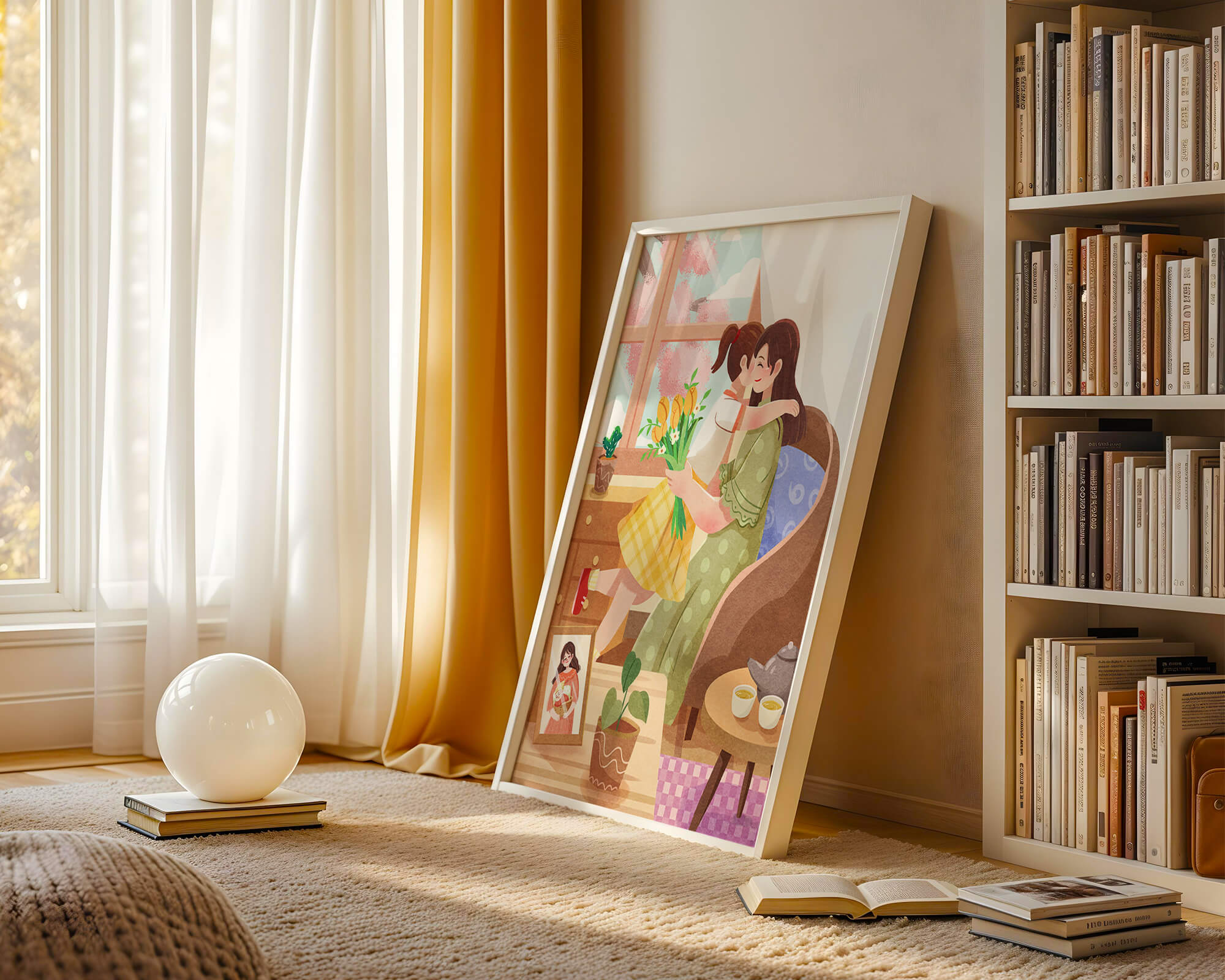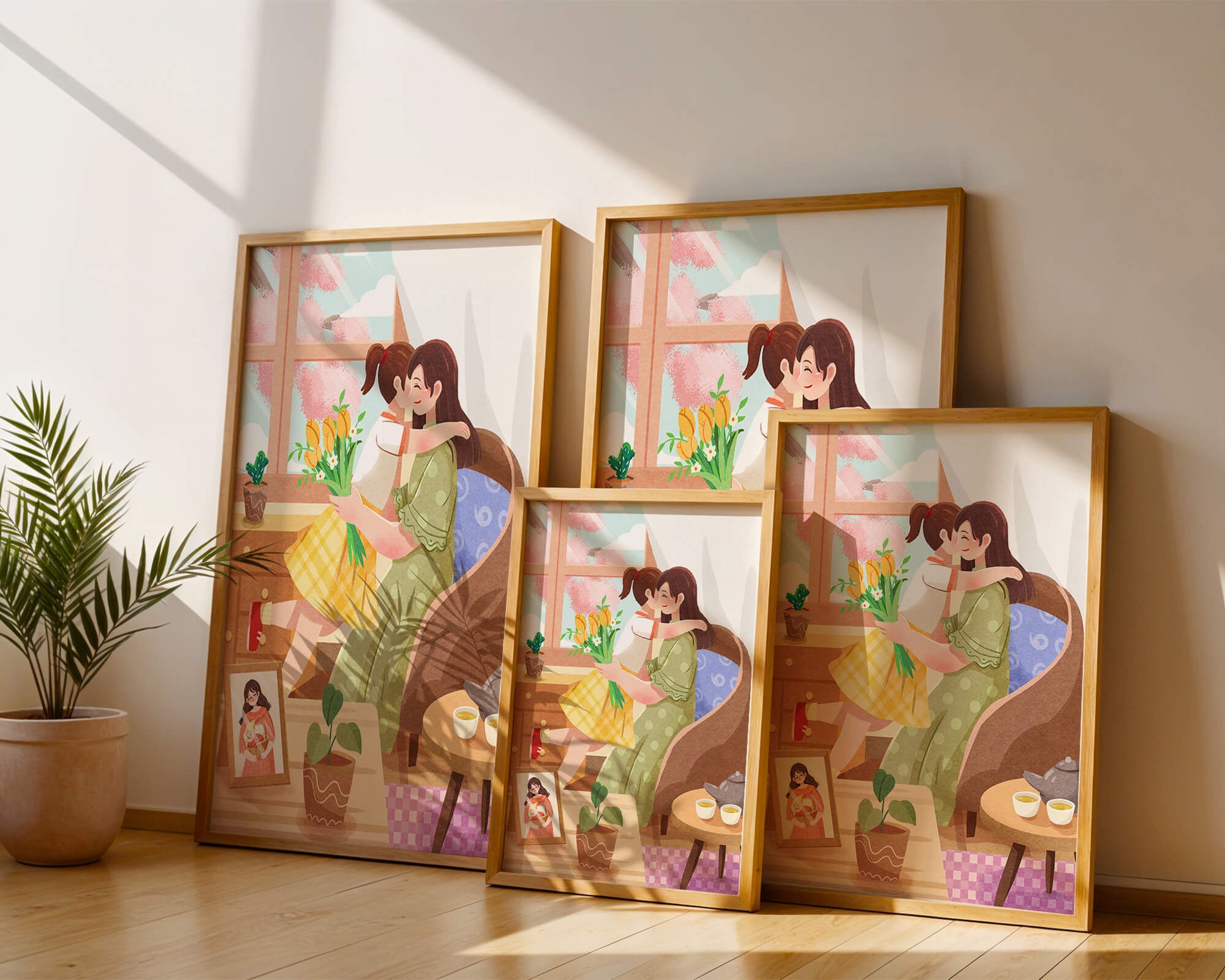 The main focus is on the mother and daughter hugging lovingly, sitting on a comfortable chair by a large window that allows light to stream in, casting a gentle glow on the interior. The daughter, wearing a yellow plaid dress, holds a bouquet of vibrant flowers, symbolizing affection and appreciation.A small table beside them holds a tea set, suggesting a moment of relaxation and conversation. A framed photo on the table adds a personal touch, reminding us of cherished memories. The room is adorned with potted plants, adding a touch of nature and freshness to the scene. The overall mood conveys a sense of familial love, coziness, and tranquility, making it a perfect representation of intimate and joyful family moments.| Type |