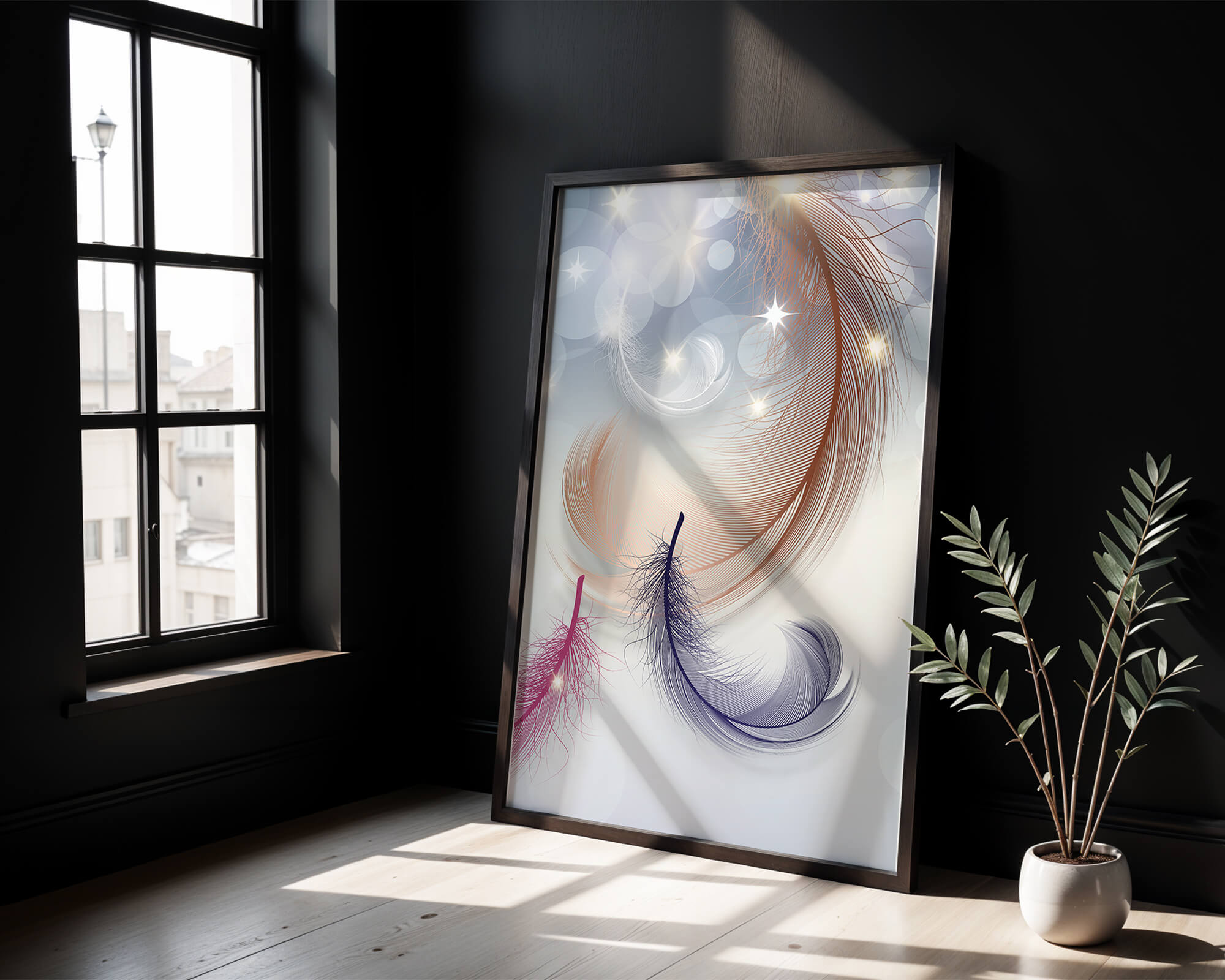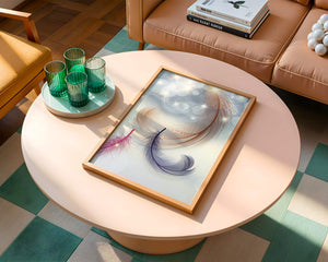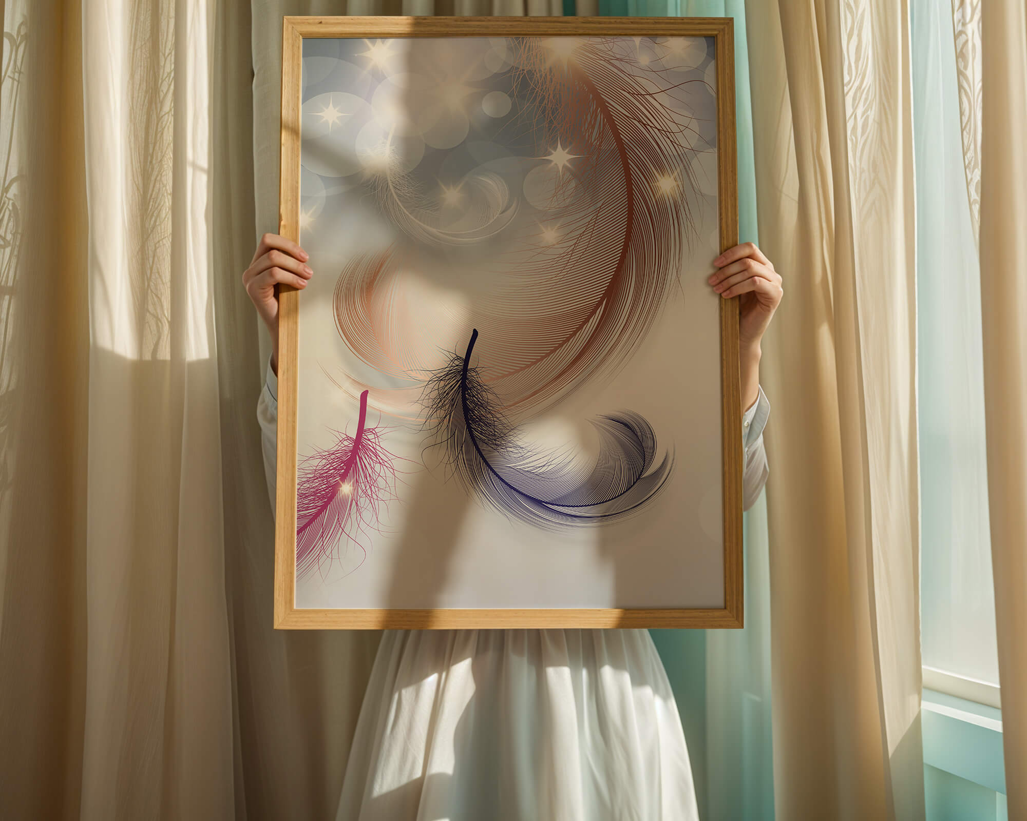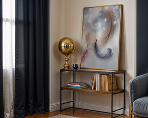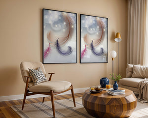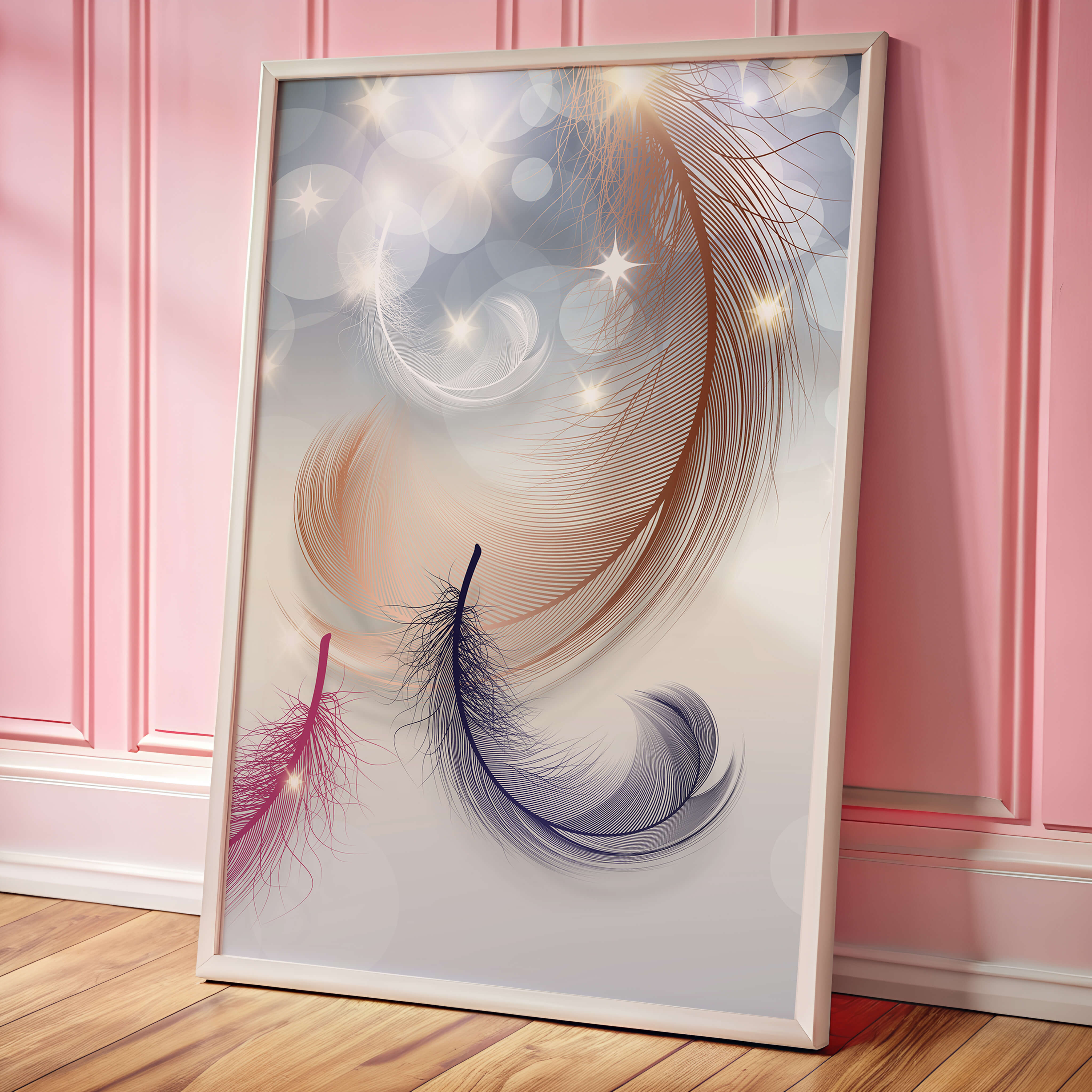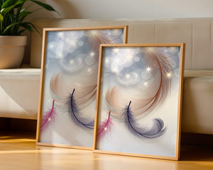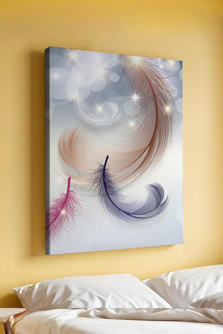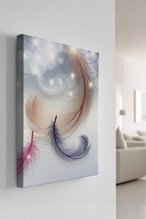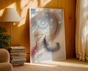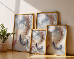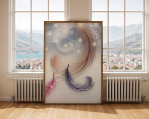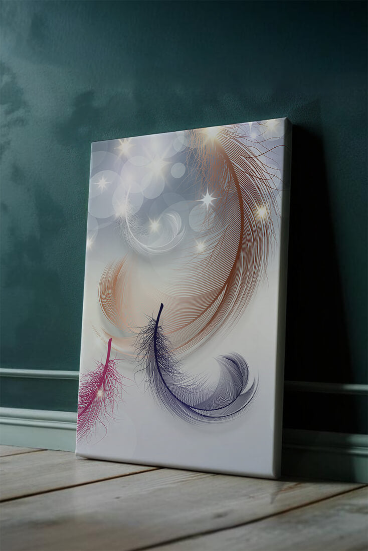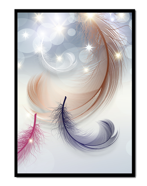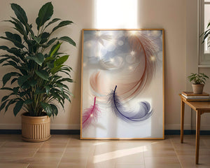 This image showcases an elegant and abstract digital illustration featuring gracefully swirling feathers in a dreamlike atmosphere. The composition is enhanced by the presence of soft bokeh lights and shimmering stars, creating a composition that is both delicate and visually intriguing.The abstraction of the feathers, with their intricate lines and curves, gives the image a contemporary flair. The subtle gradient background and sporadic shimmering light elements add layers of depth, making it an excellent choice for enhancing the aesthetic of any modern space. Whether used in a living room, bedroom, or office, this artwork can harmonize with various interior design styles, offering a serene yet sophisticated visual element to the setting.