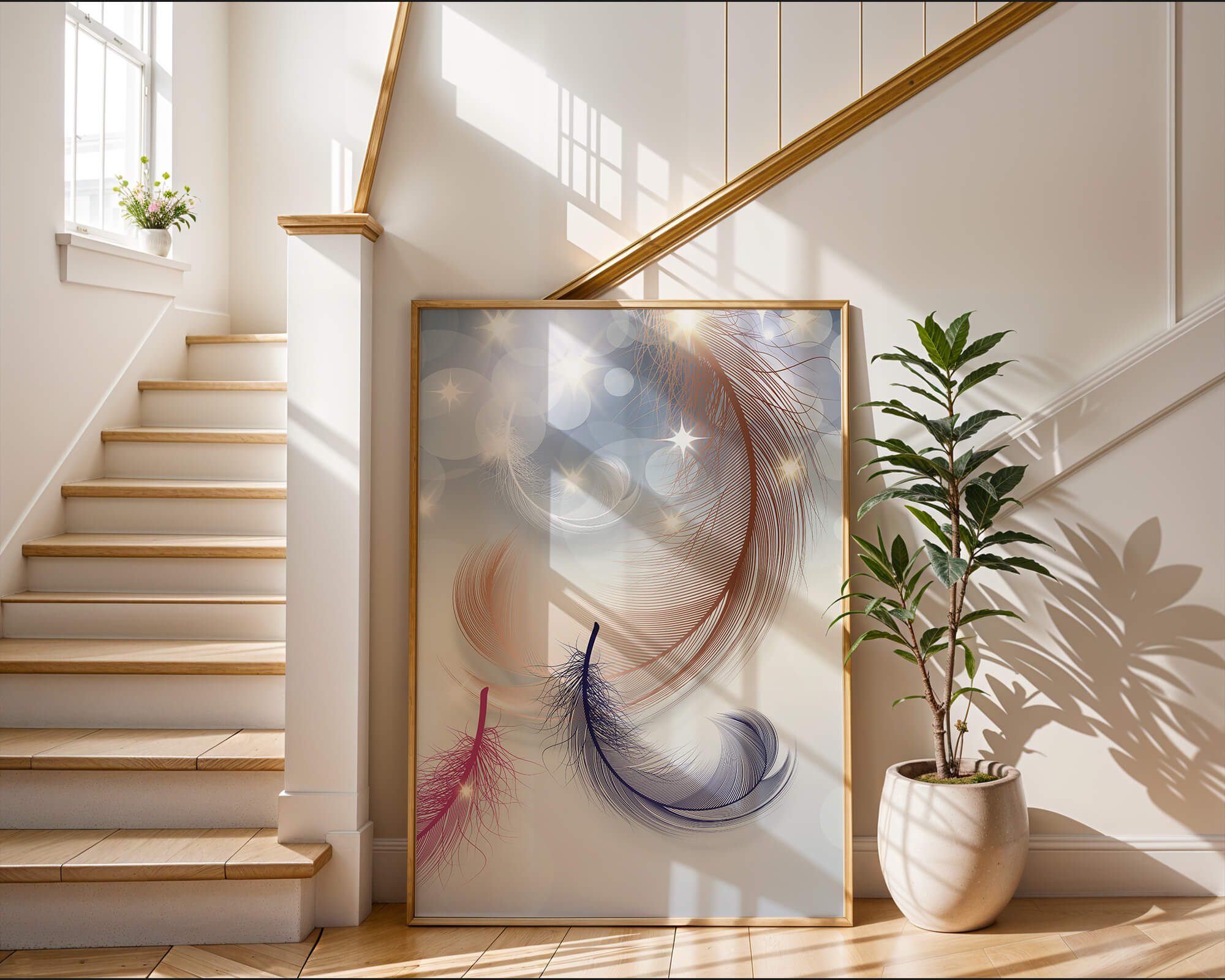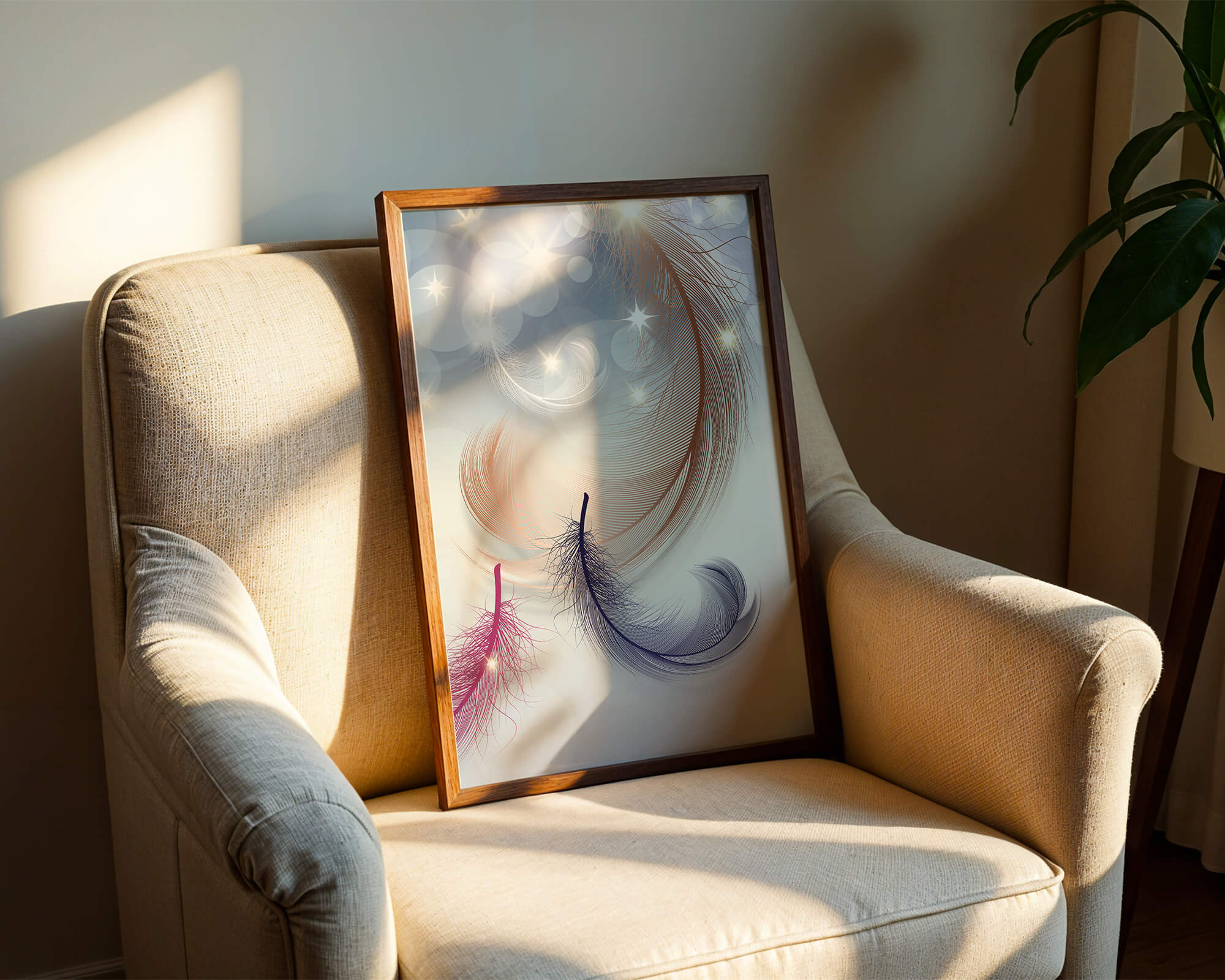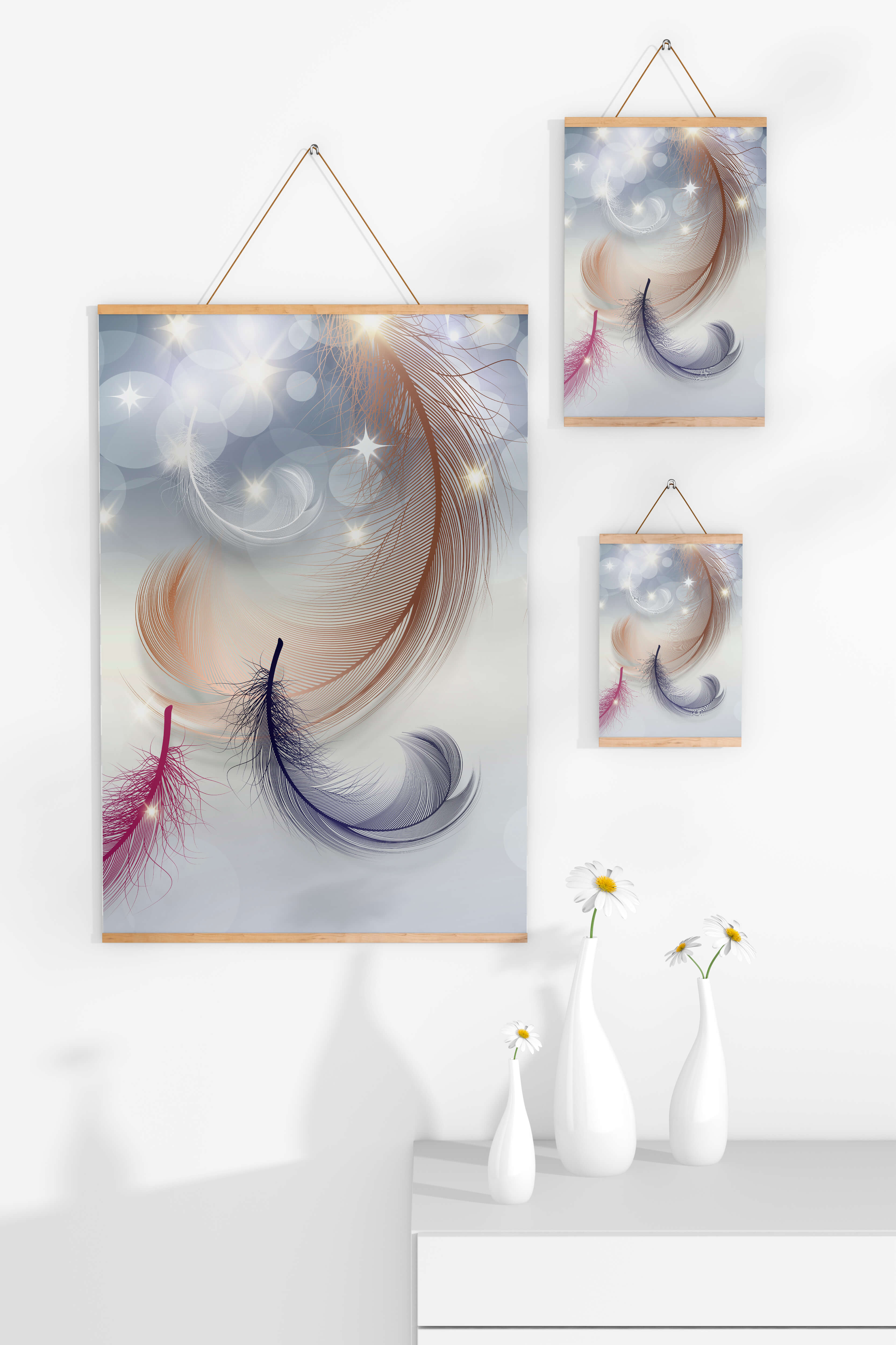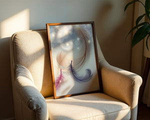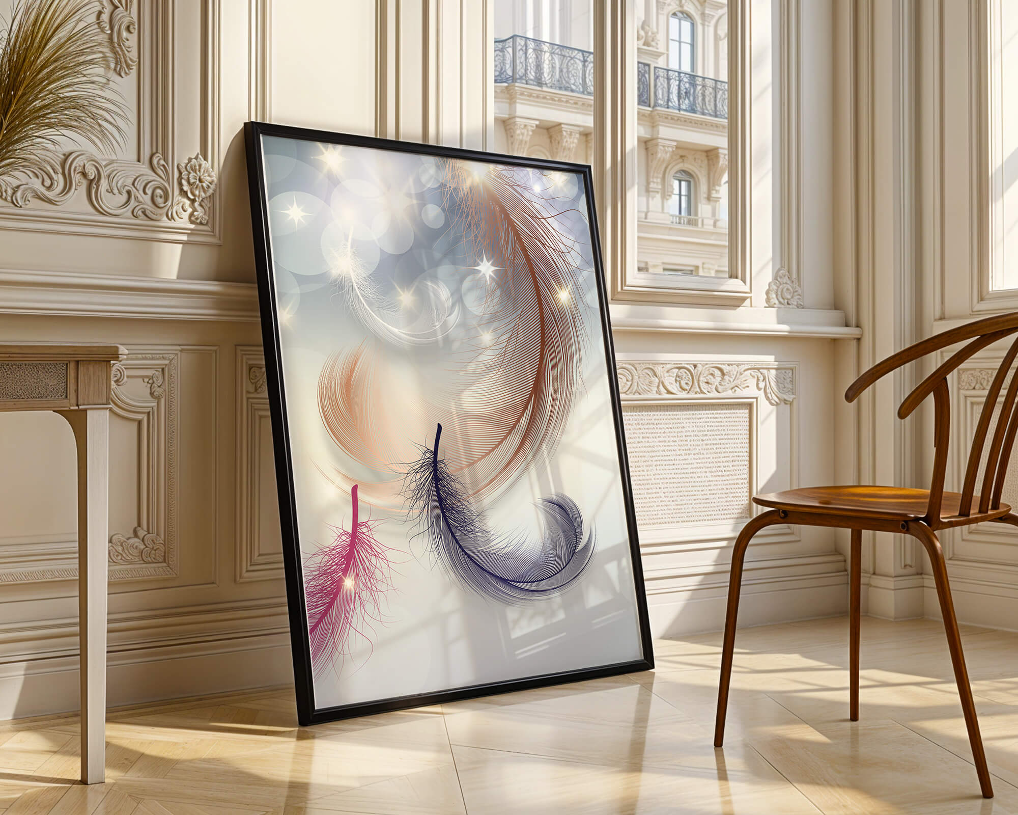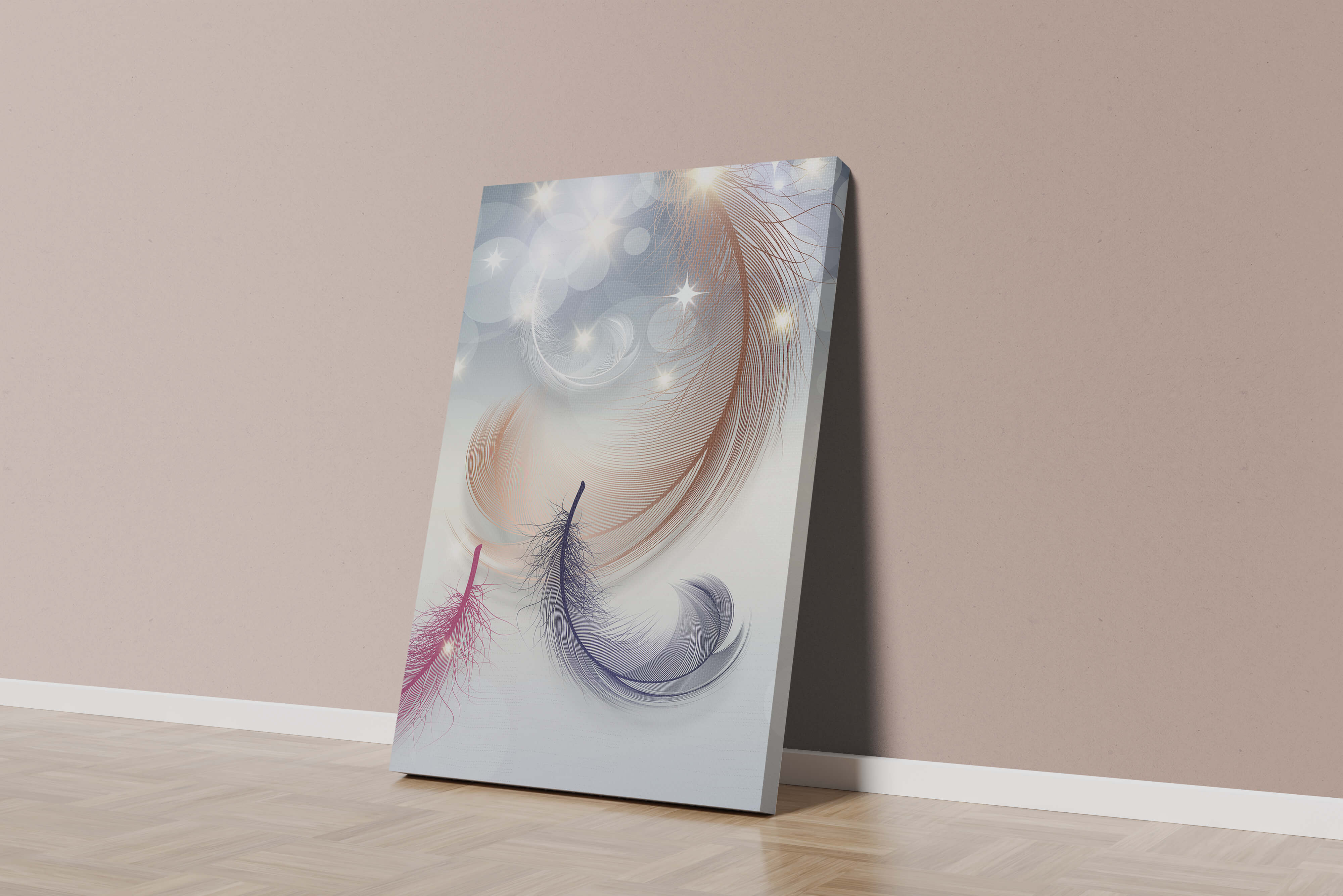 This image showcases an elegant and abstract digital illustration featuring gracefully swirling feathers in a dreamlike atmosphere. The composition is enhanced by the presence of soft bokeh lights and shimmering stars, creating a composition that is both delicate and visually intriguing.The abstraction of the feathers, with their intricate lines and curves, gives the image a contemporary flair. The subtle gradient background and sporadic shimmering light elements add layers of depth, making it an excellent choice for enhancing the aesthetic of any modern space. Whether used in a living room, bedroom, or office, this artwork can harmonize with various interior design styles, offering a serene yet sophisticated visual element to the setting.