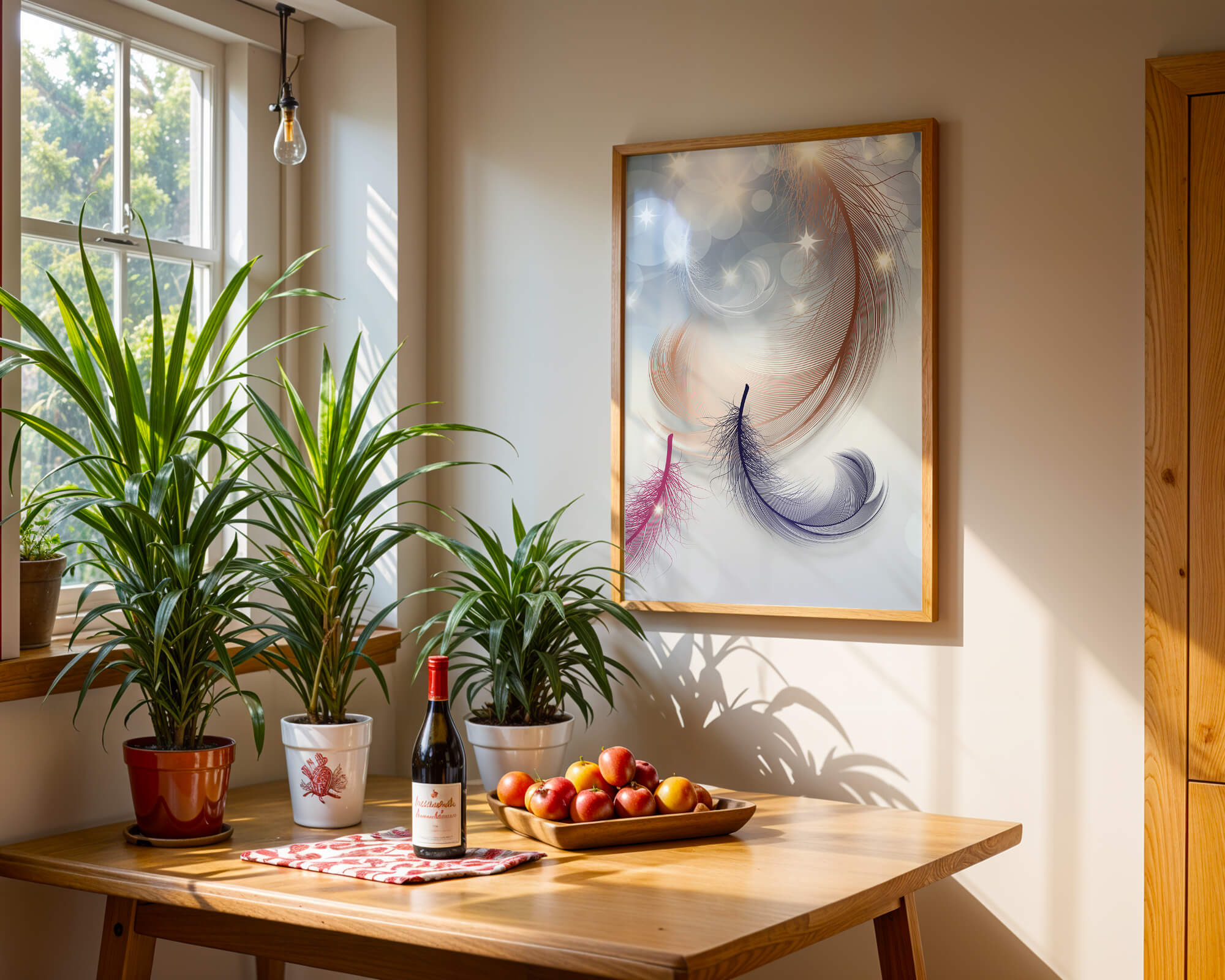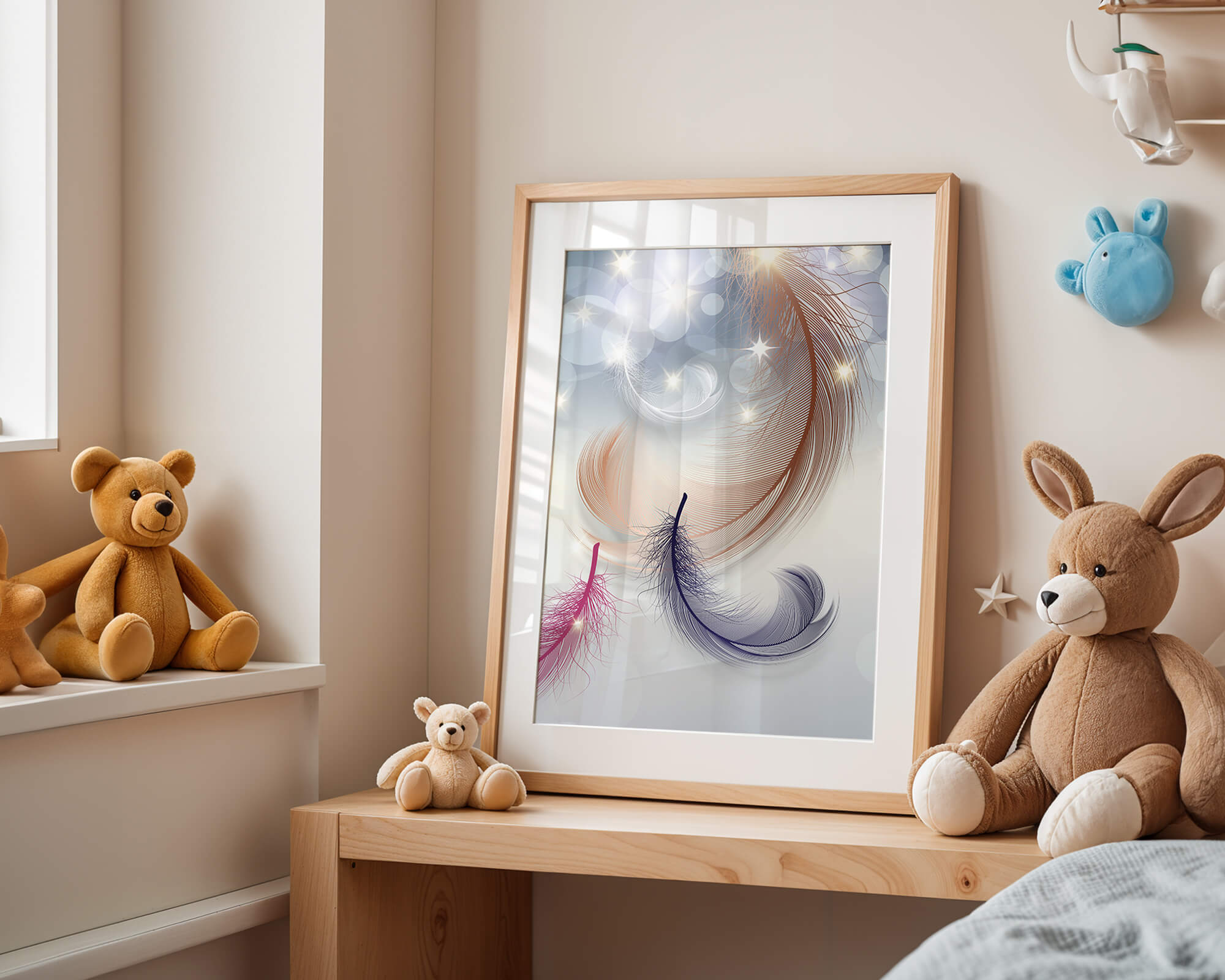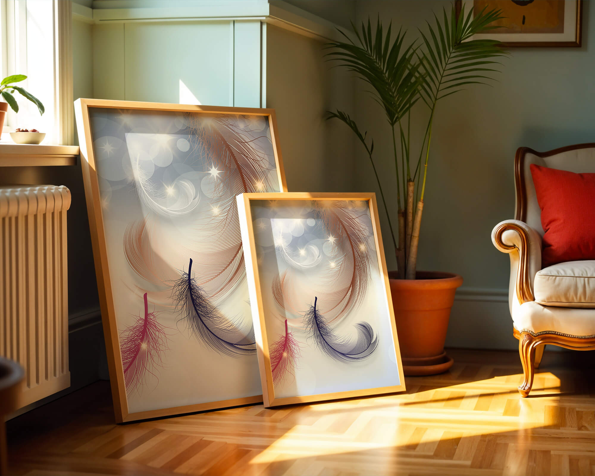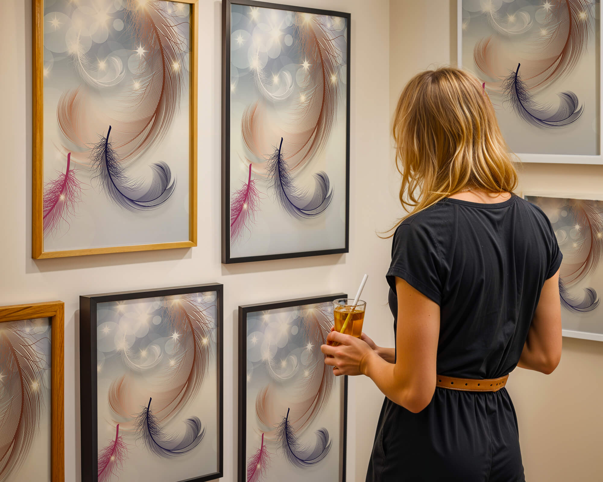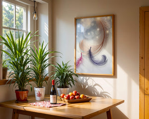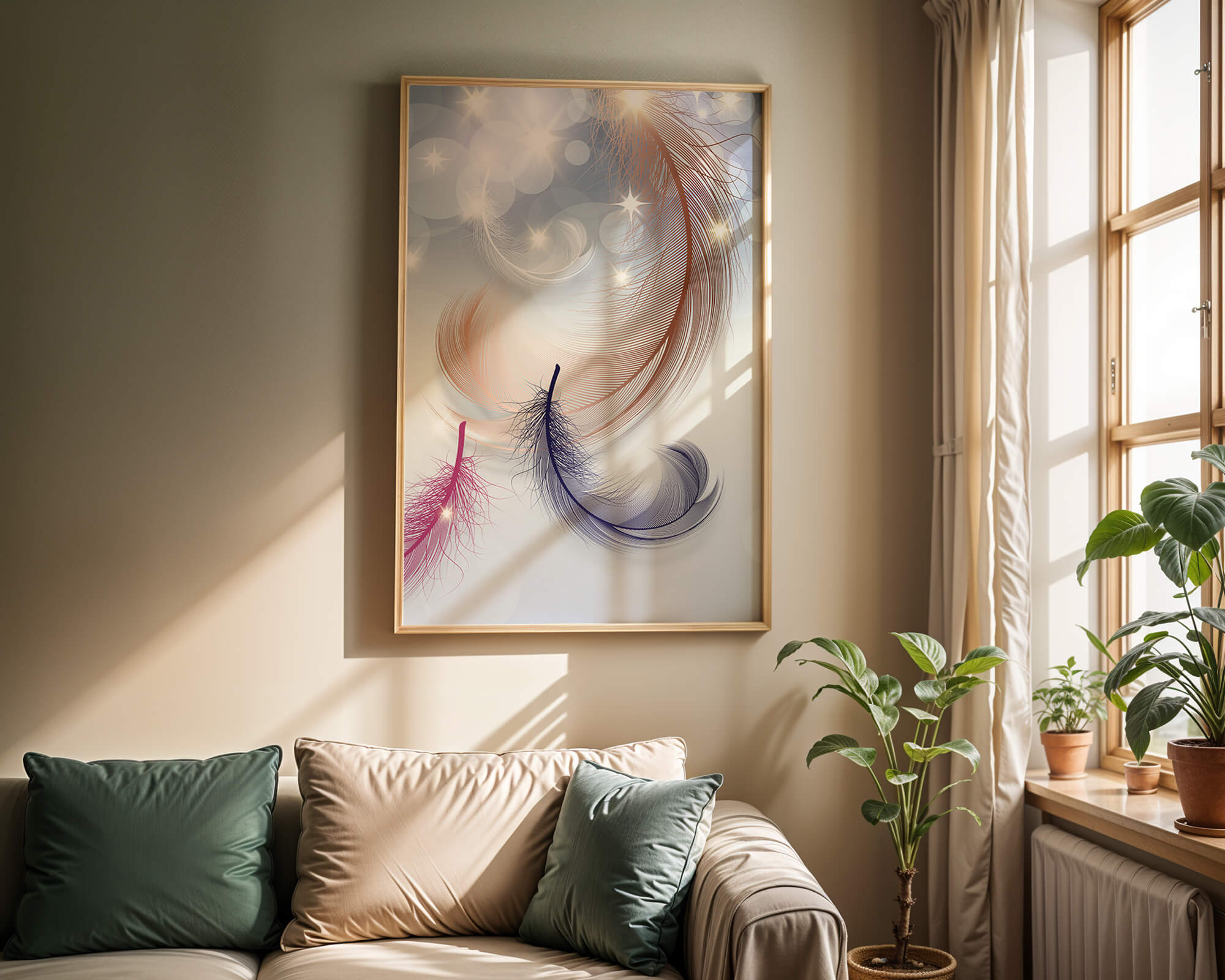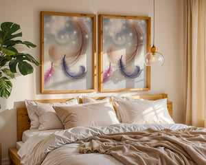 This image showcases an elegant and abstract digital illustration featuring gracefully swirling feathers in a dreamlike atmosphere. The composition is enhanced by the presence of soft bokeh lights and shimmering stars, creating a composition that is both delicate and visually intriguing.The abstraction of the feathers, with their intricate lines and curves, gives the image a contemporary flair. The subtle gradient background and sporadic shimmering light elements add layers of depth, making it an excellent choice for enhancing the aesthetic of any modern space. Whether used in a living room, bedroom, or office, this artwork can harmonize with various interior design styles, offering a serene yet sophisticated visual element to the setting.