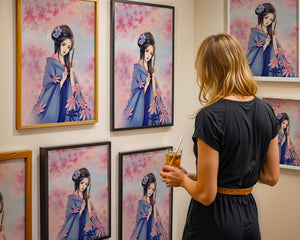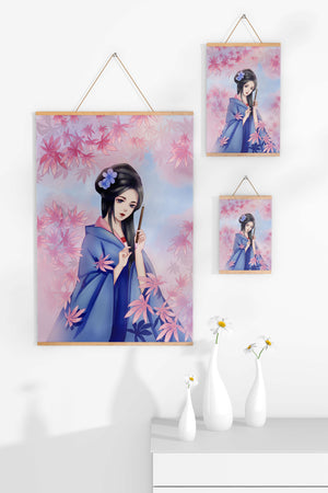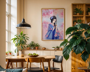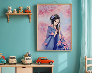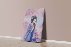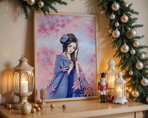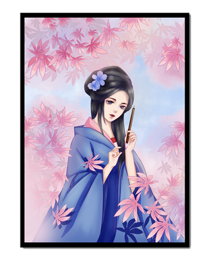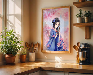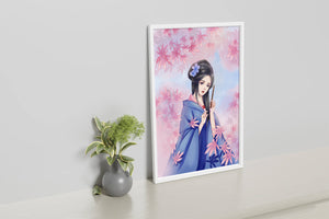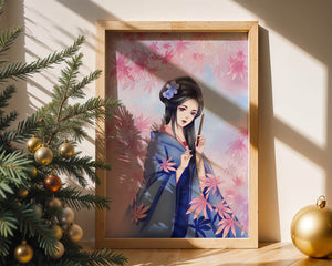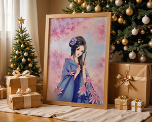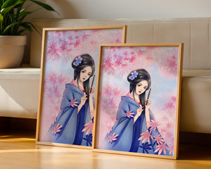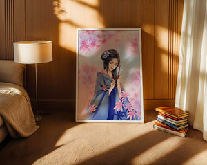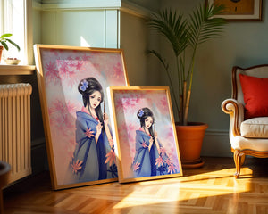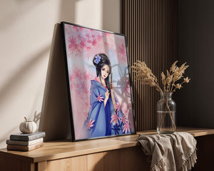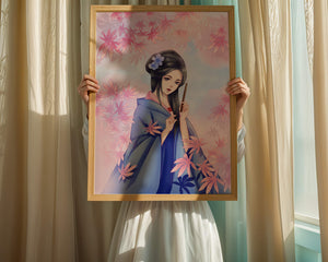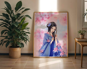 This captivating illustration features an elegant geisha adorned in a traditional blue kimono. Her serene expression and poised demeanor are accentuated by the gentle flutter of pink leaves surrounding her.The artwork beautifully captures the essence of Japanese culture through its delicate use of colors and floral elements. The blue and pink hues create a harmonious balance, making it an ideal piece for enhancing the aesthetic appeal of any living space. This illustration would be a tasteful addition to a living room or bedroom, providing both a cultural and artistic flair.