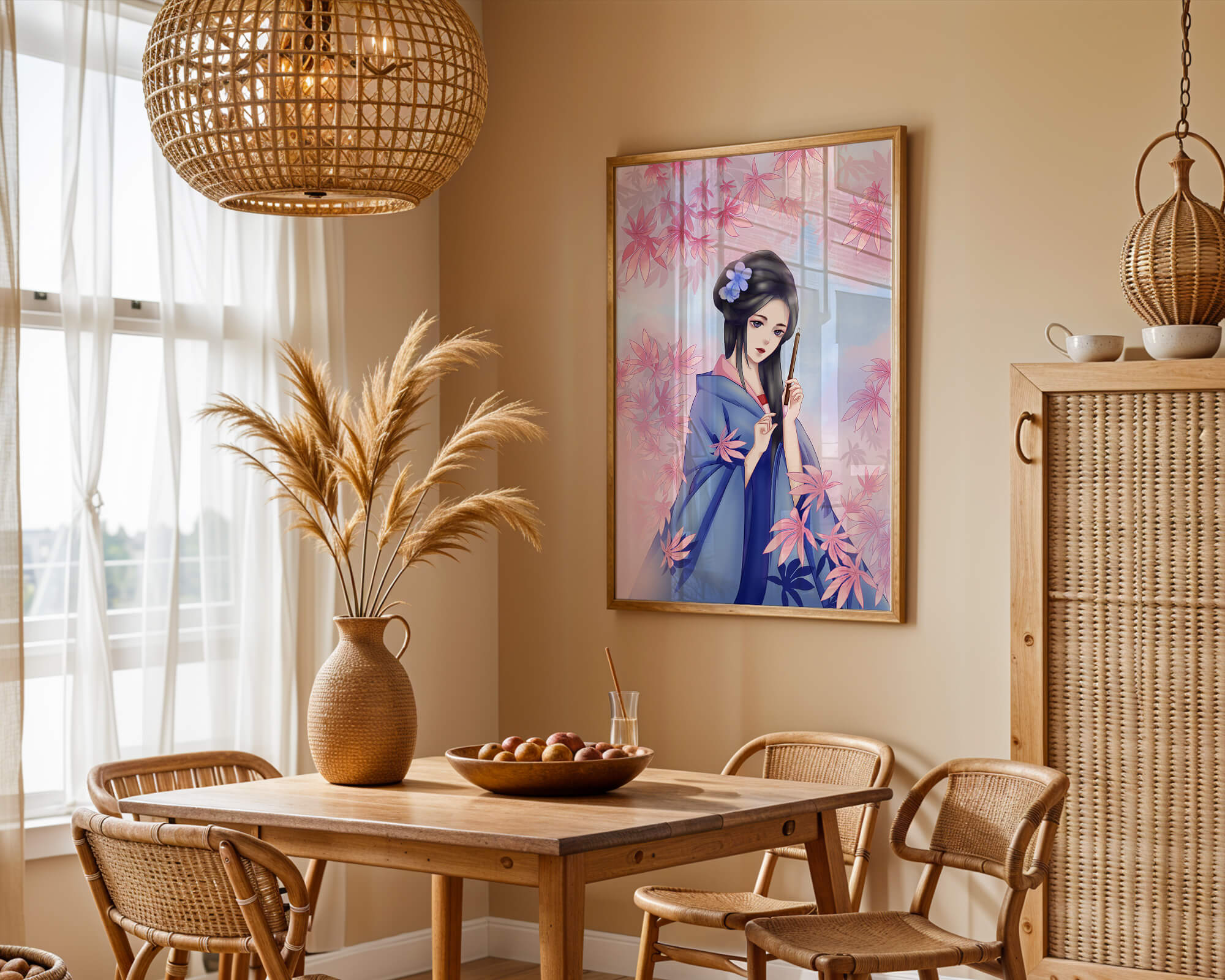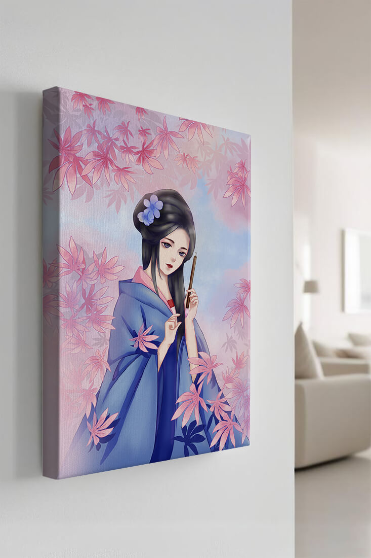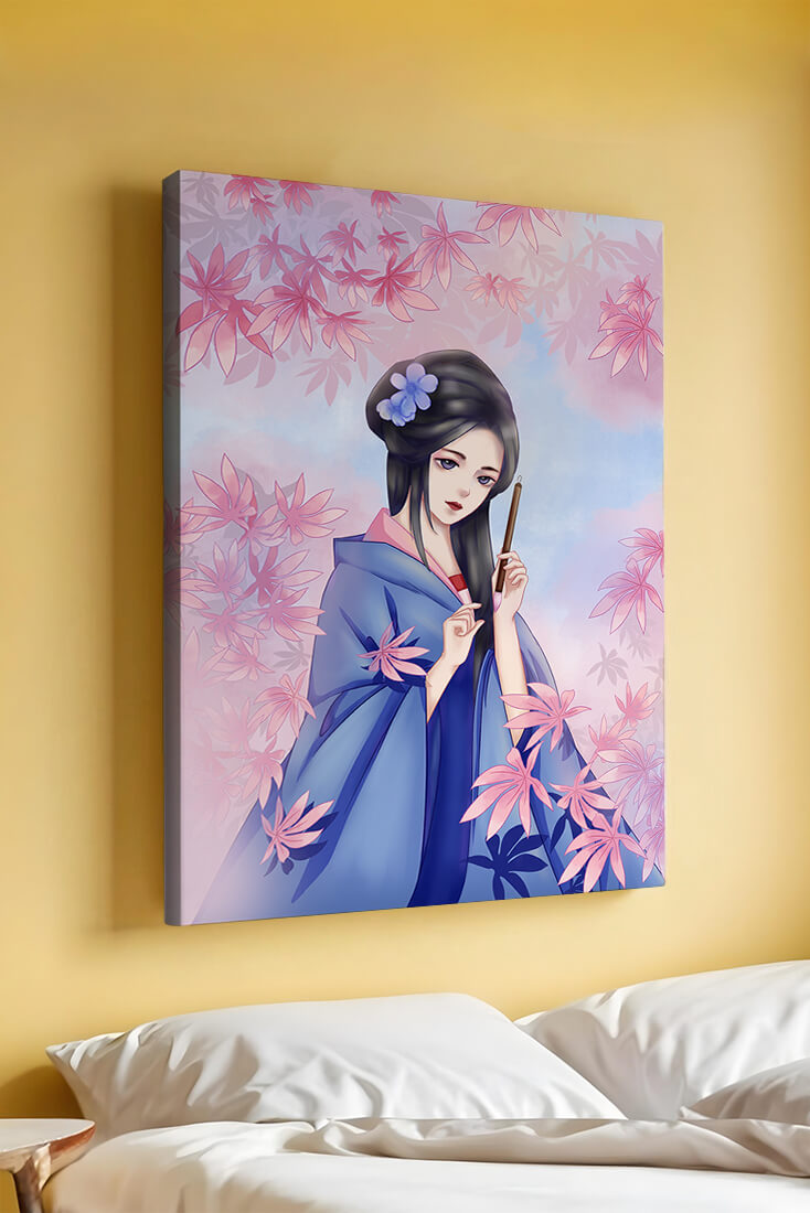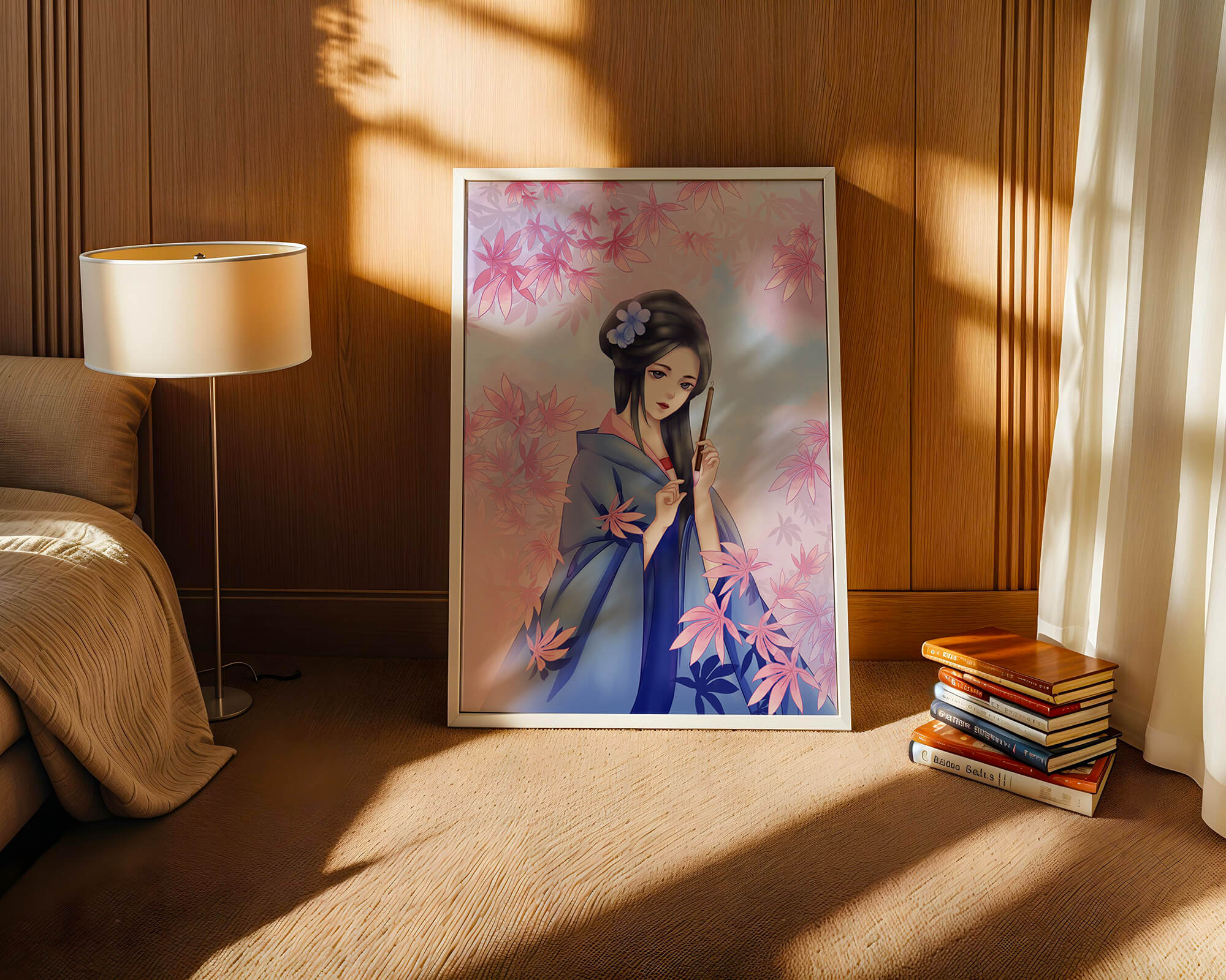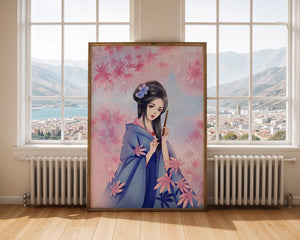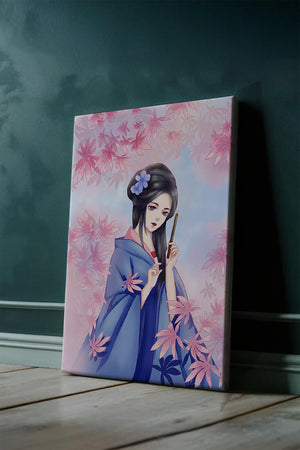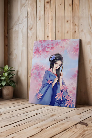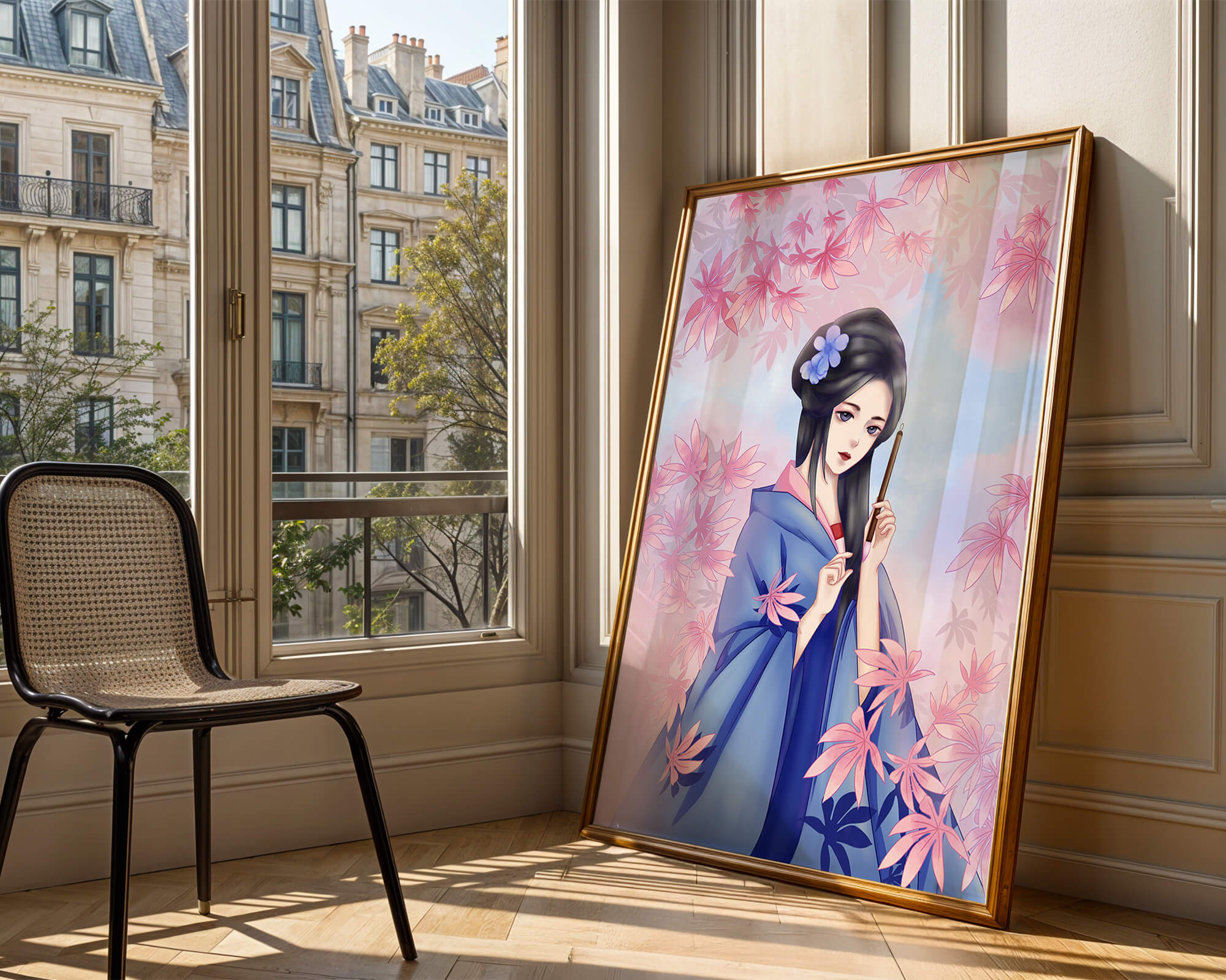 Home Elegant Geisha Illustration in Blue Kimono with Pink Leaves