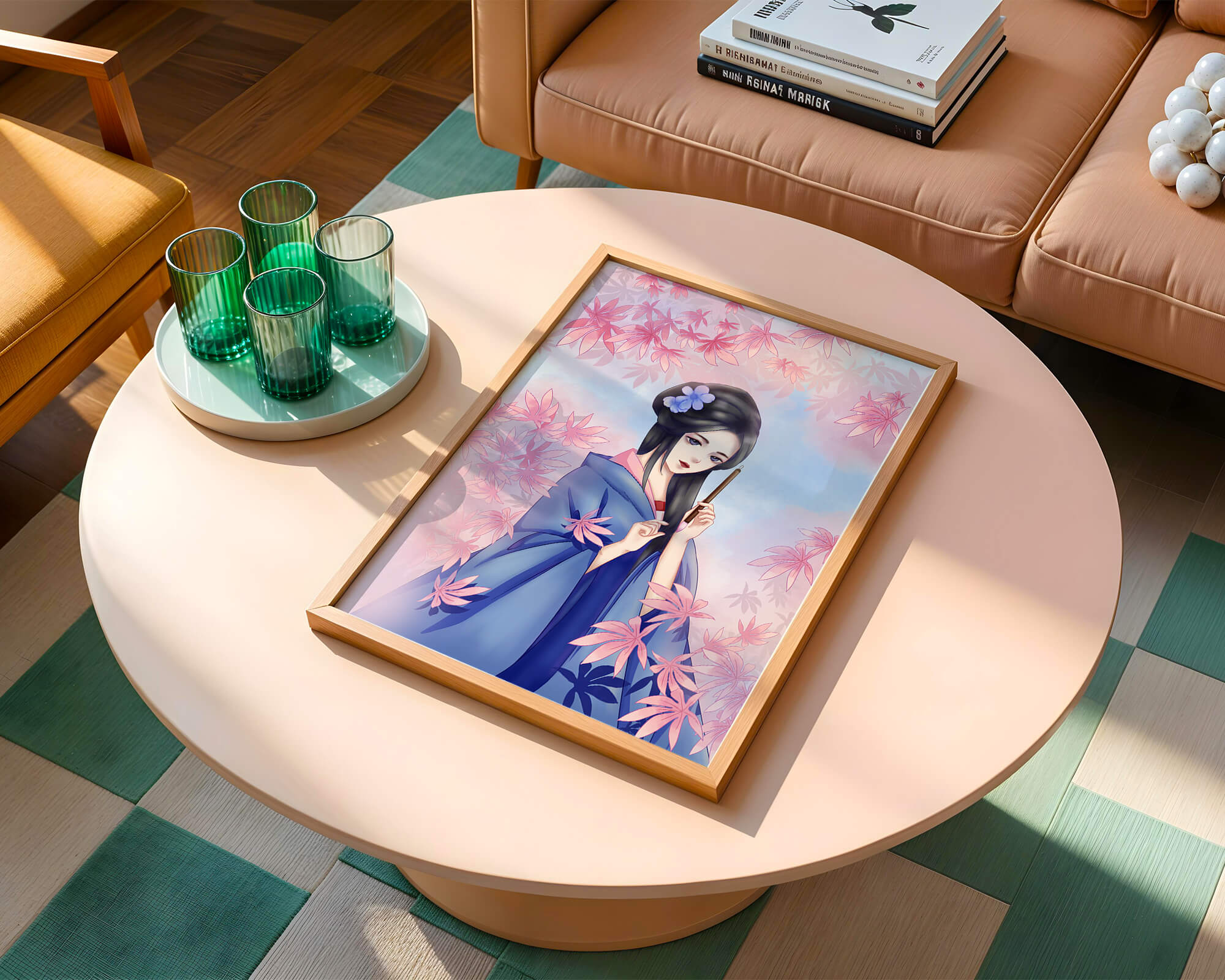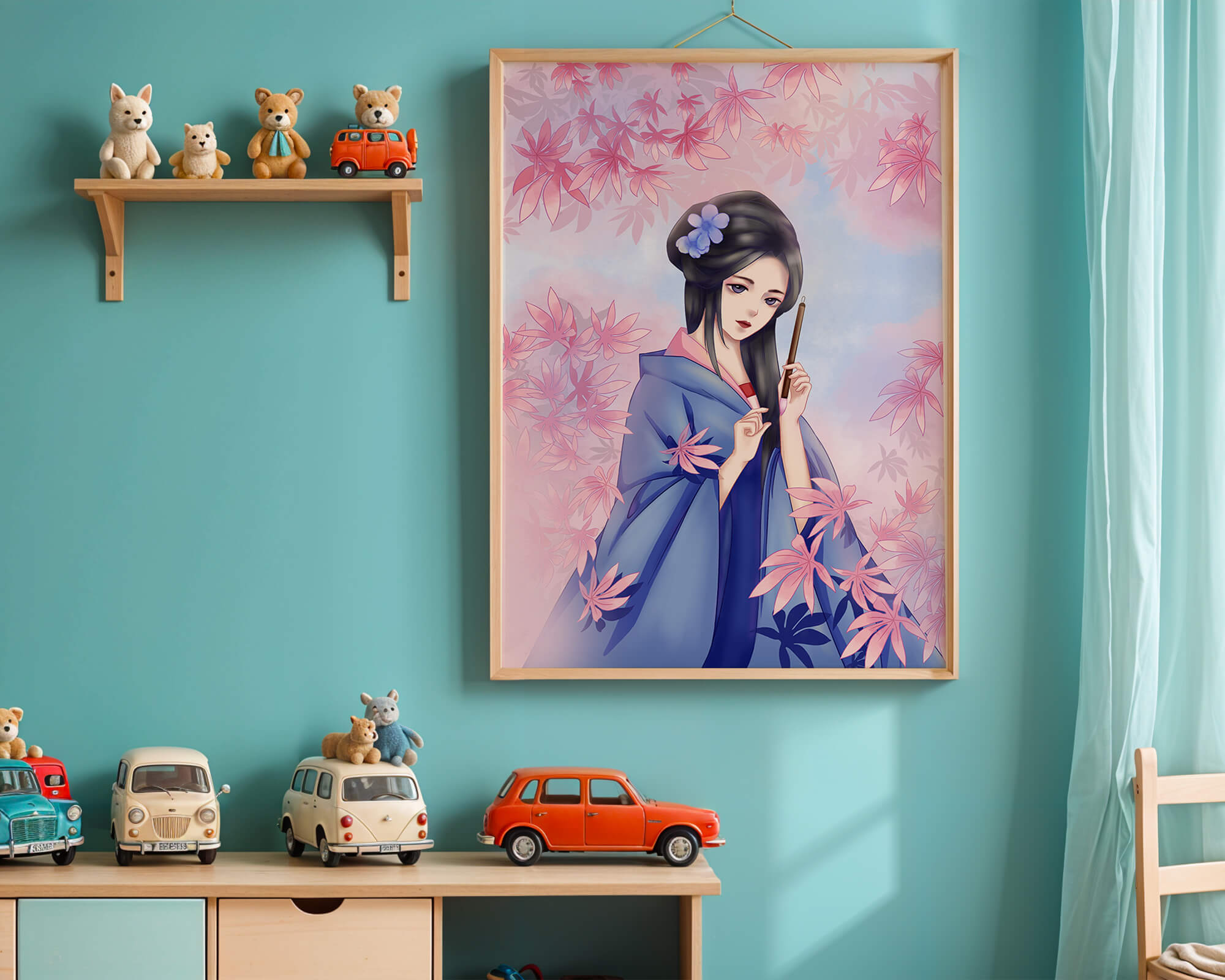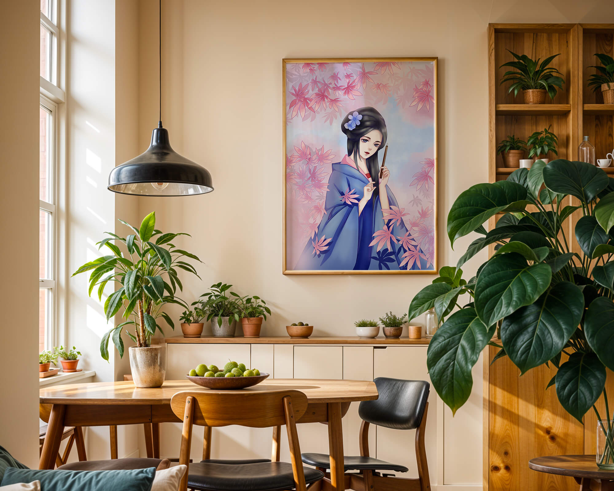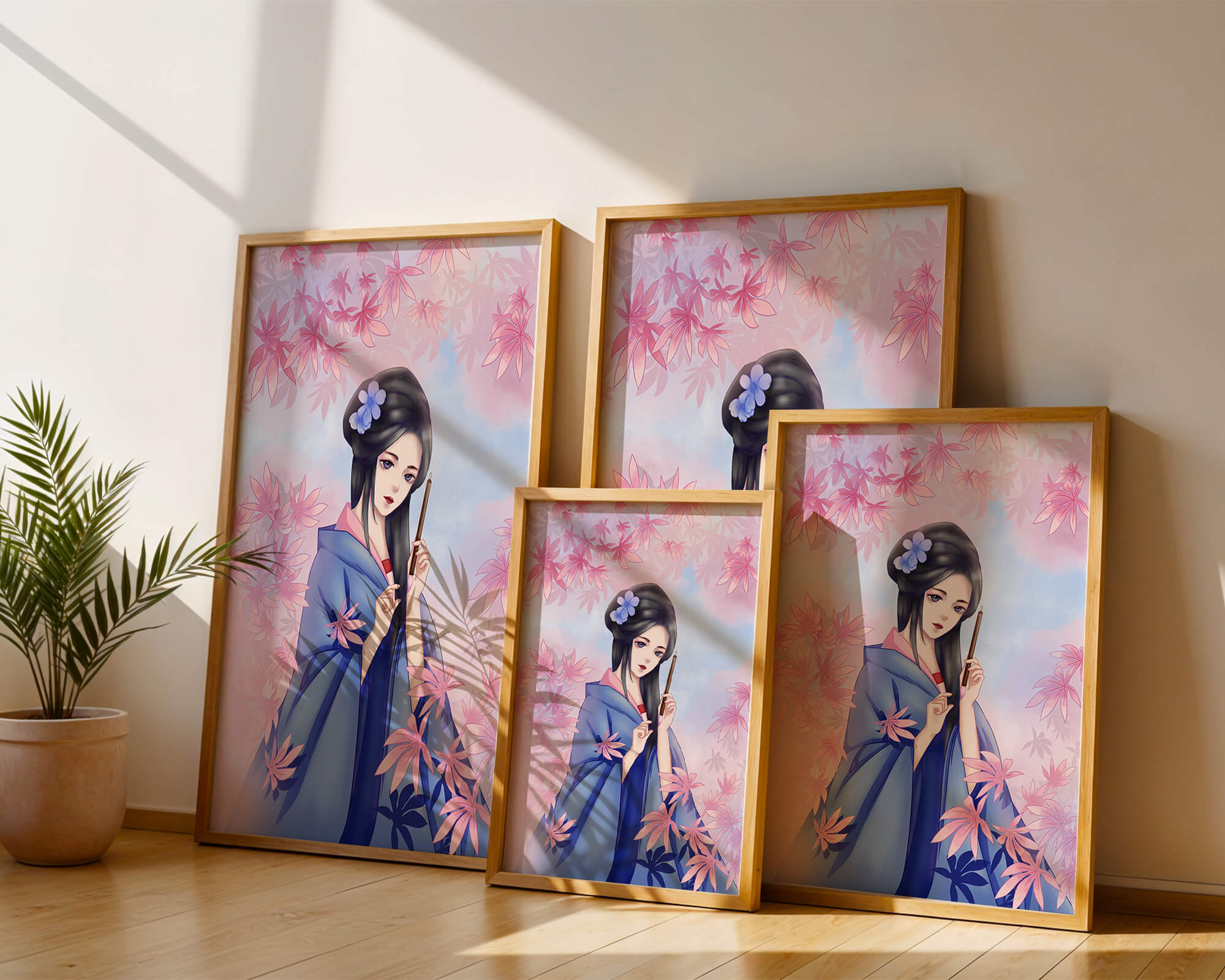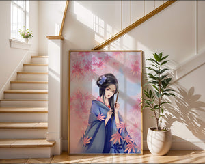 Home Elegant Geisha Illustration in Blue Kimono with Pink Leaves