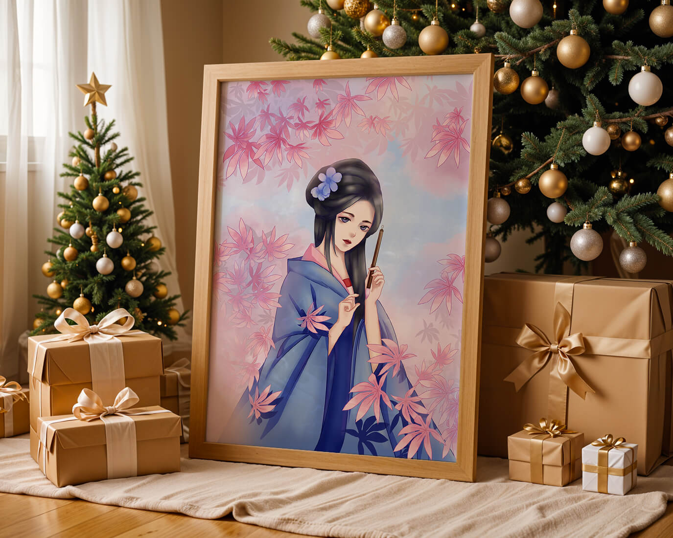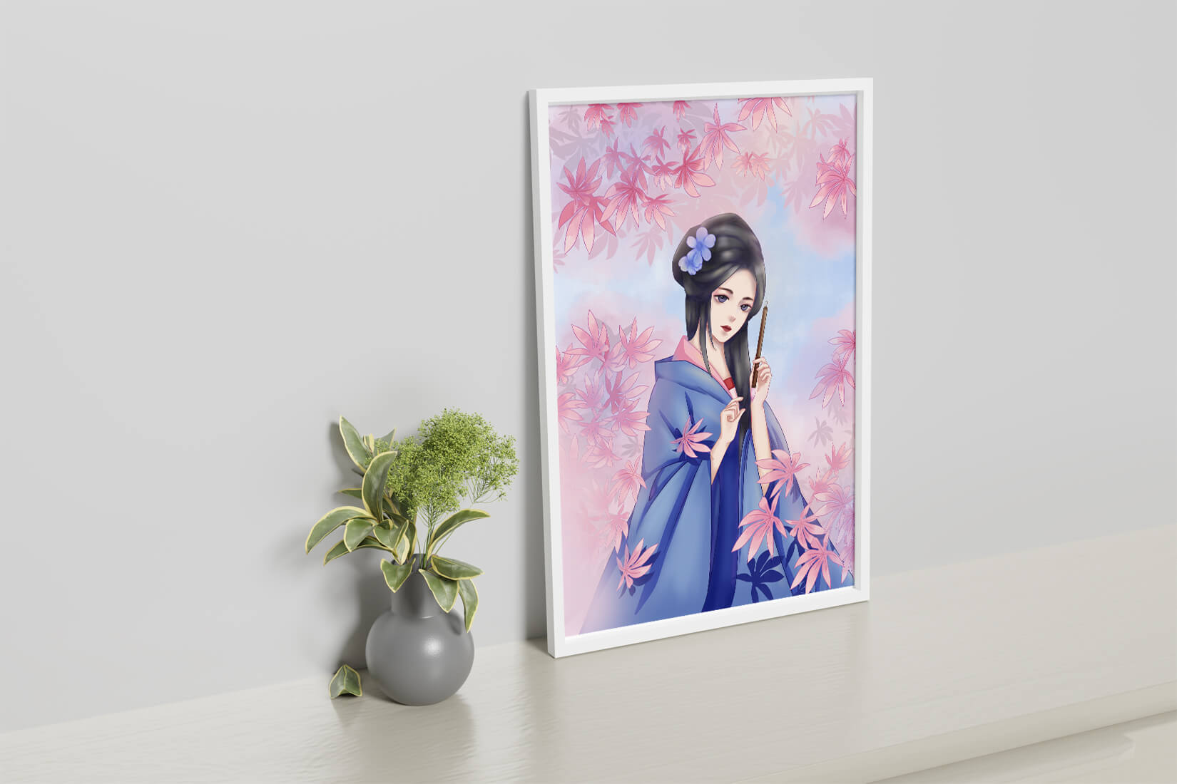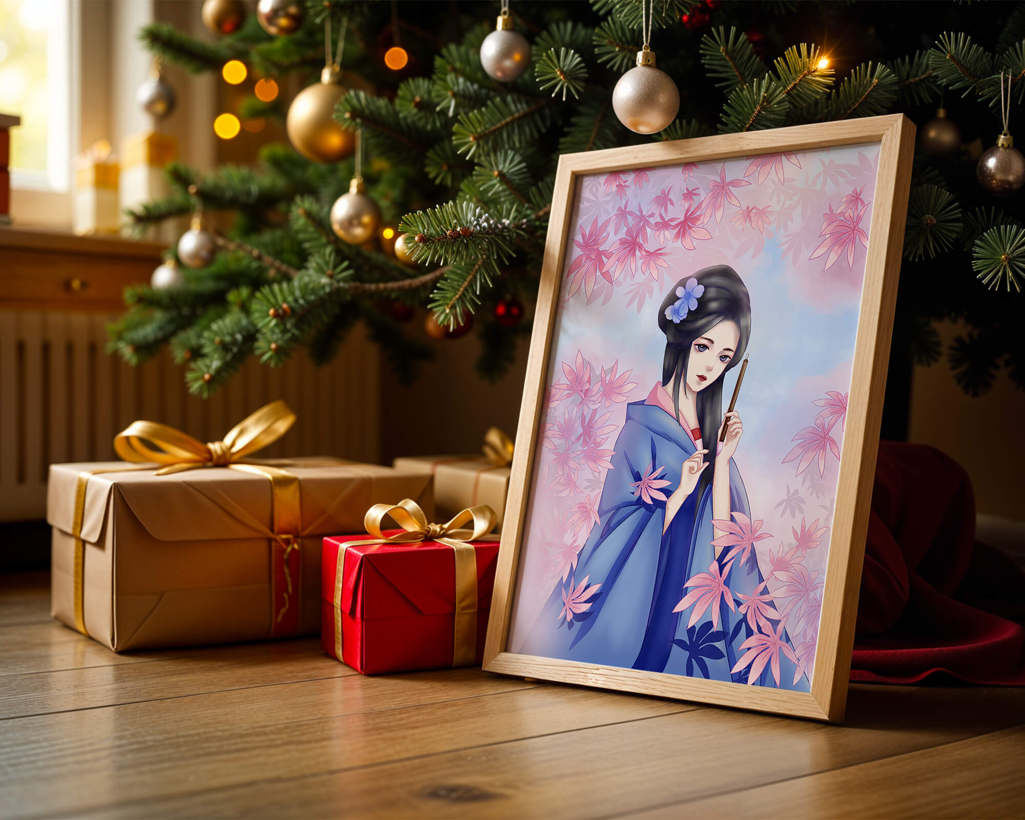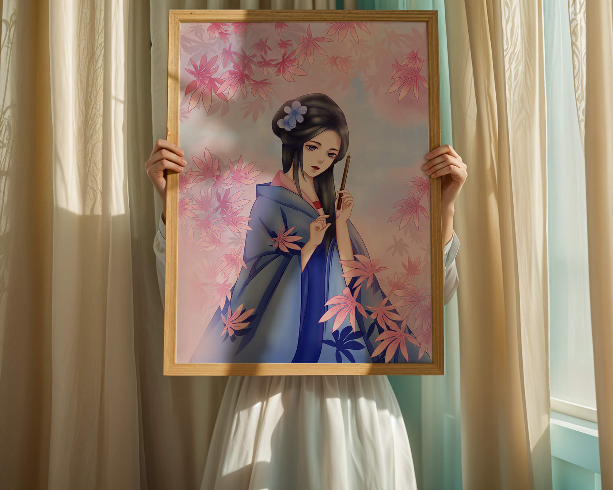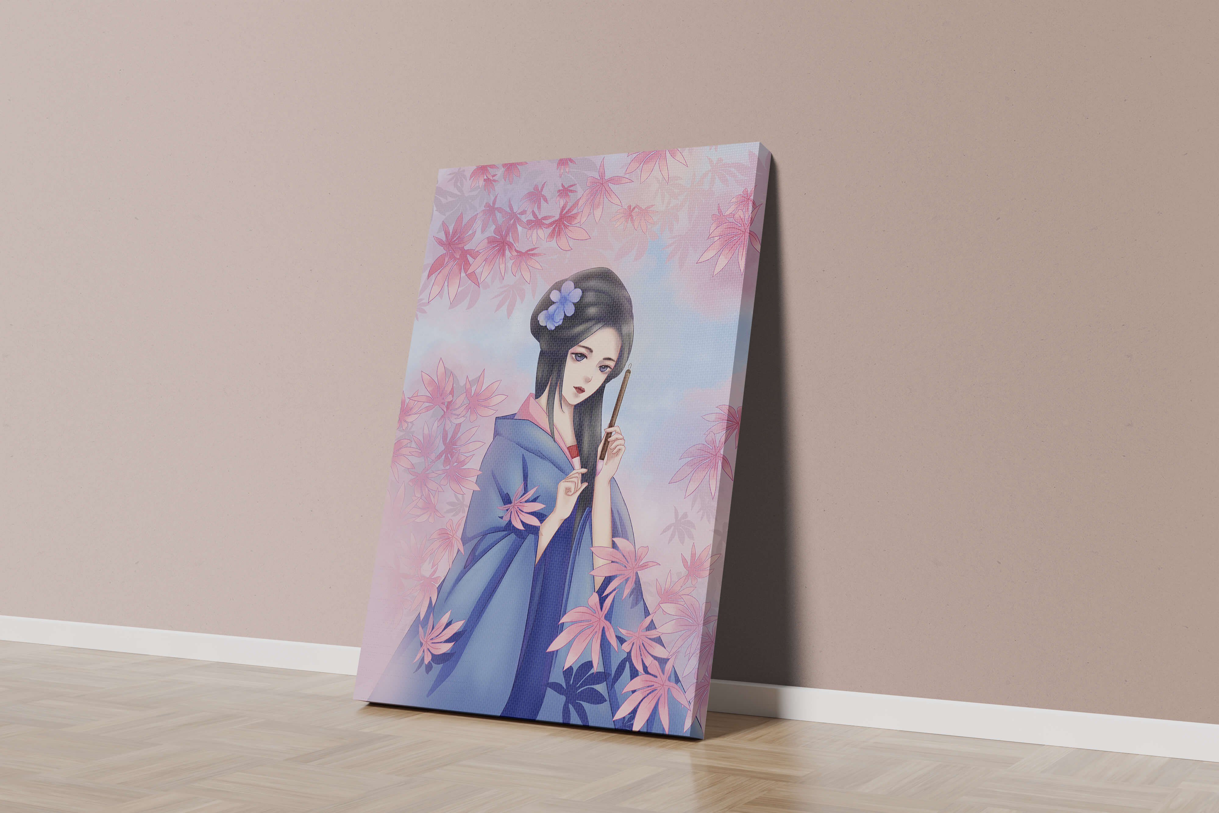 Home Elegant Geisha Illustration in Blue Kimono with Pink Leaves