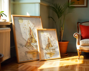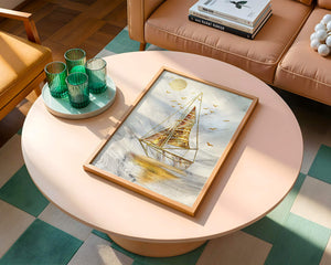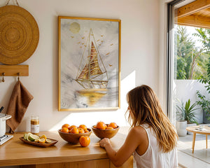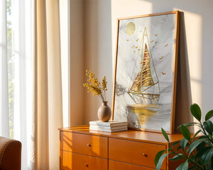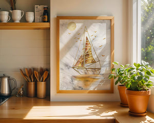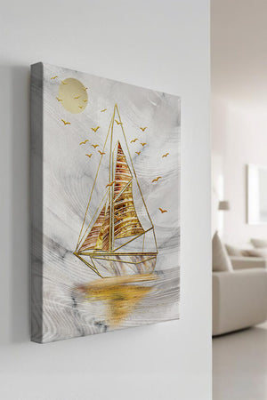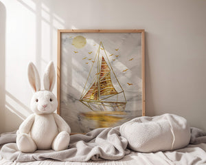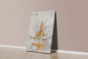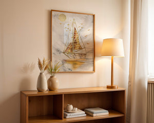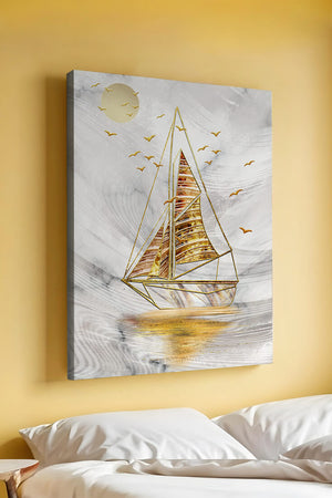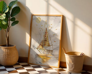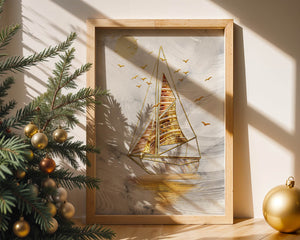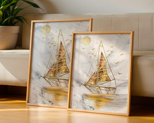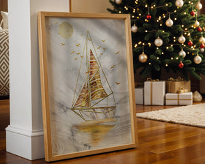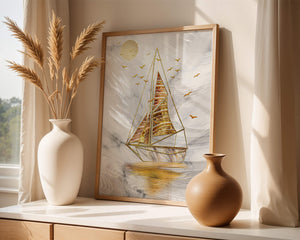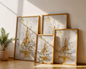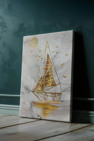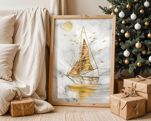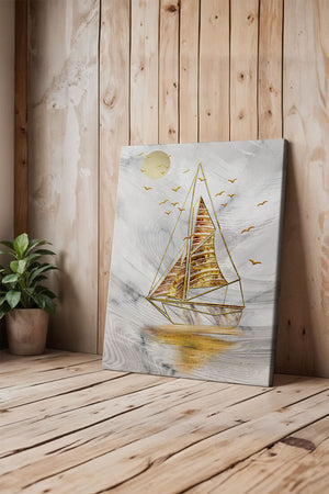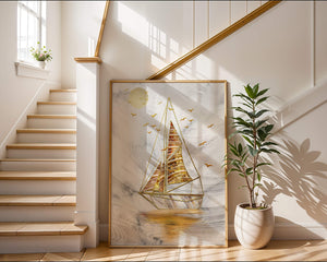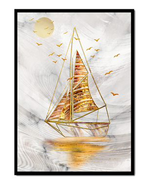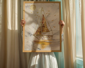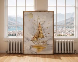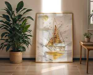 The main focus of the image is the cleverly designed sailboat, outlined in golden shimmering lines, evoking a sense of sophistication and elegance. Its sails and structure are artistically rendered with an abstract flair, reflecting imagination and creativity. Accompanied by a flock of golden birds flying in formation, the artwork captures a moment of peaceful navigation across the water.The backdrop is a swirling mixture of textures representing water and clouds, adding depth and dimension to the artwork. The refined golden accents reflect light beautifully, enhancing the overall aesthetic and creating a warm, inviting atmosphere. Perfect for spaces looking to add a touch of tranquility and luxury, this image speaks to those who appreciate both nautical themes and abstra| Type |