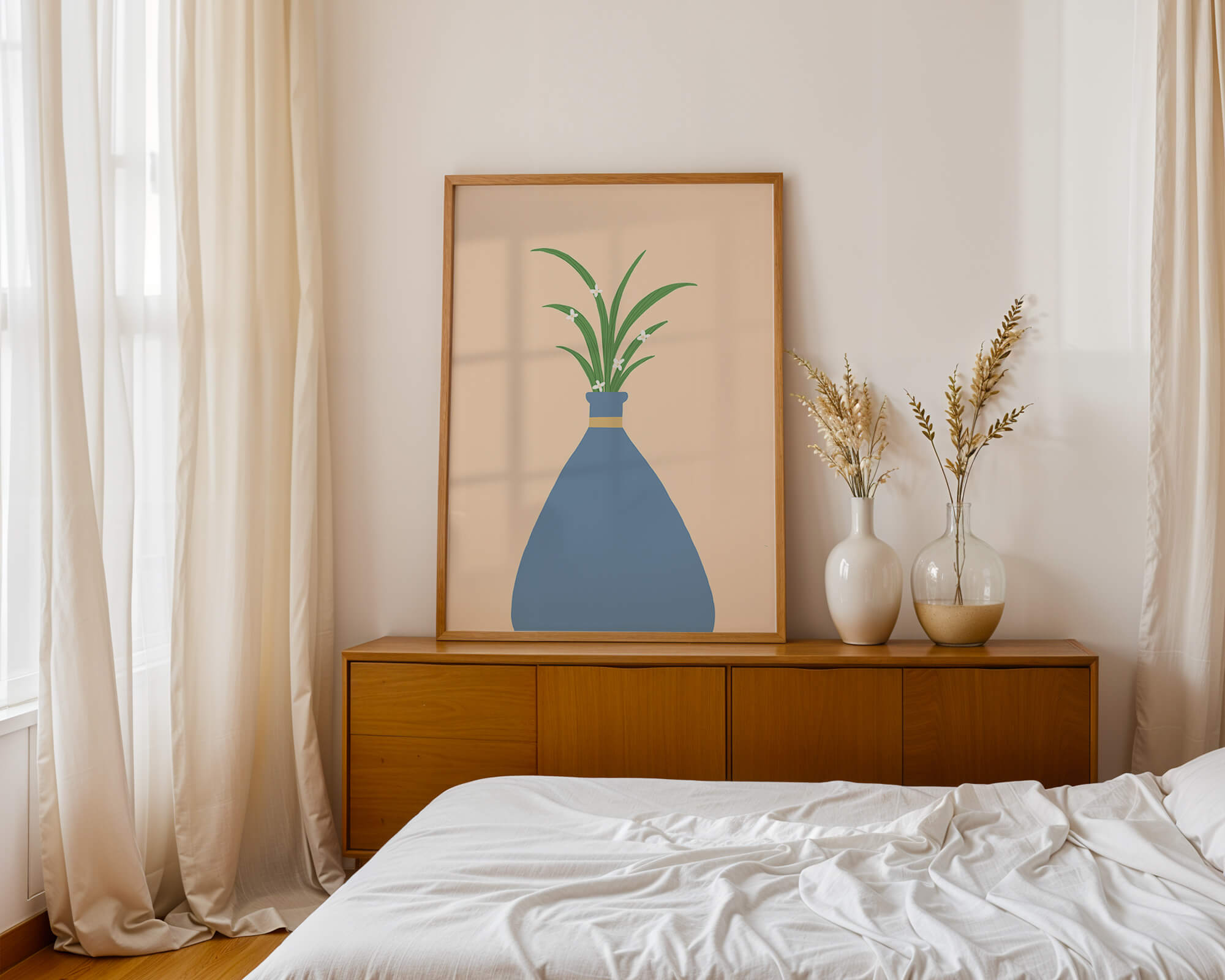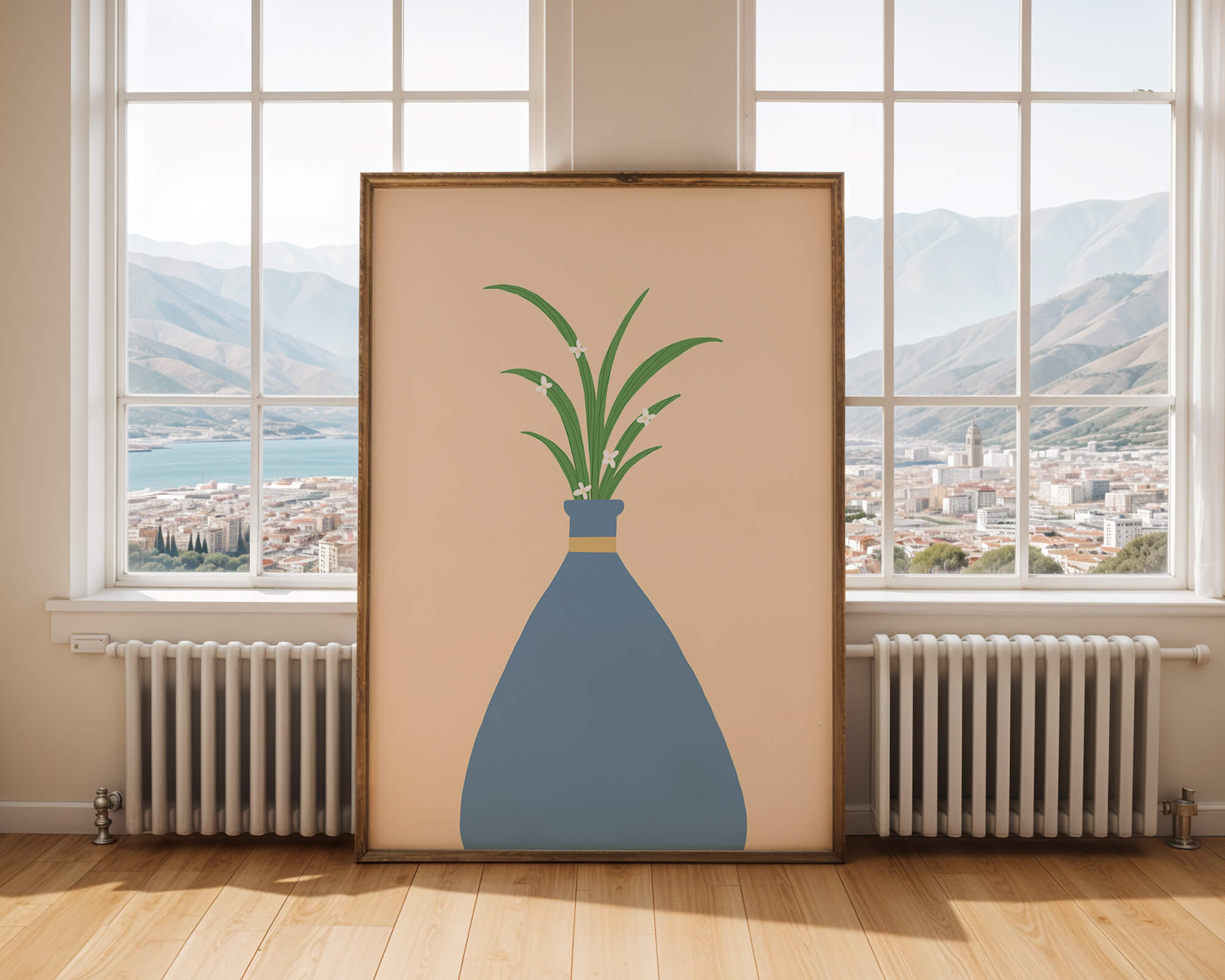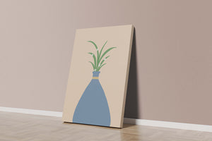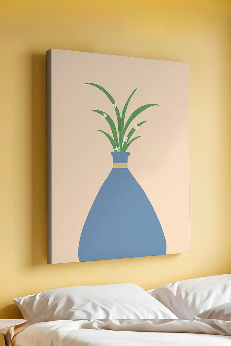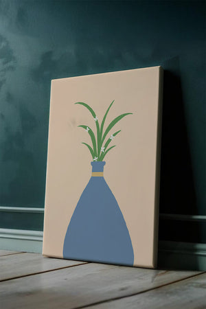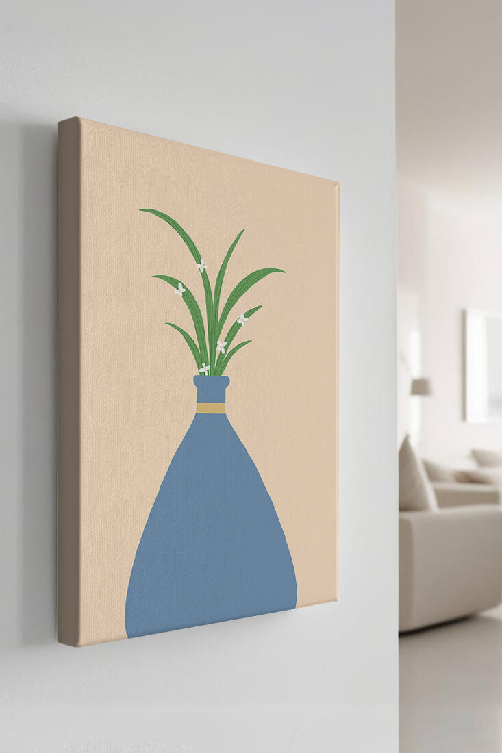 This piece features a simplistic yet elegant design of a vase with green foliage and delicate white flowers, set against a light background. The artwork embodies a minimalist style, perfect for enhancing any interior space.