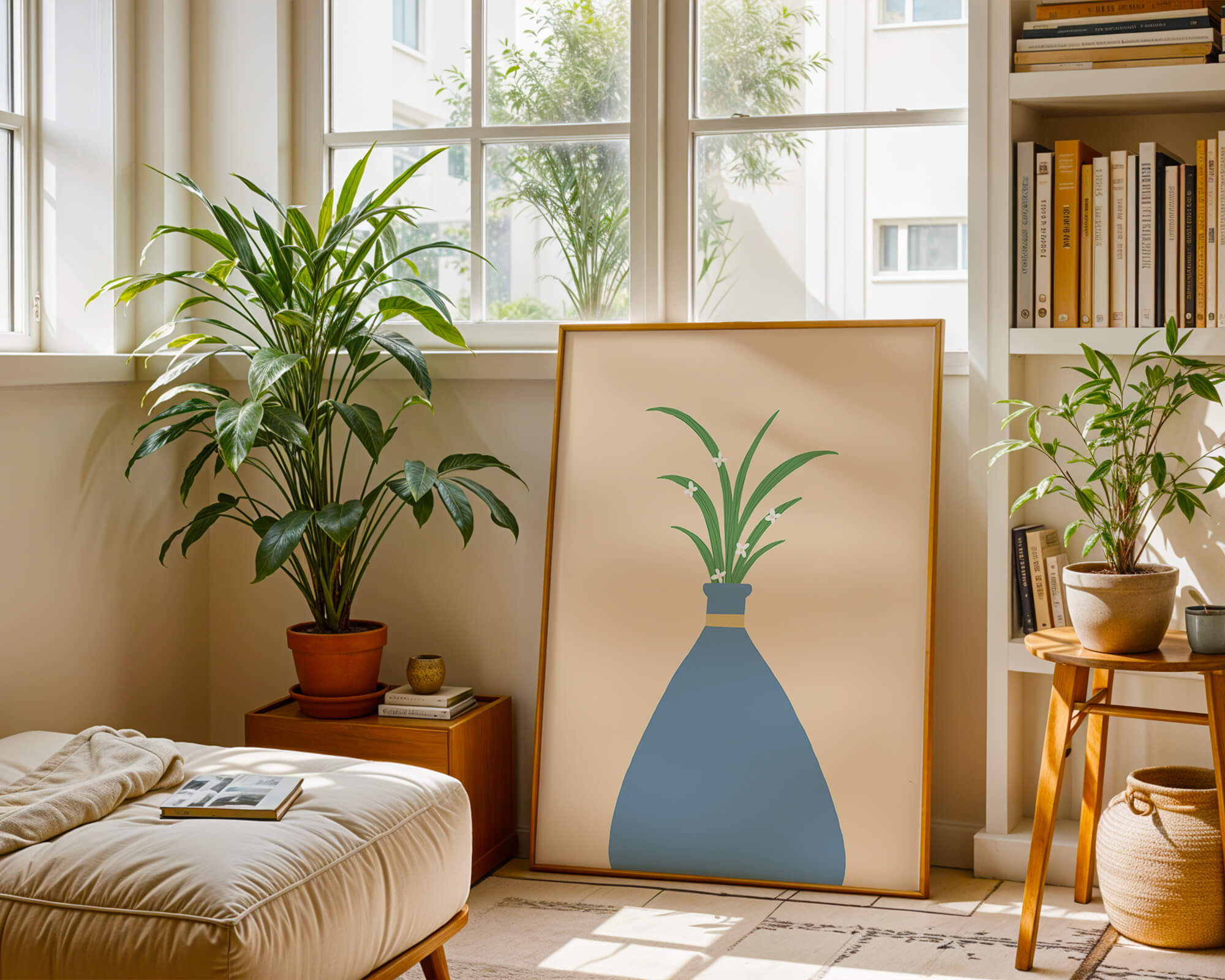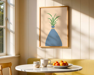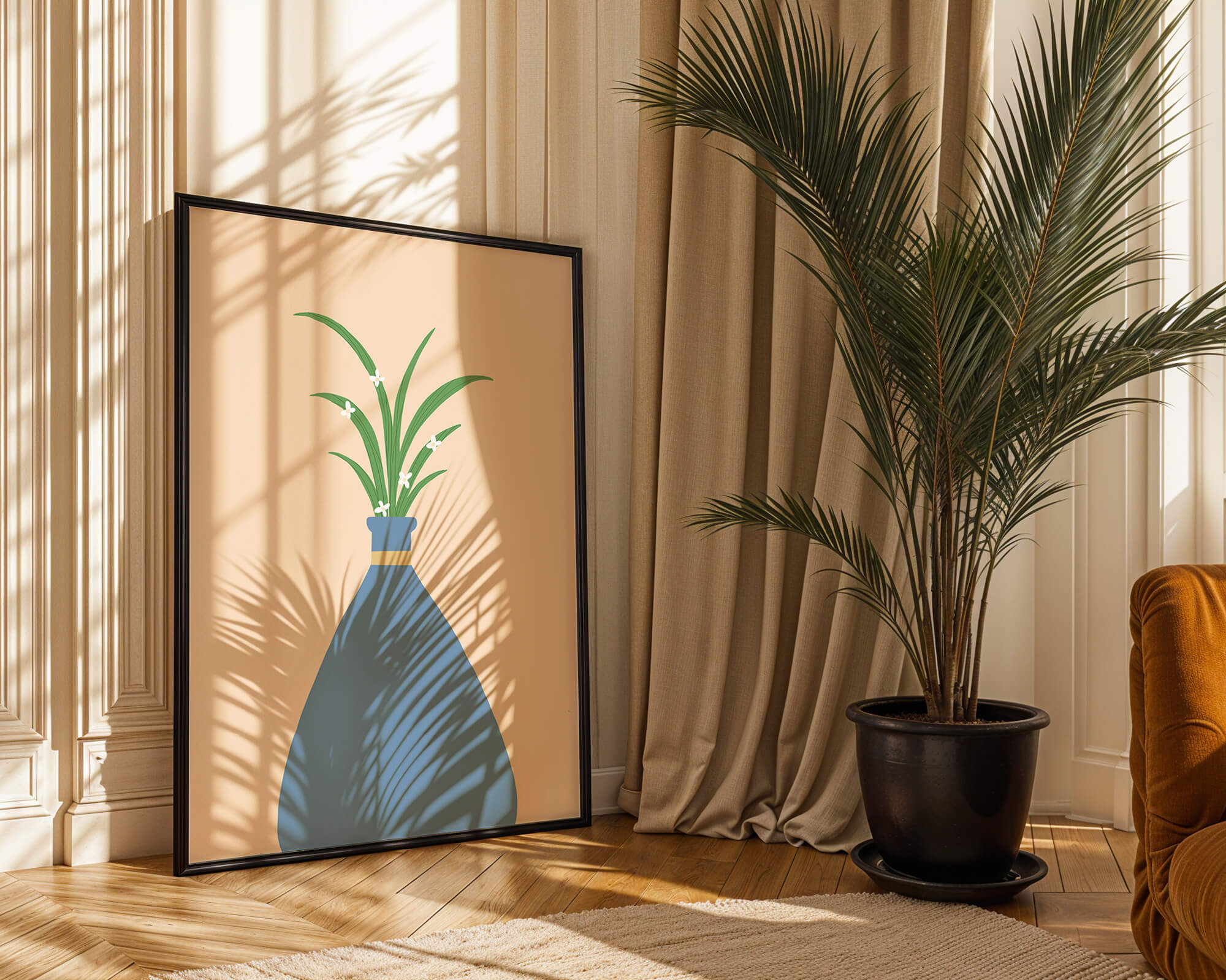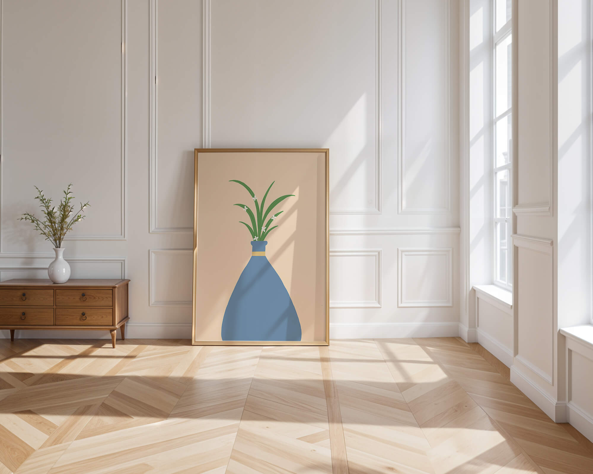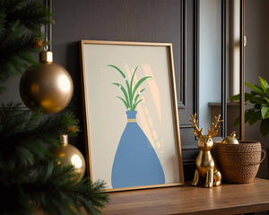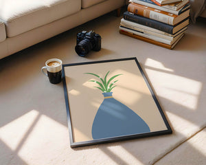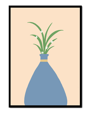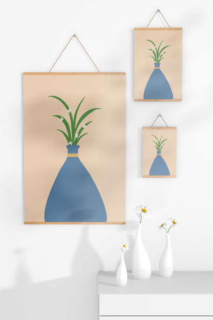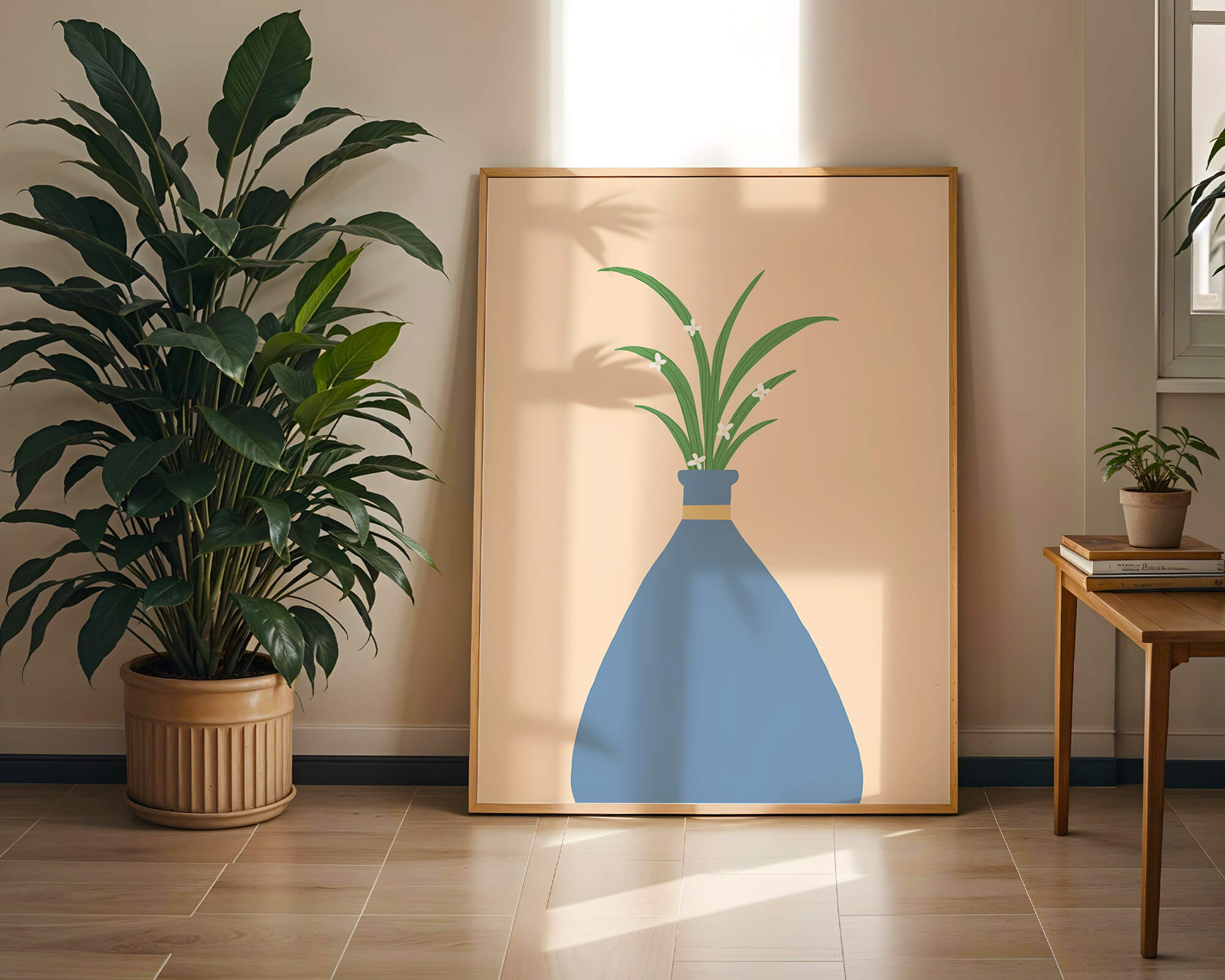 This piece features a simplistic yet elegant design of a vase with green foliage and delicate white flowers, set against a light background. The artwork embodies a minimalist style, perfect for enhancing any interior space.