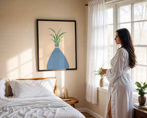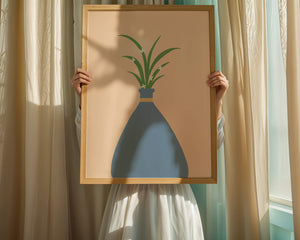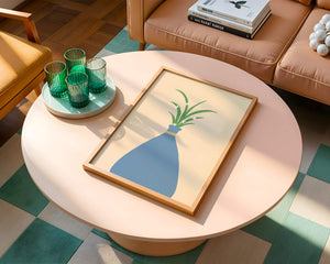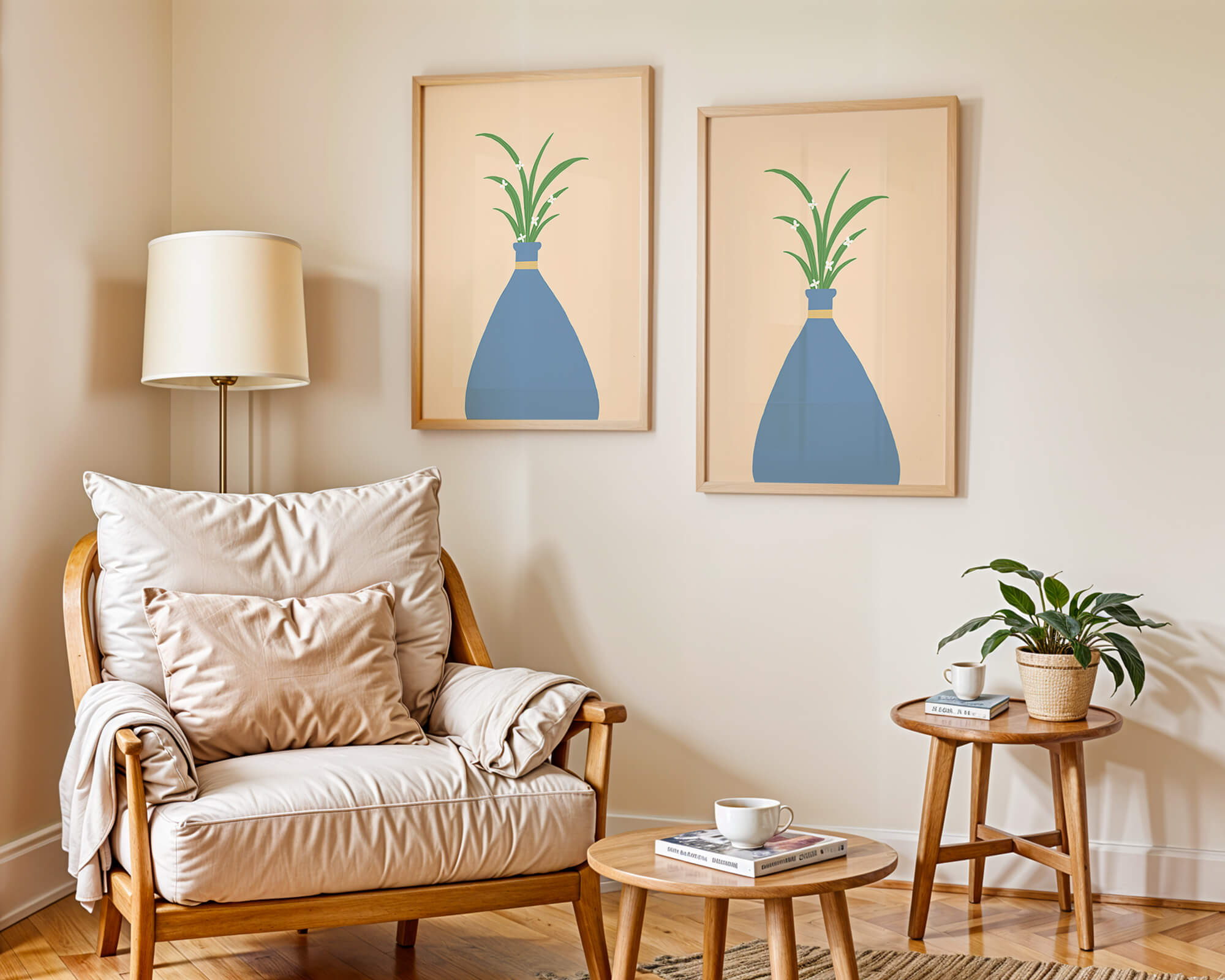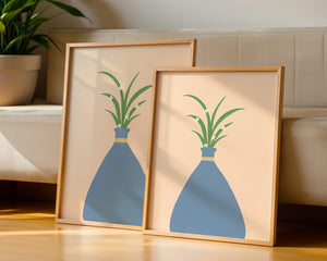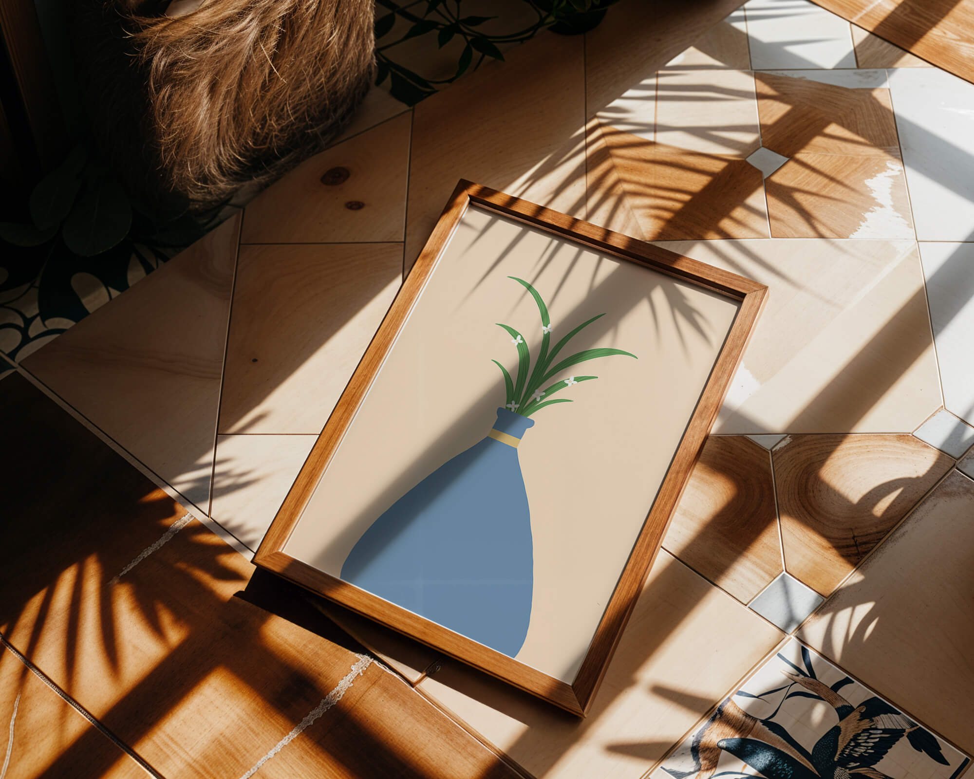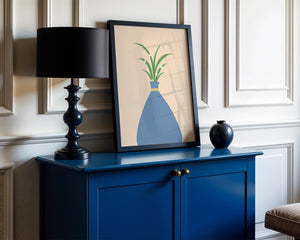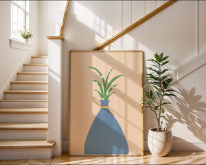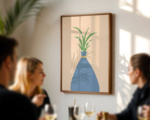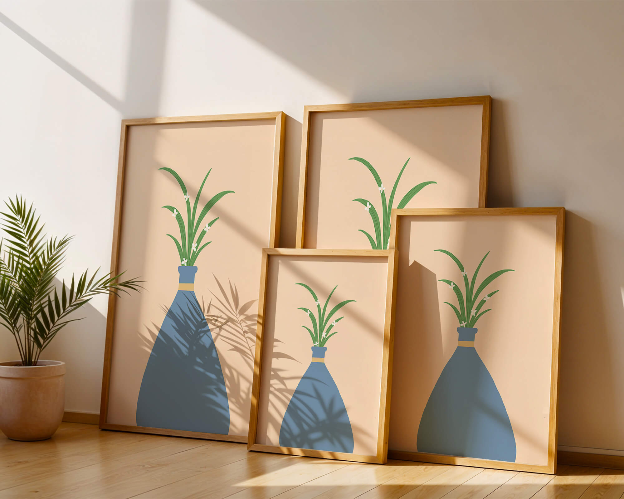 This piece features a simplistic yet elegant design of a vase with green foliage and delicate white flowers, set against a light background. The artwork embodies a minimalist style, perfect for enhancing any interior space.