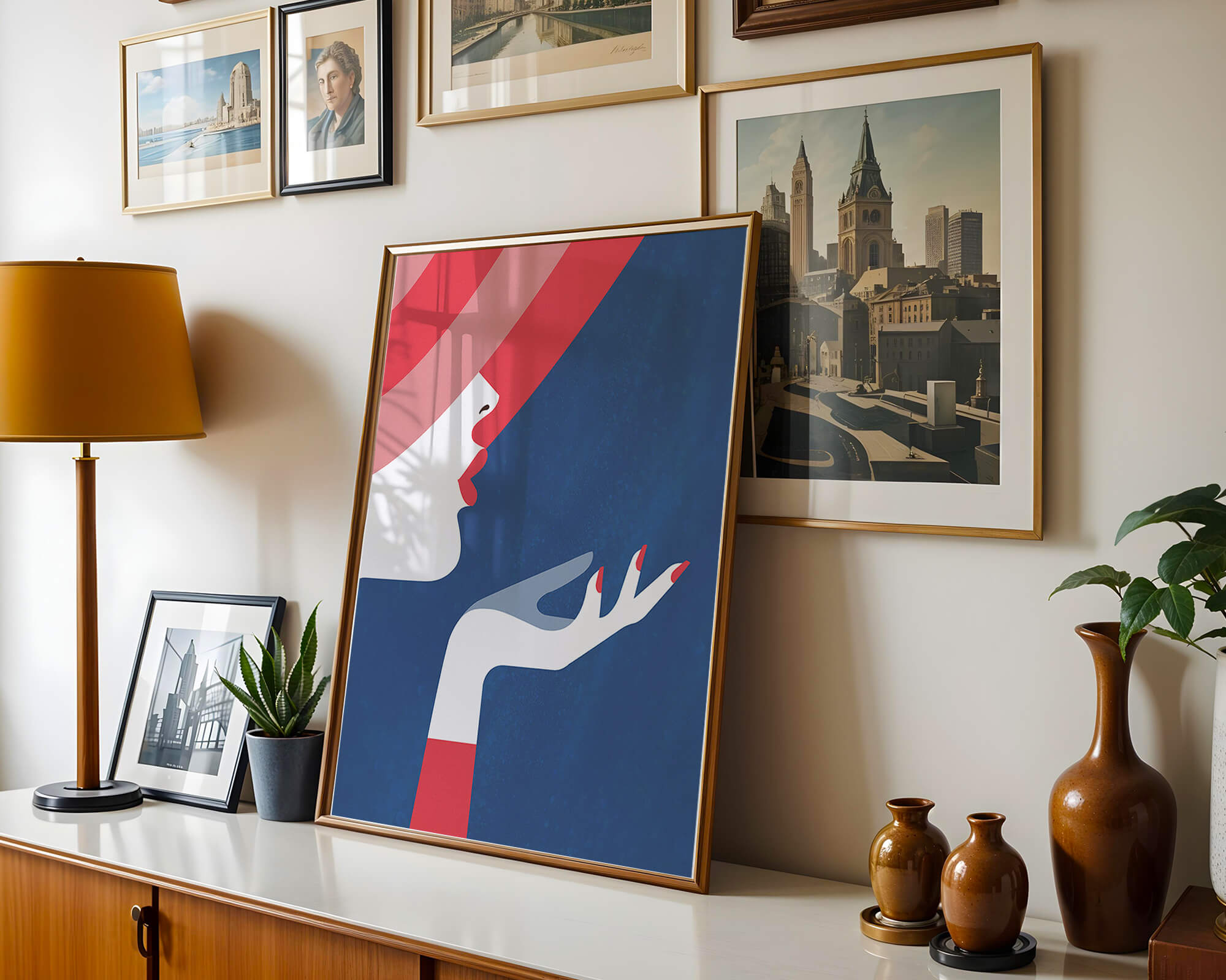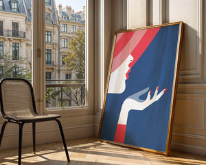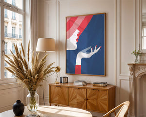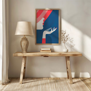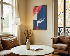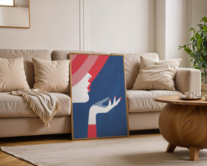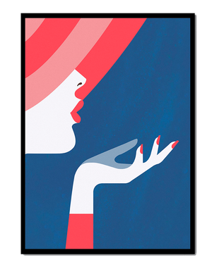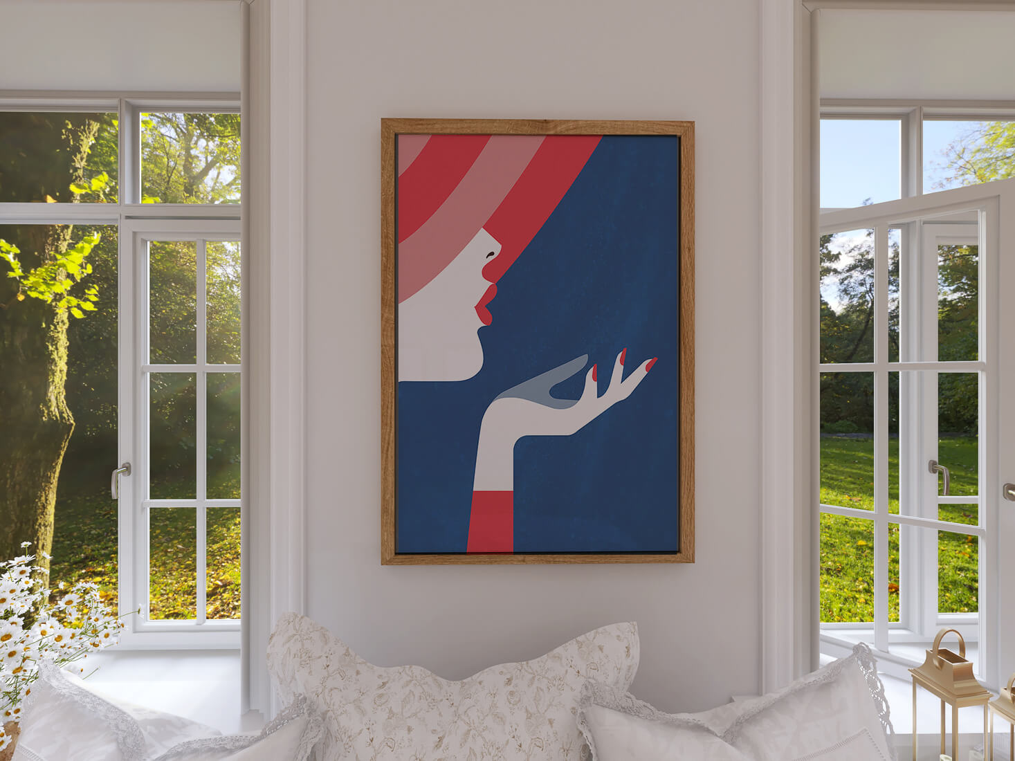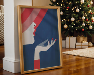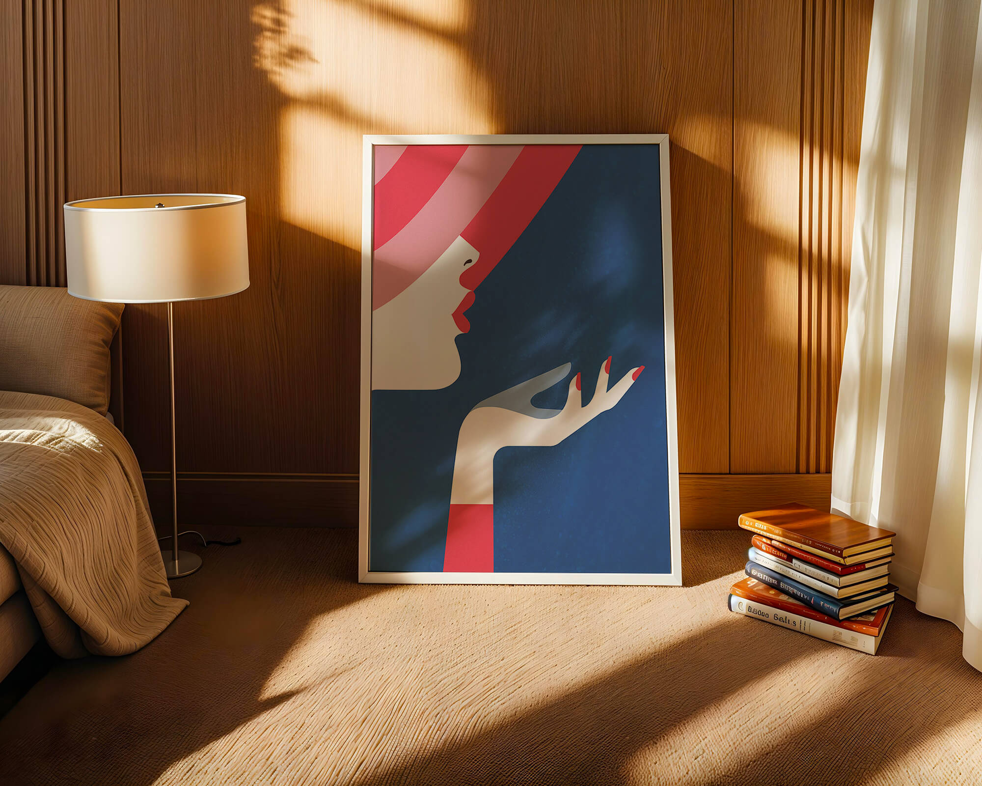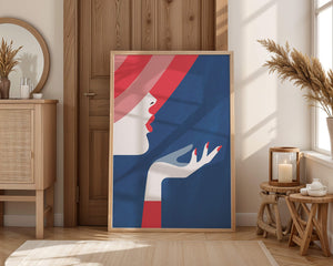 This artwork showcases a minimalist and sophisticated design, highlighting the graceful silhouette of a woman. The use of bold colors and clean lines in this piece reflects contemporary artistic trends. The red hues of the hat, lips, and nails contrast beautifully with the deep blue background, adding depth and intrigue to the composition.