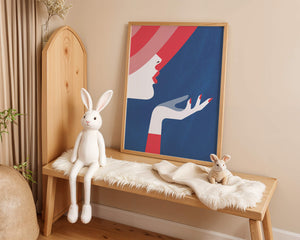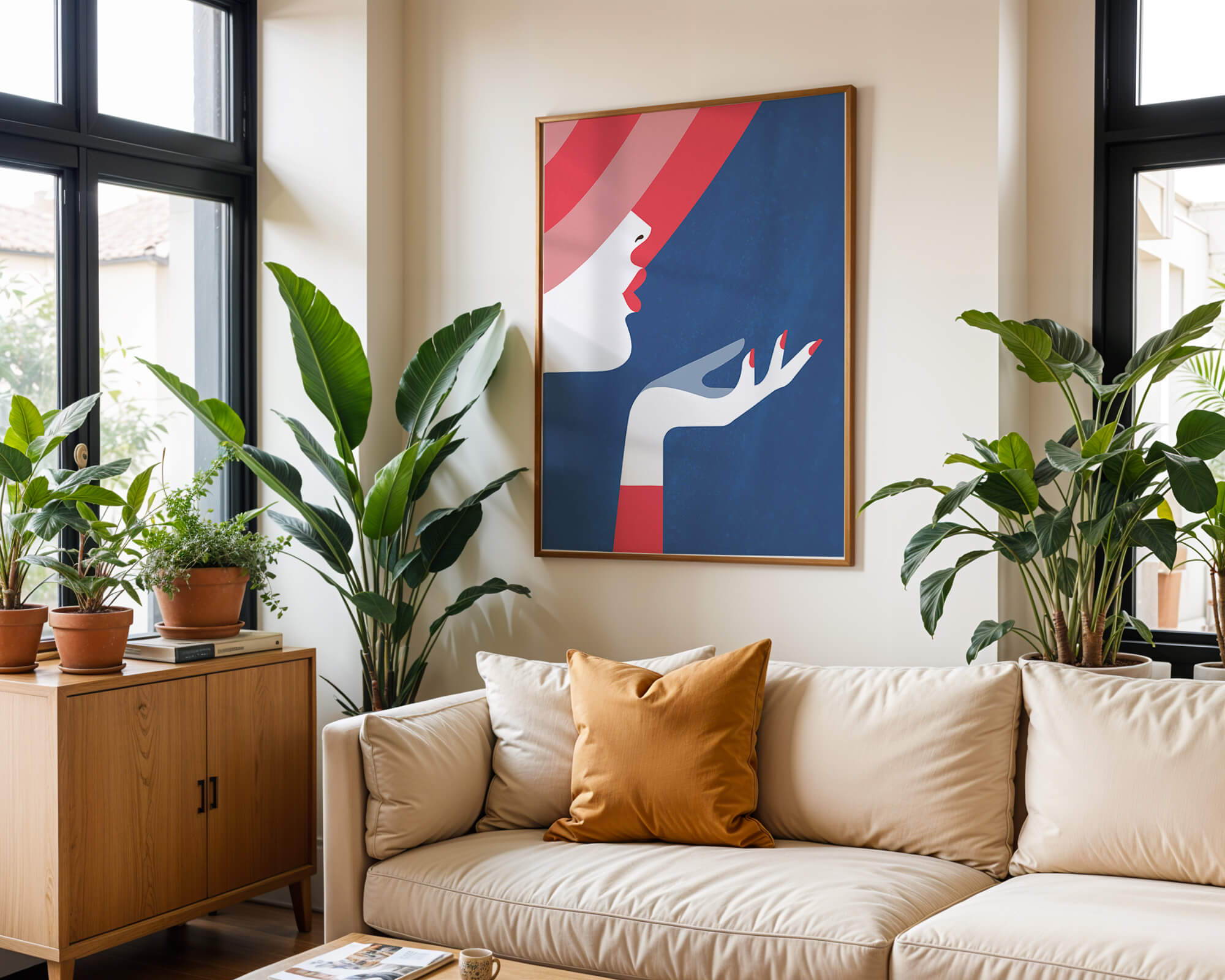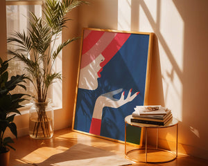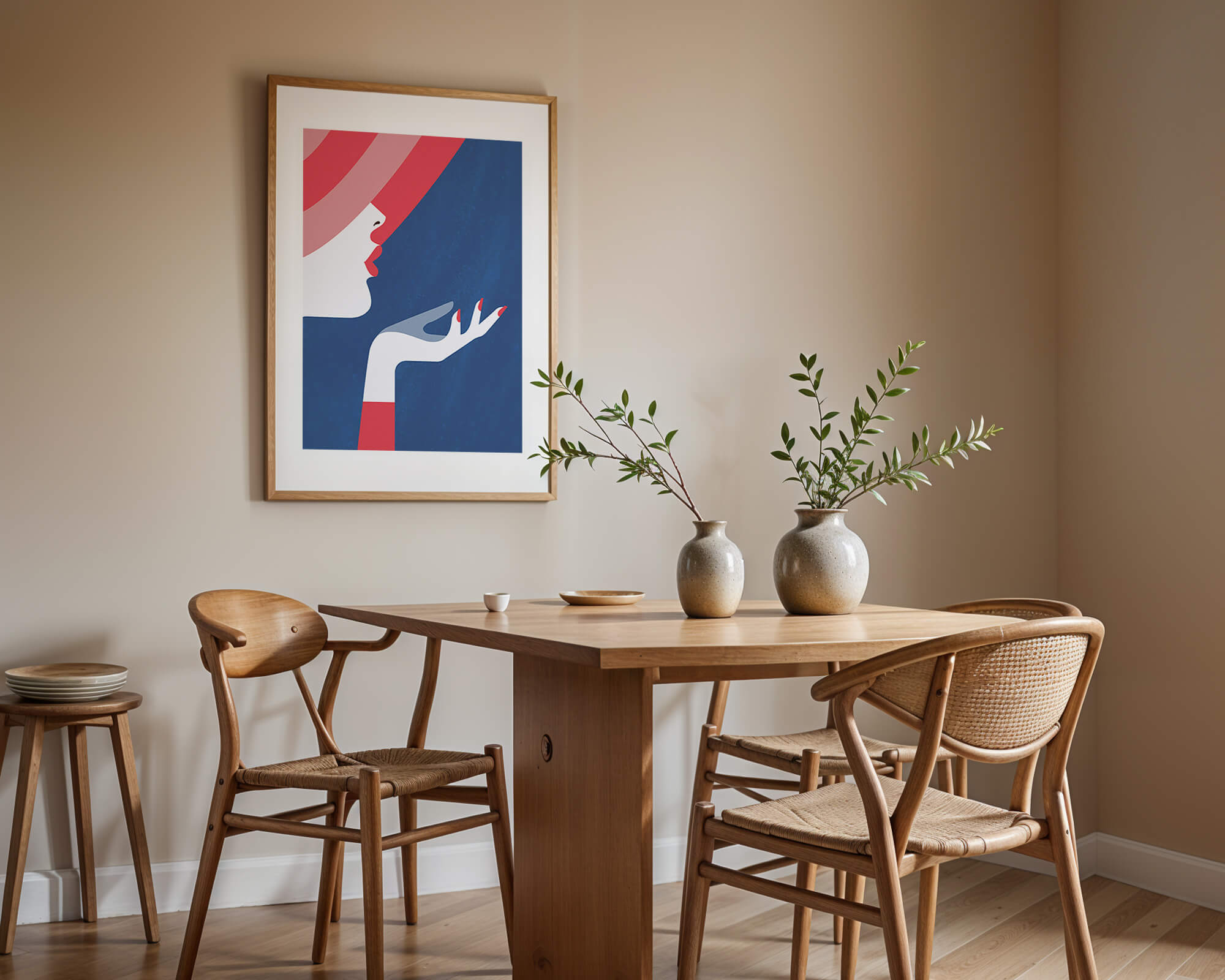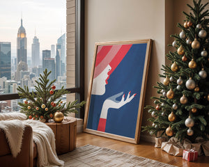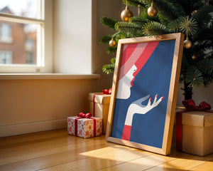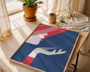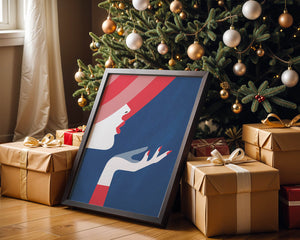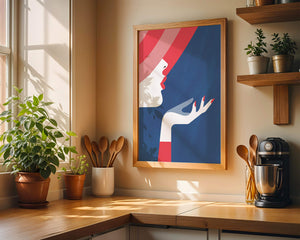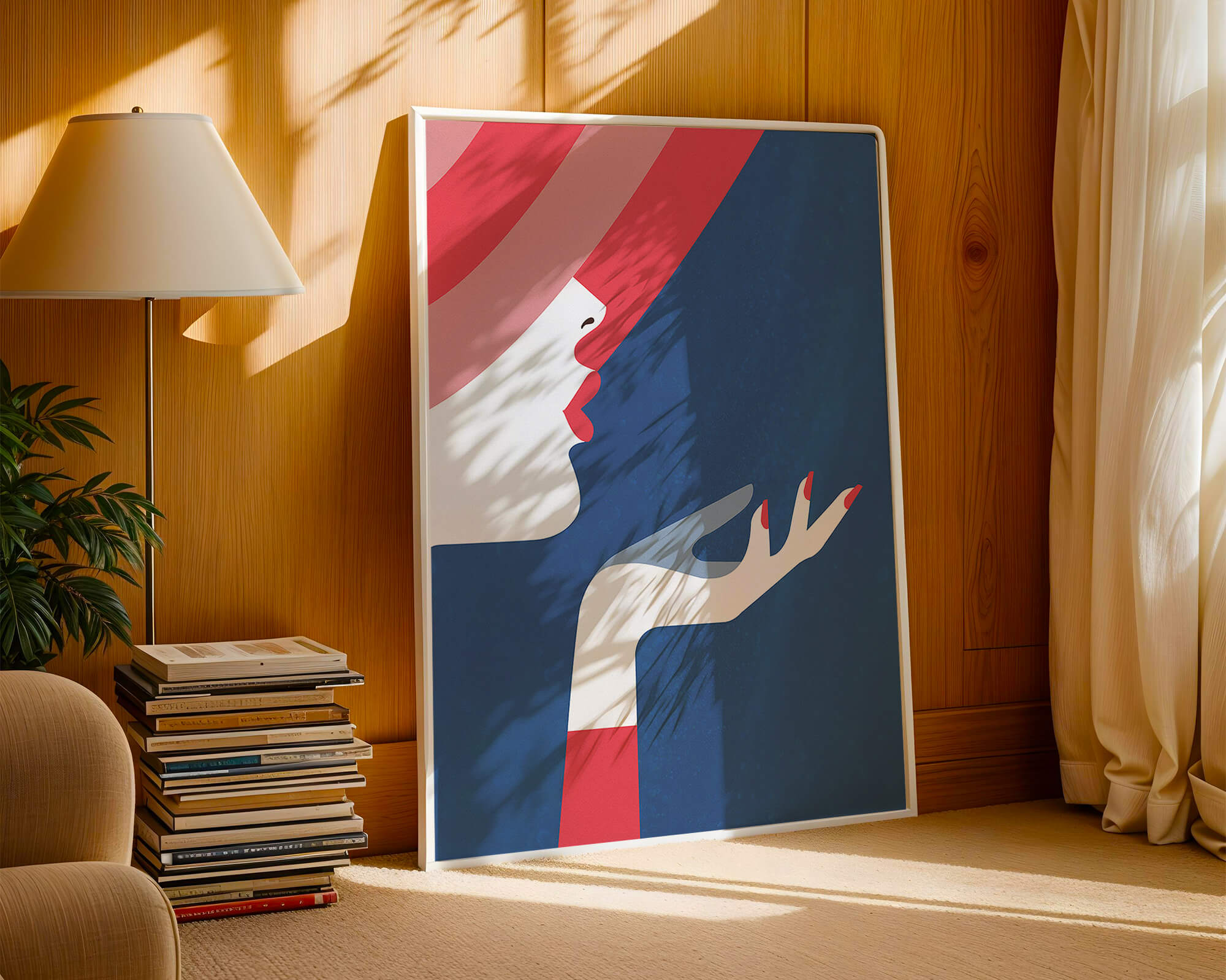 This artwork showcases a minimalist and sophisticated design, highlighting the graceful silhouette of a woman. The use of bold colors and clean lines in this piece reflects contemporary artistic trends. The red hues of the hat, lips, and nails contrast beautifully with the deep blue background, adding depth and intrigue to the composition.