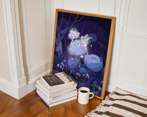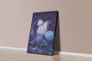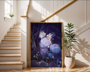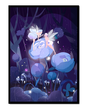 Nestled within a mystical forest, two ethereal fairies engage in a gentle conversation as they perch on luminescent blue flowers. The scene is bathed in soft shades of blue and purple, creating an otherworldly ambiance that beckons the imagination.