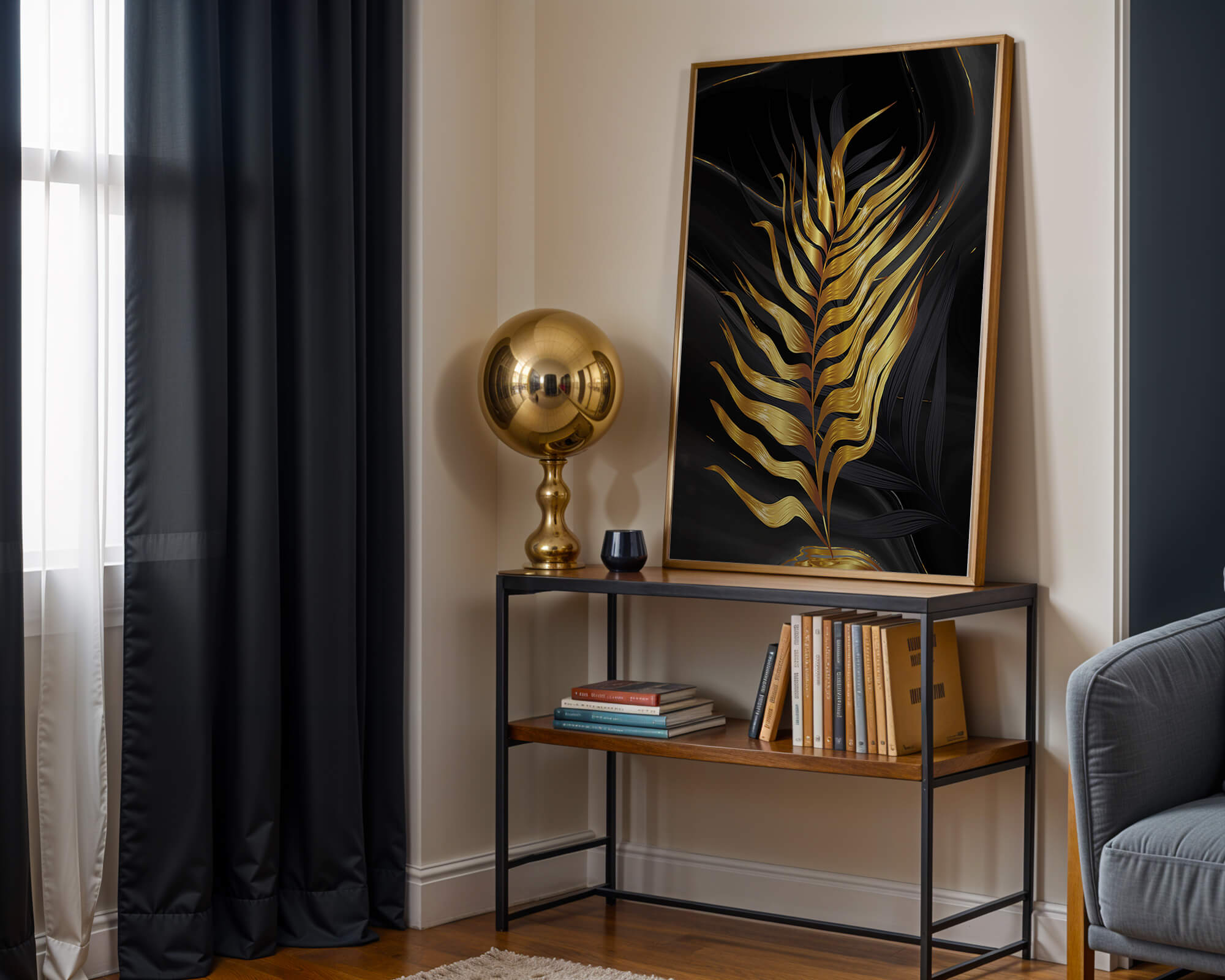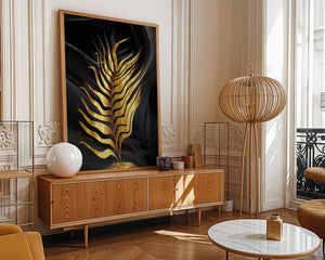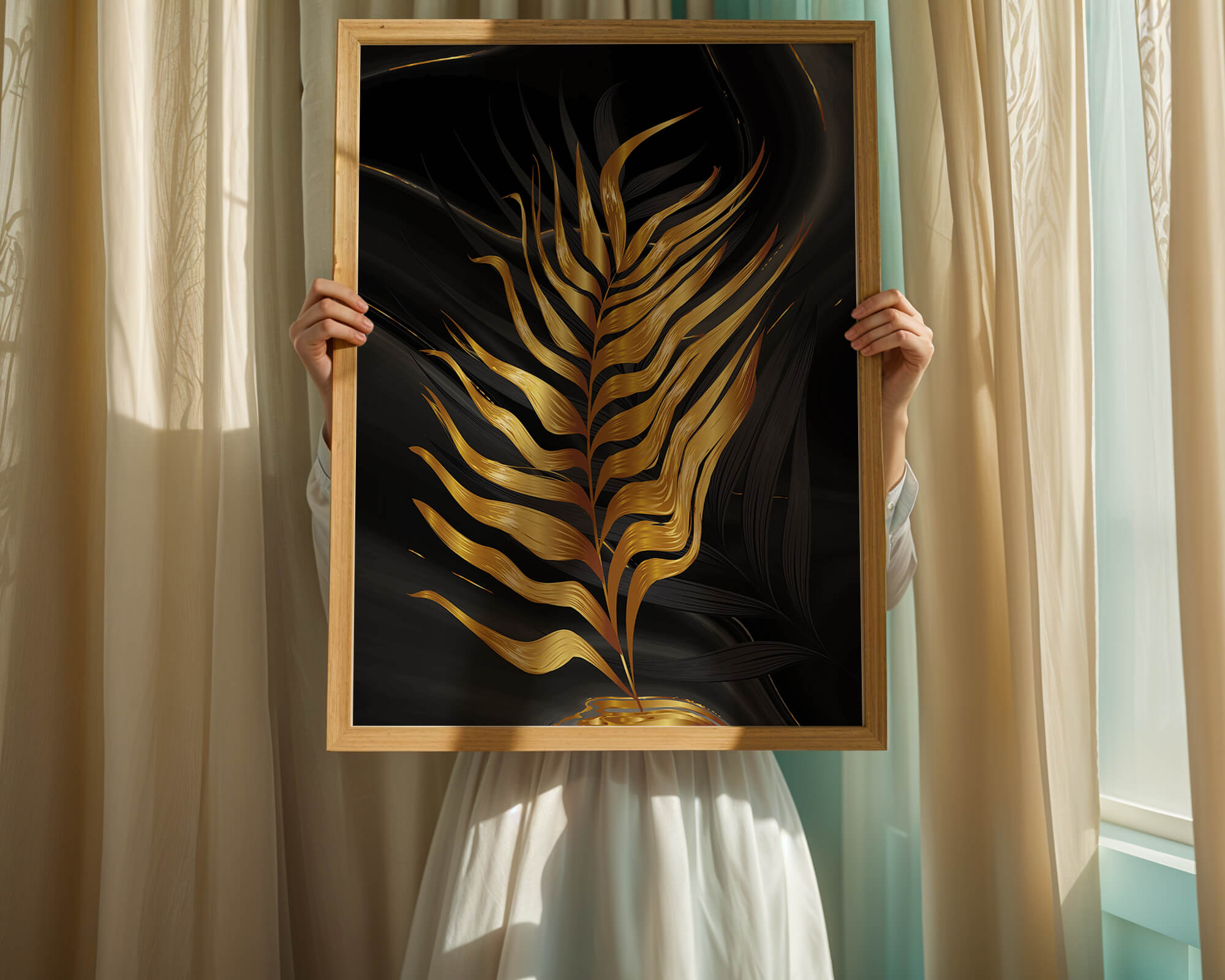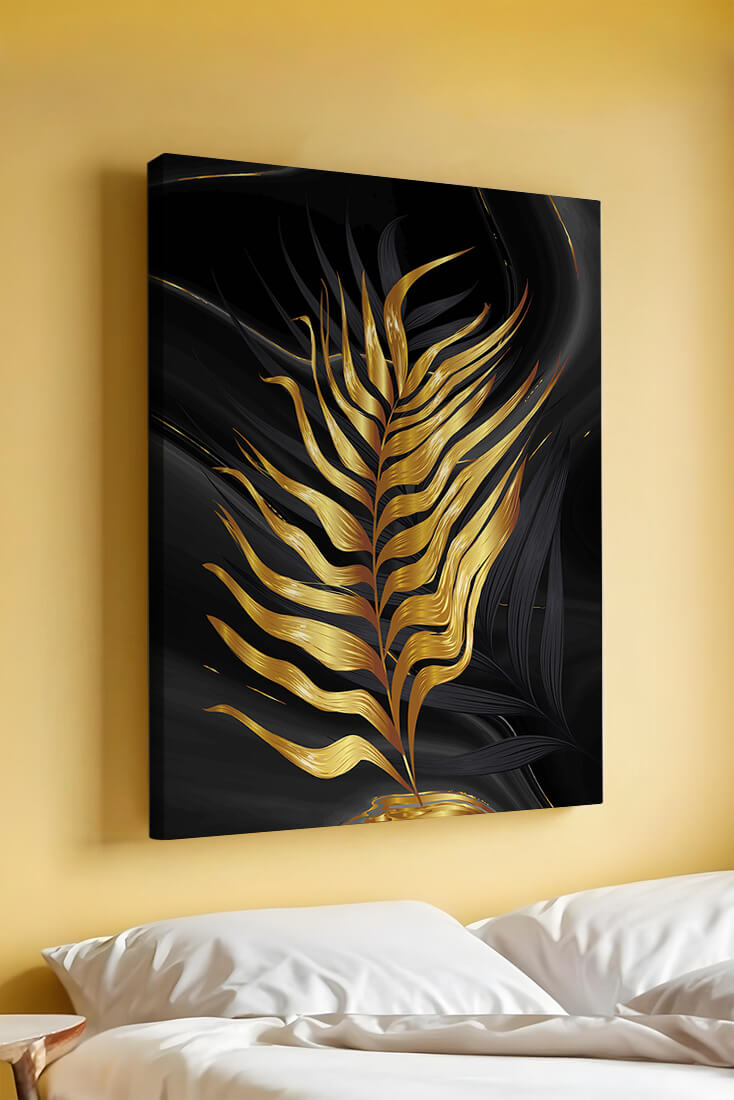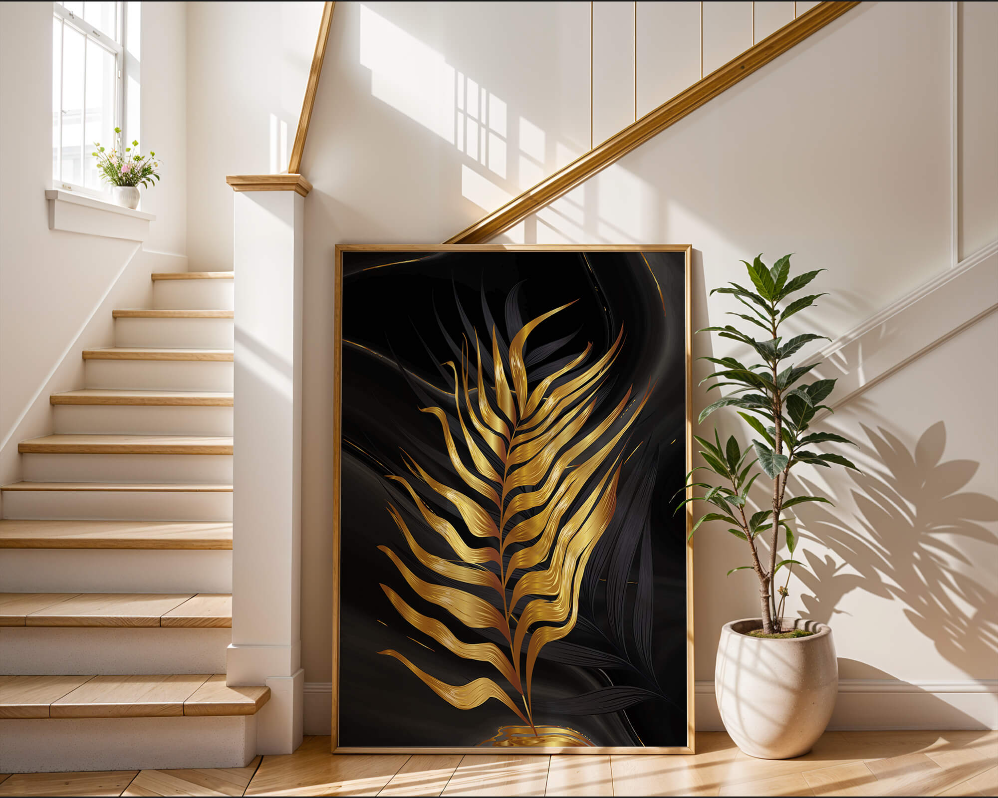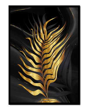 The golden palm leaf design brings together elements of nature and luxury in a harmonious blend. The intricate details of the leaf, with its shimmering edges and curving lines, create a sense of movement and dynamism. This piece is ideal for those looking to add a touch of sophistication and style to their living or office spaces. Additionally, the black background enhances the golden hues, offering an elegant and modern appeal. This artwork is suited for various interior themes, from contemporary to classic, and can serve as a focal point in any room, making a bold statement while maintaining an air of elegance.| Type |