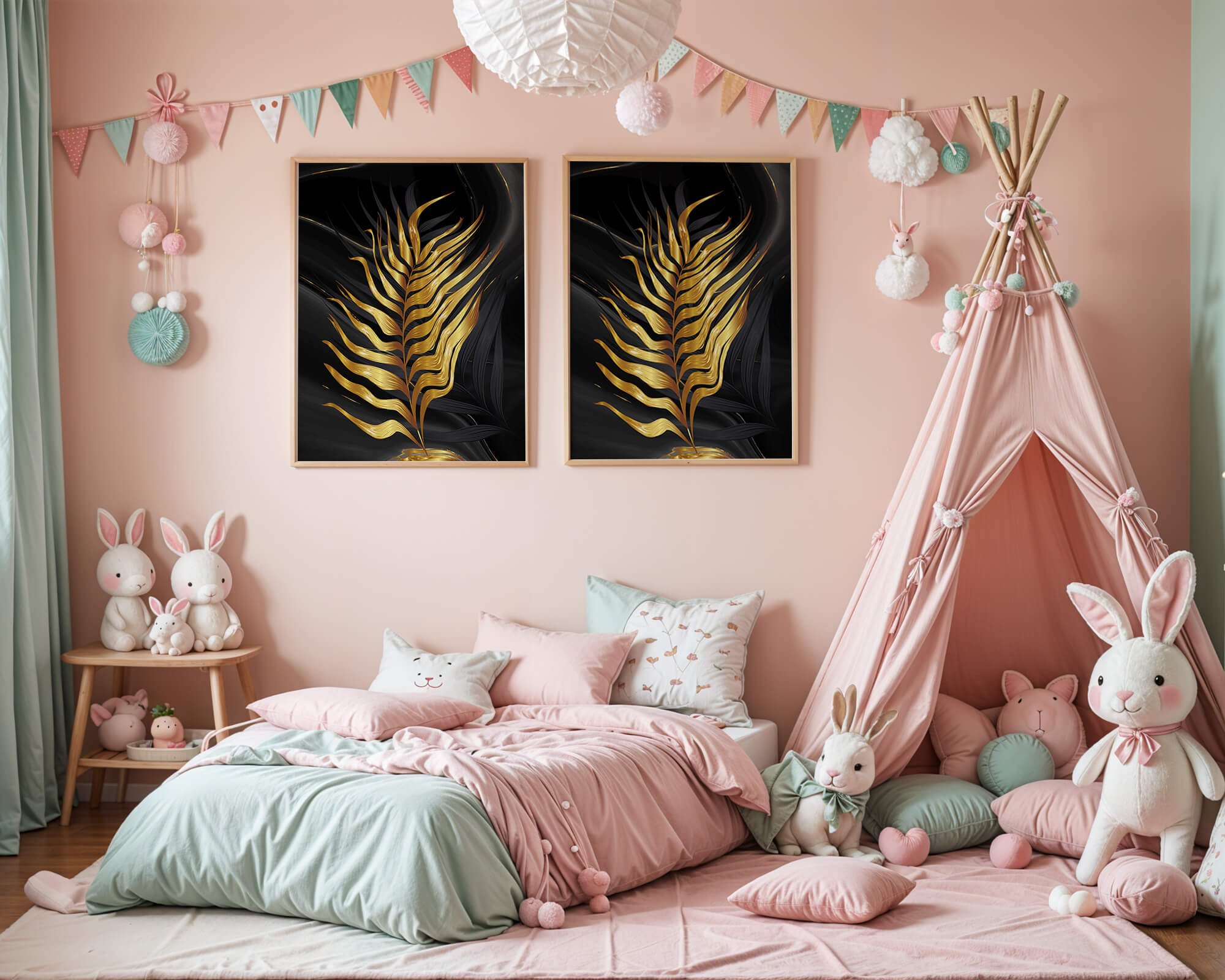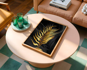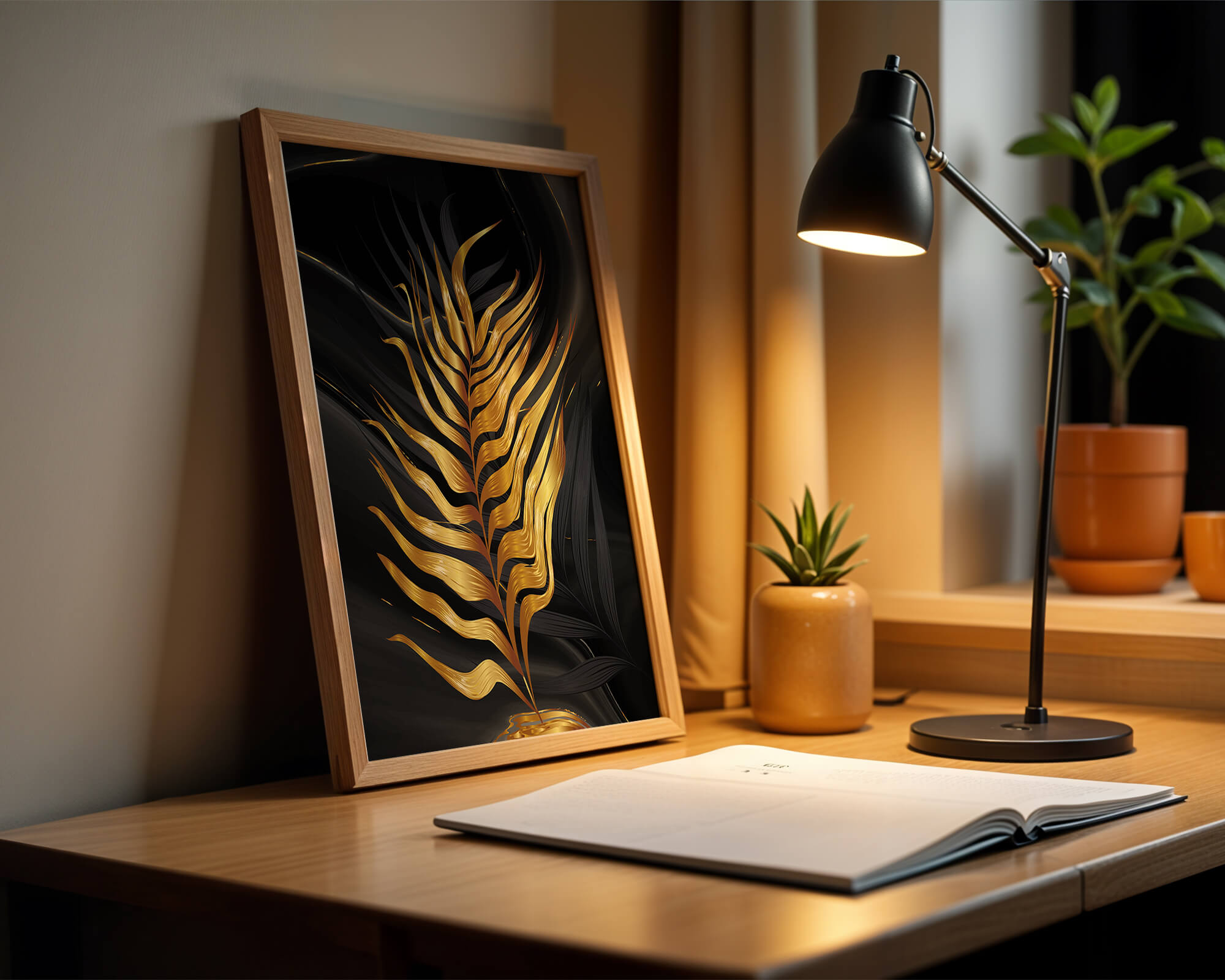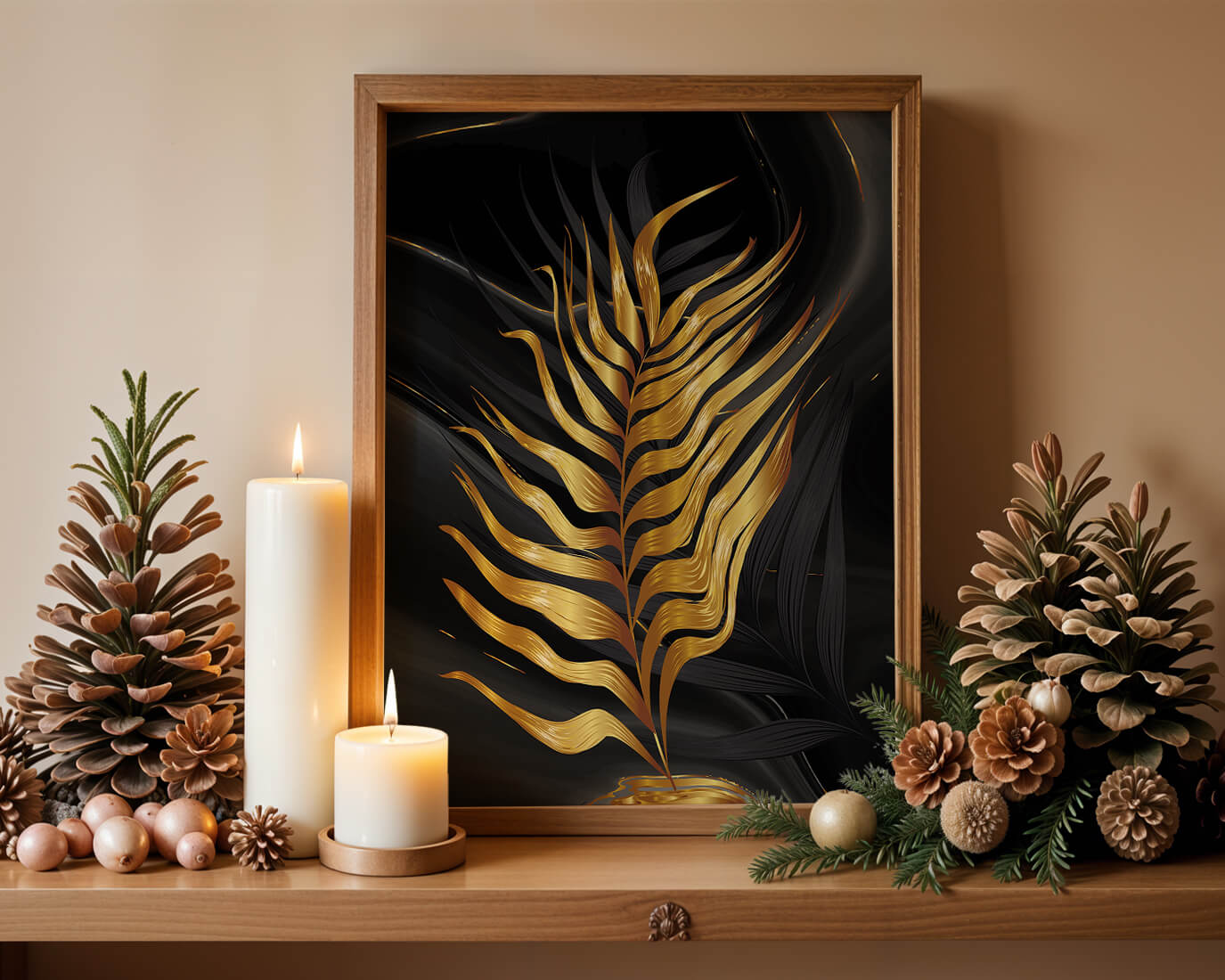 The golden palm leaf design brings together elements of nature and luxury in a harmonious blend. The intricate details of the leaf, with its shimmering edges and curving lines, create a sense of movement and dynamism. This piece is ideal for those looking to add a touch of sophistication and style to their living or office spaces. Additionally, the black background enhances the golden hues, offering an elegant and modern appeal. This artwork is suited for various interior themes, from contemporary to classic, and can serve as a focal point in any room, making a bold statement while maintaining an air of elegance.| Type |