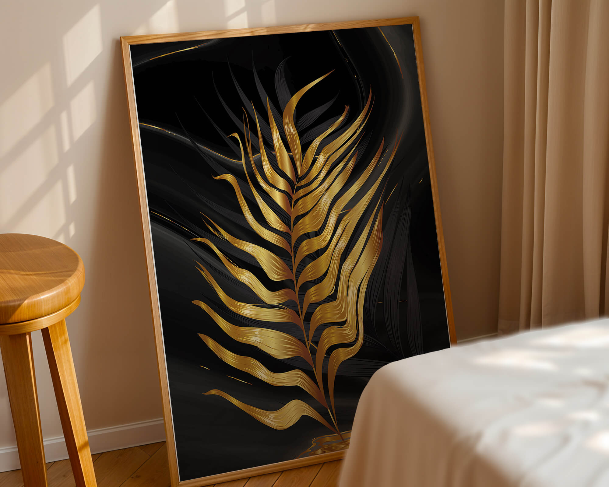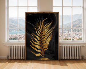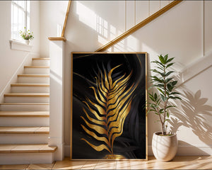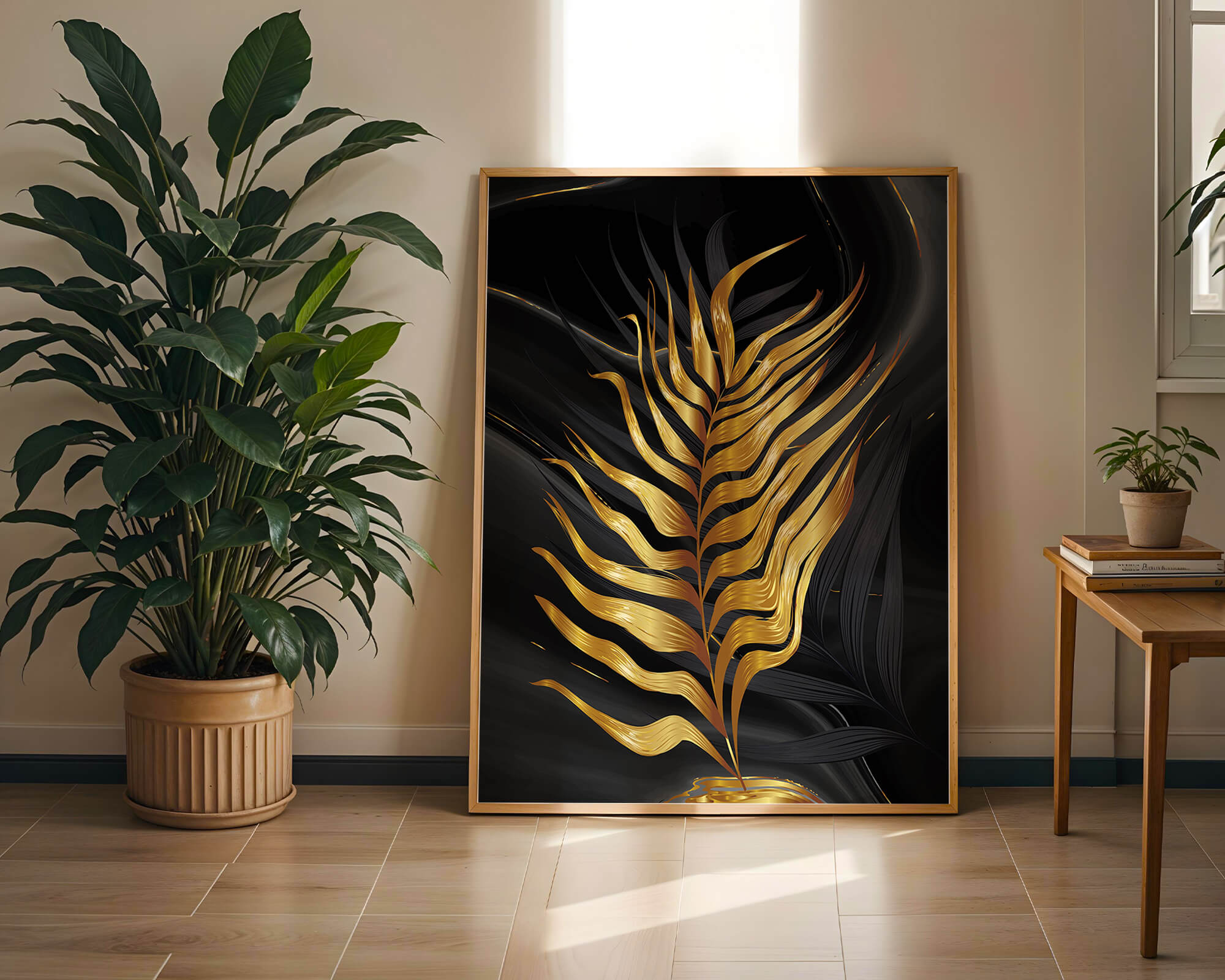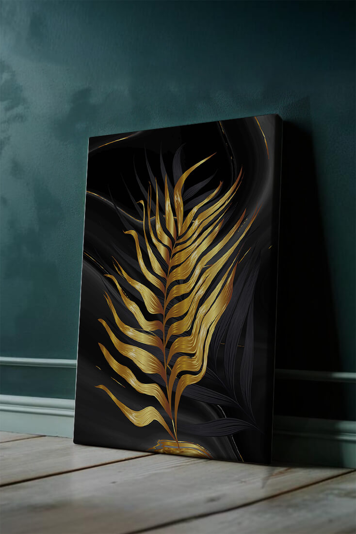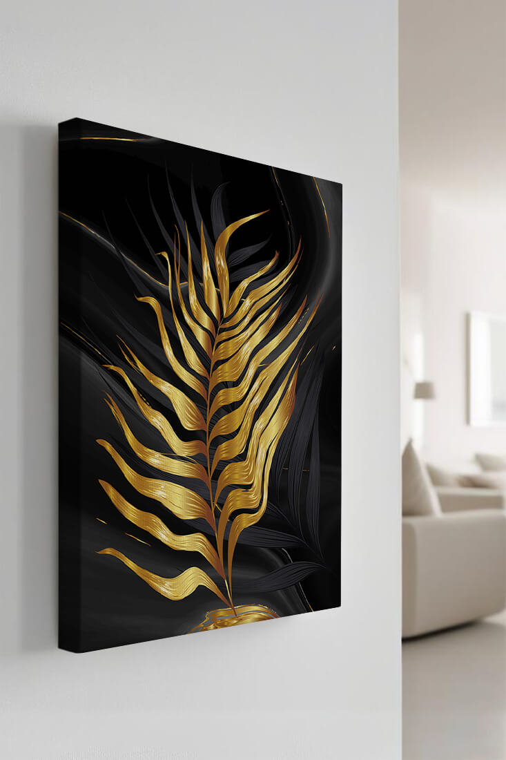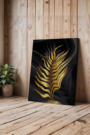 This artwork features a striking golden palm leaf set against a rich black background, creating a stunning visual contrast. The shiny gold texture of the leaf is highlighted beautifully, making it a perfect piece for modern and elegant interiors.