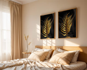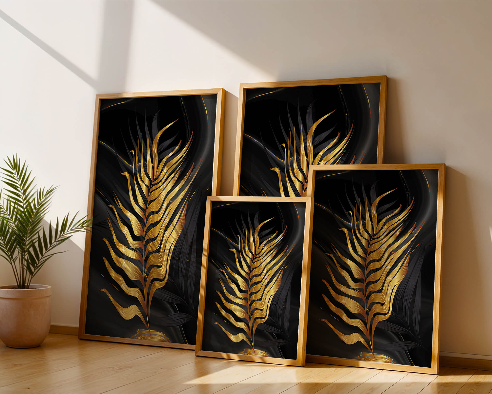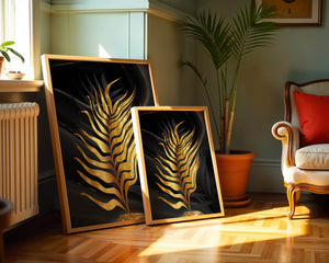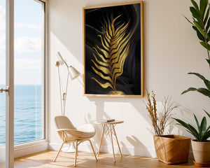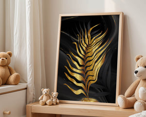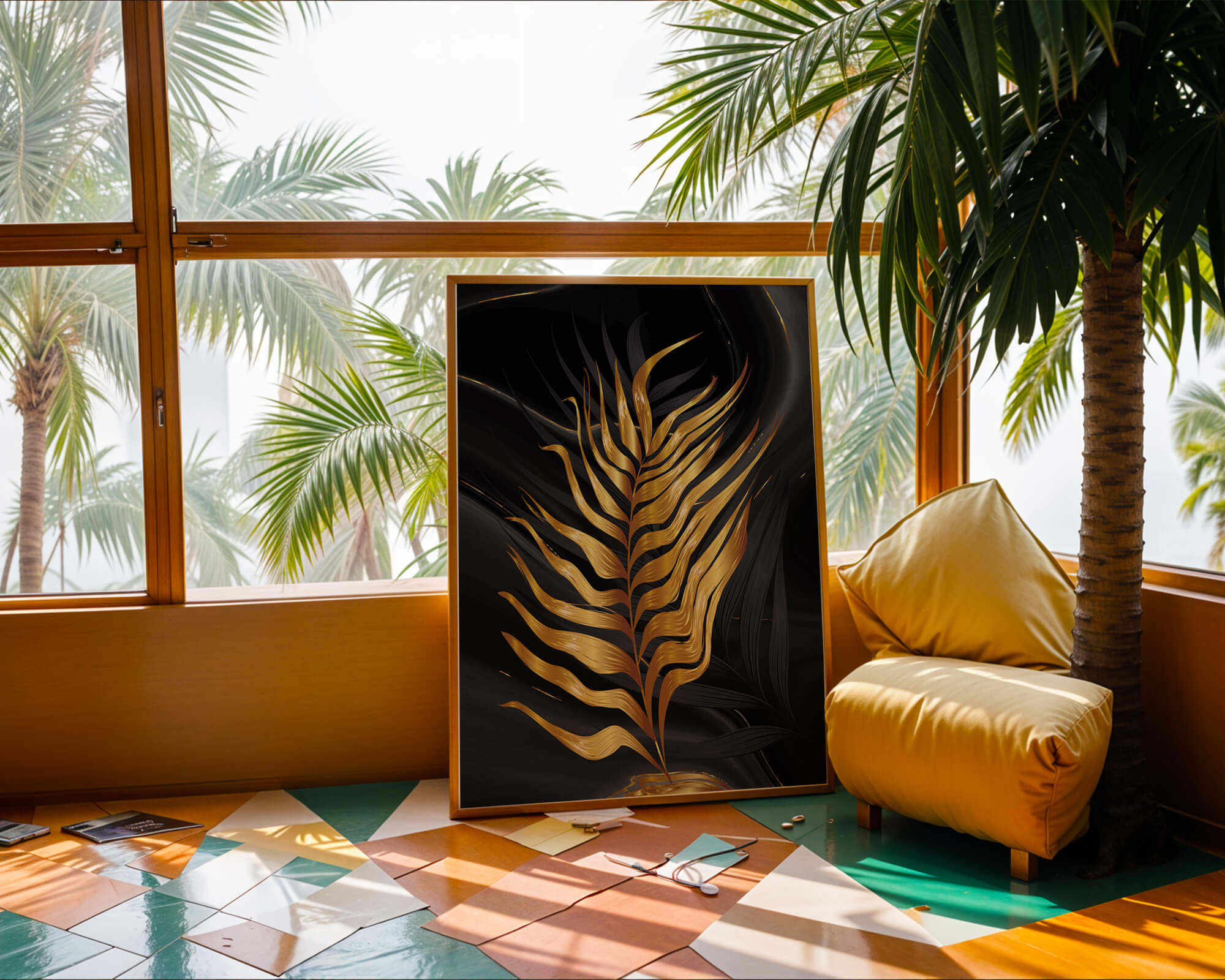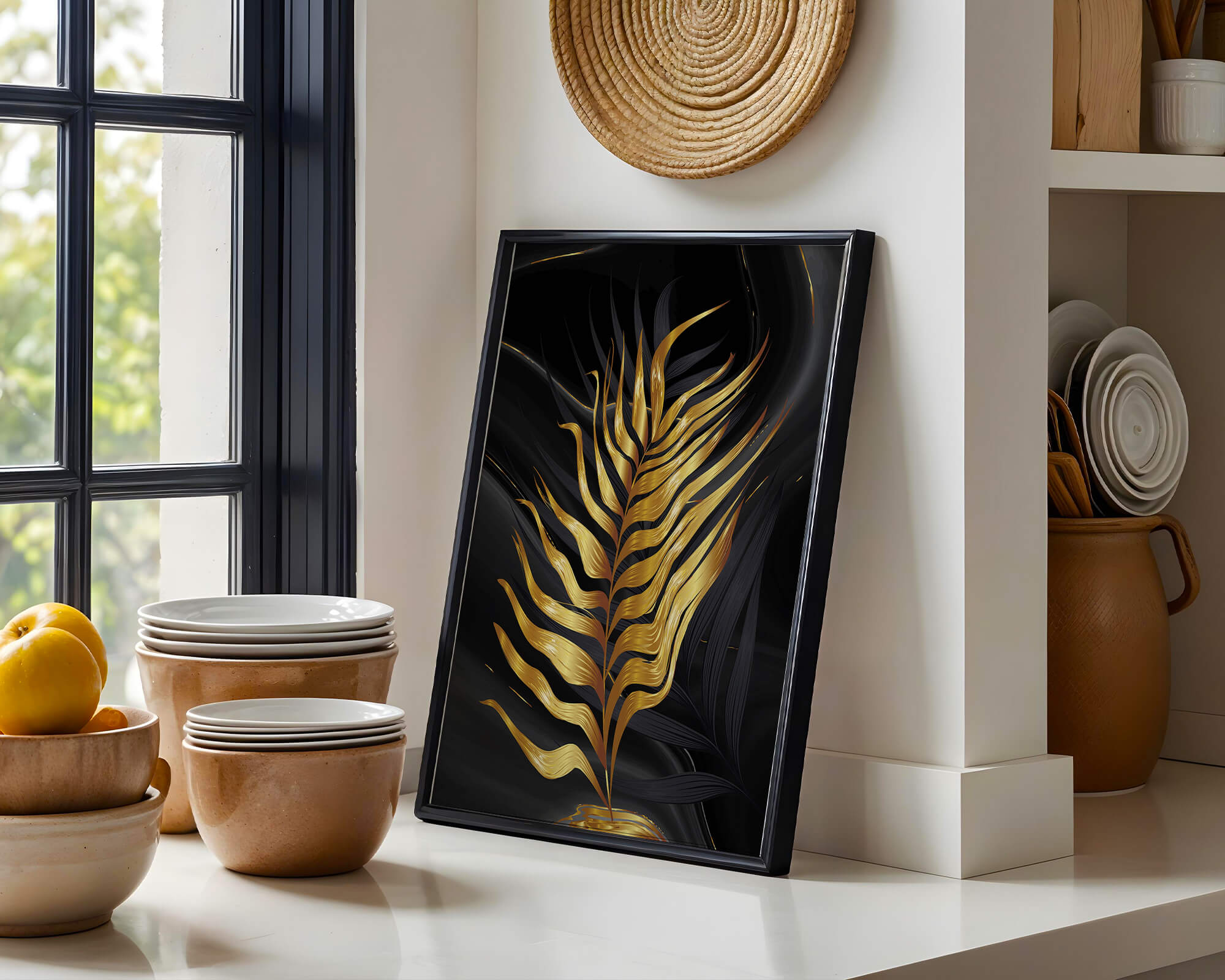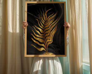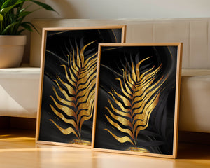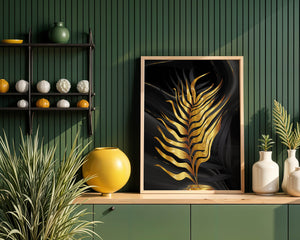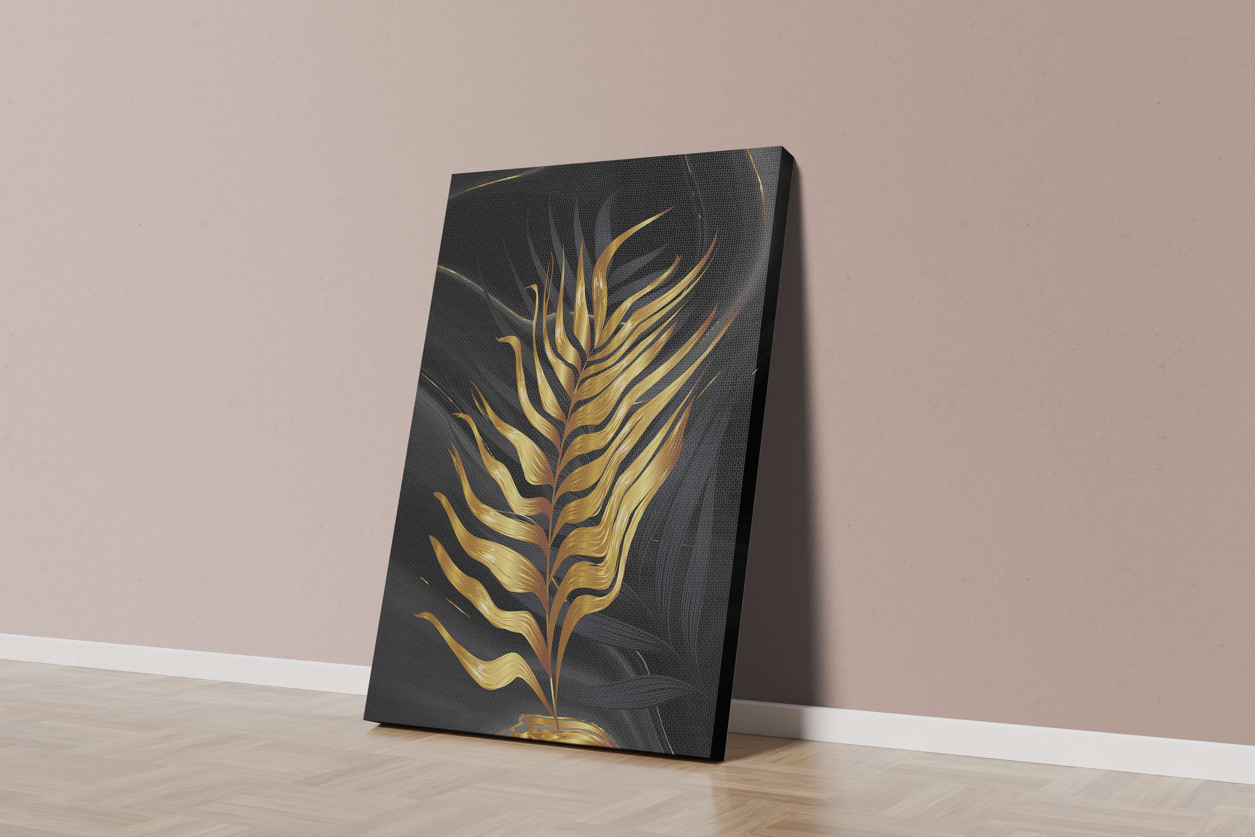 This artwork features a striking golden palm leaf set against a rich black background, creating a stunning visual contrast. The shiny gold texture of the leaf is highlighted beautifully, making it a perfect piece for modern and elegant interiors.