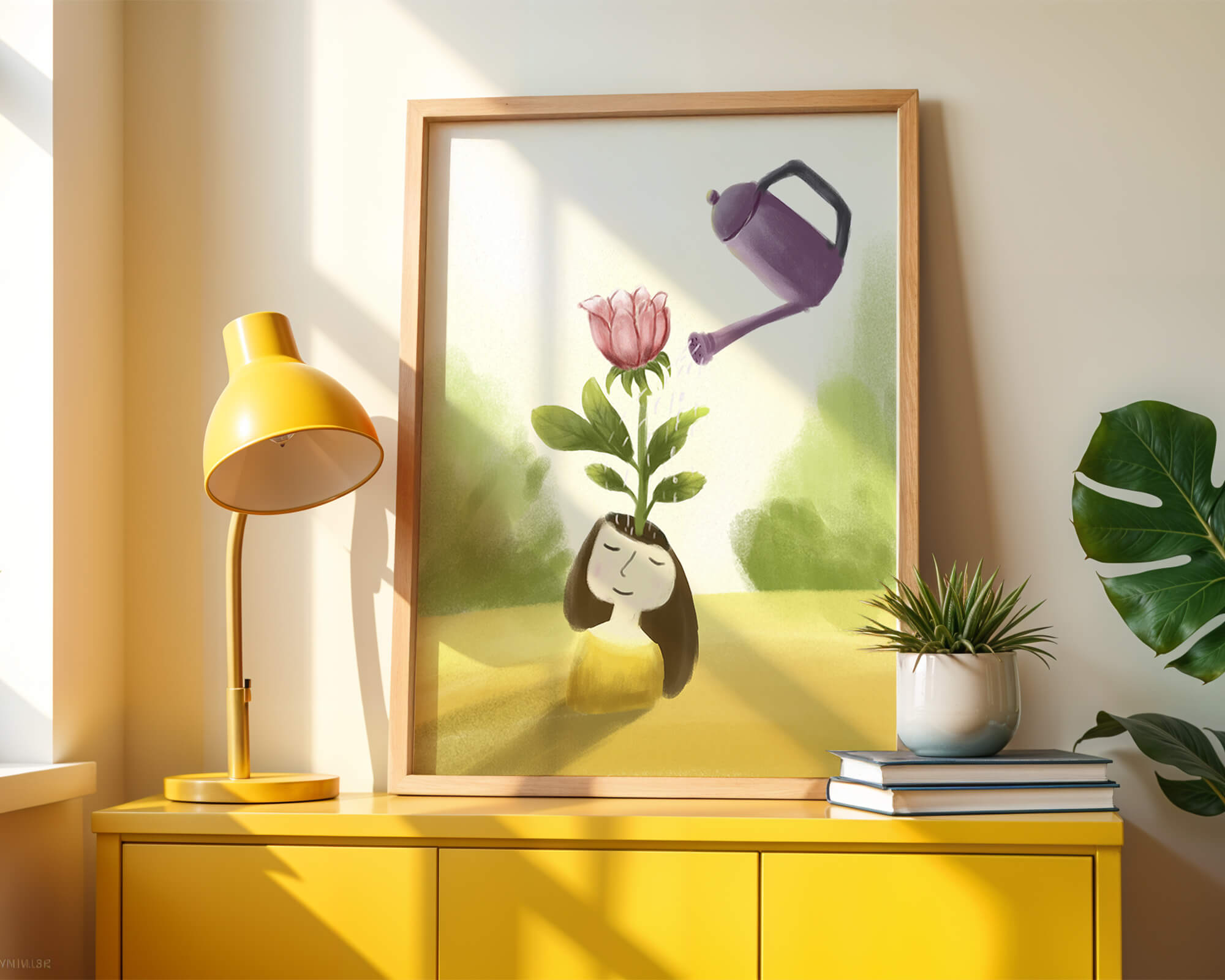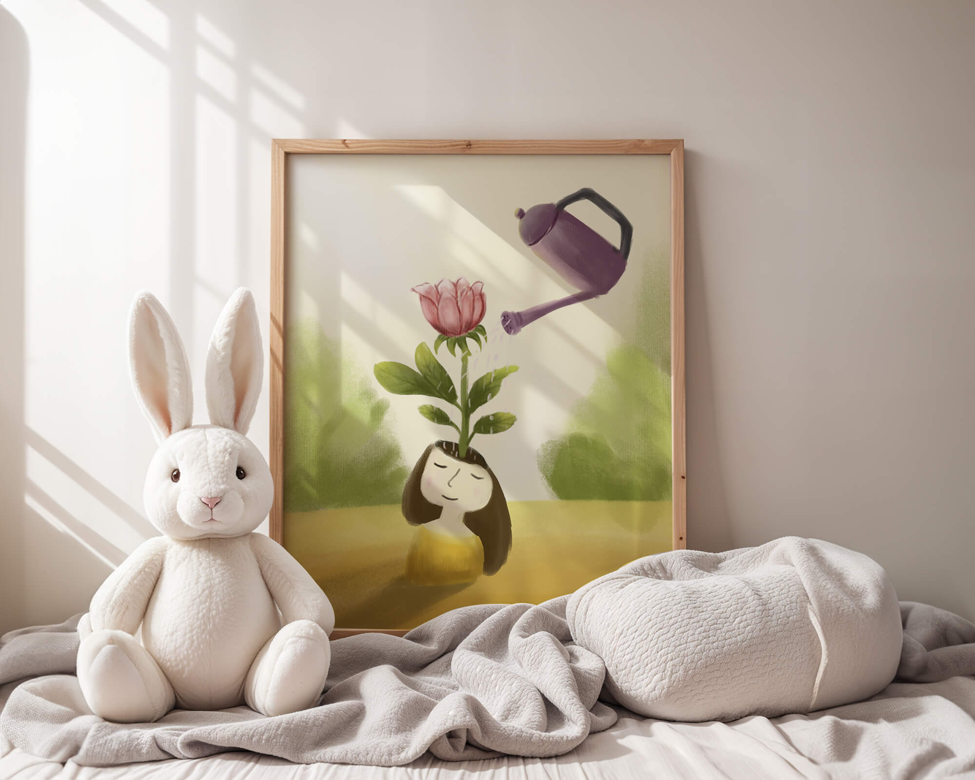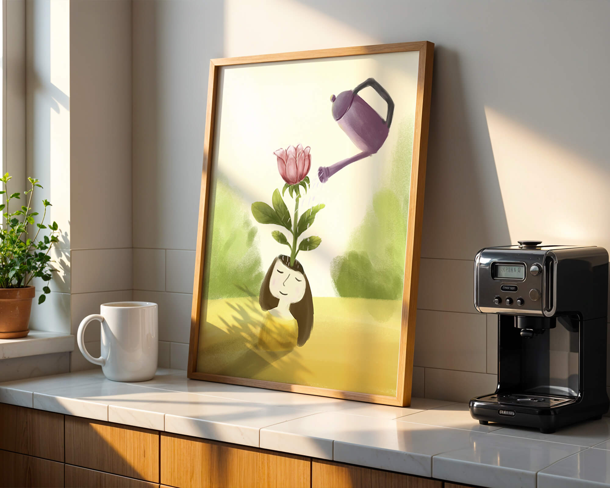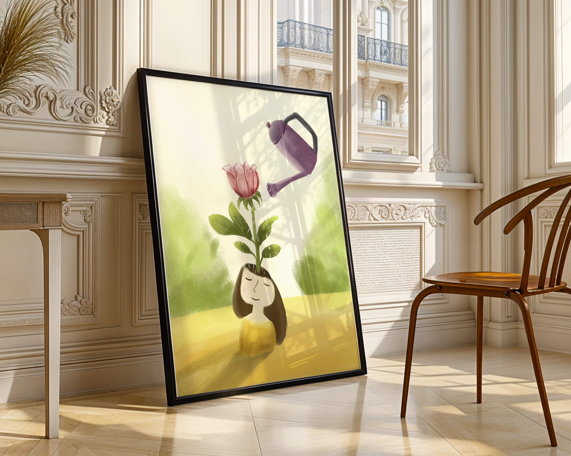 This charming illustration features a whimsical scene of a girl with a flower growing from her head, being thoughtfully watered by a purple watering can. The artwork blends fantasy and creativity, inviting viewers into a serene and imaginative world.