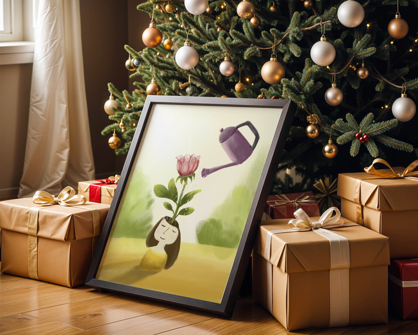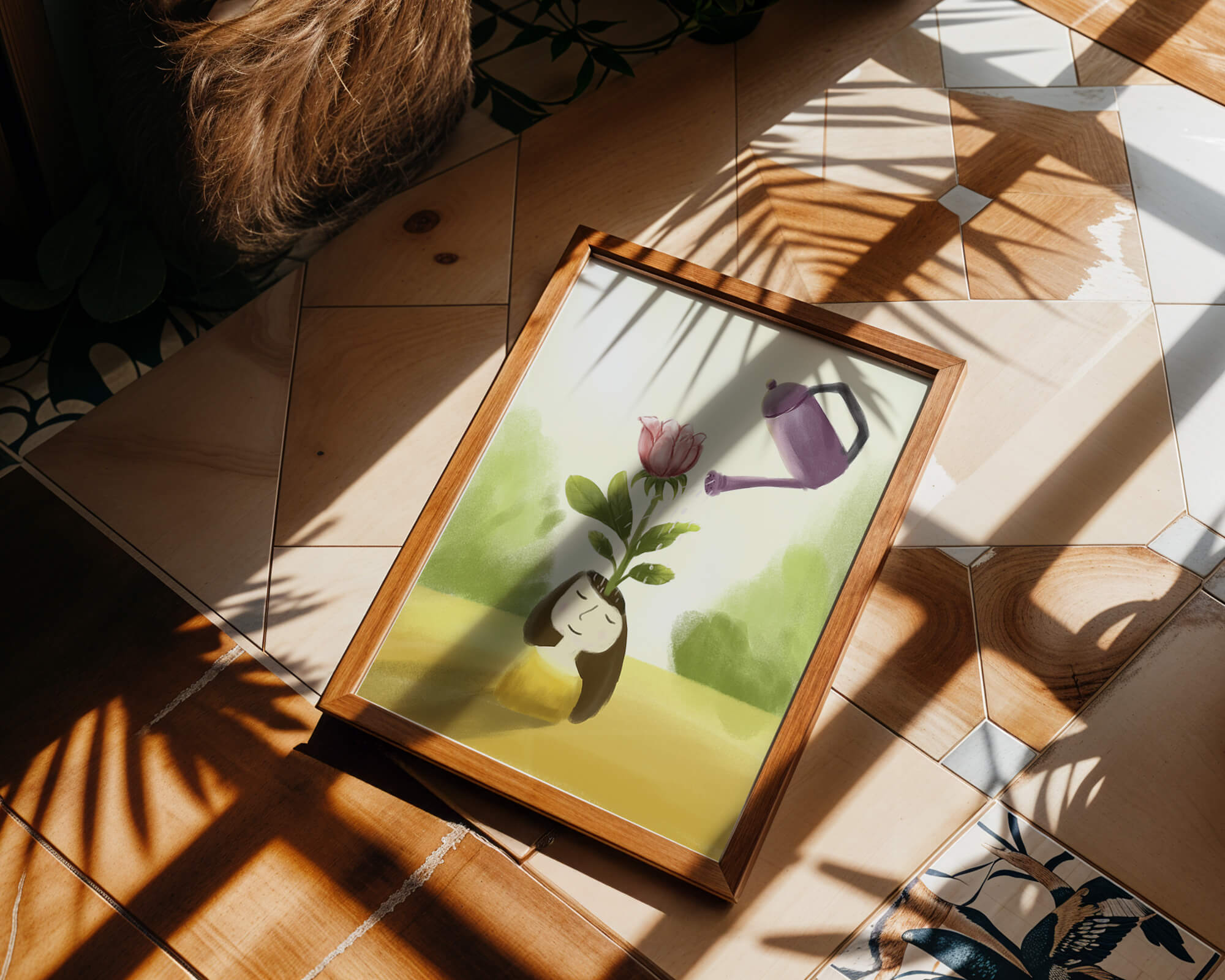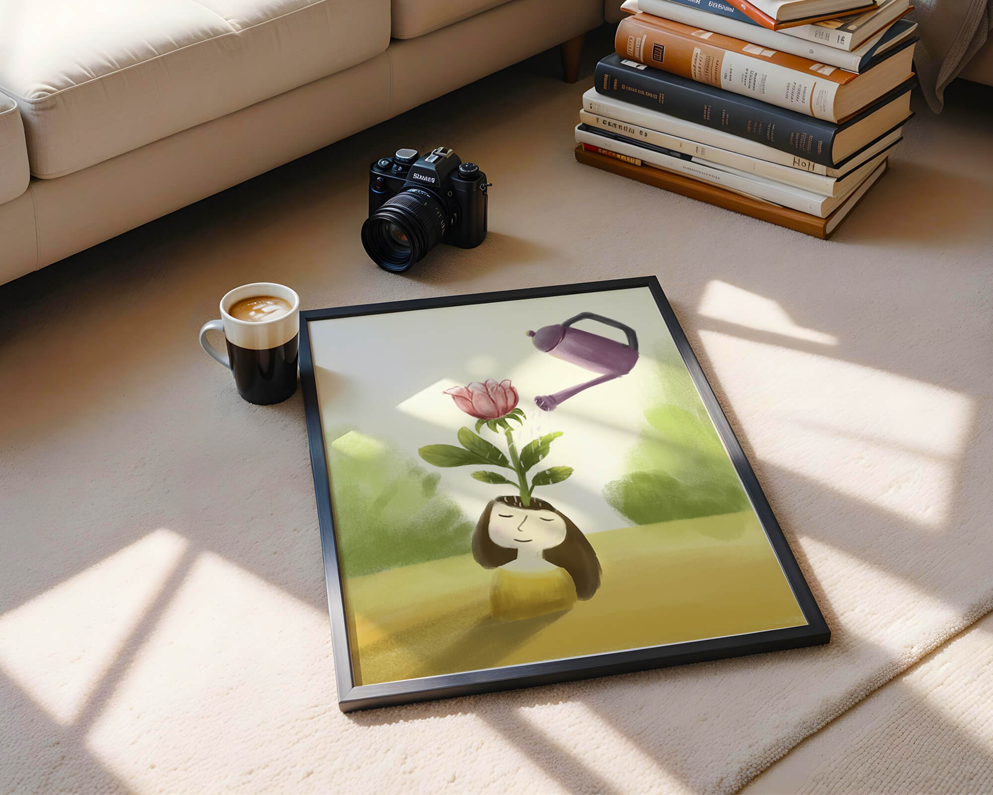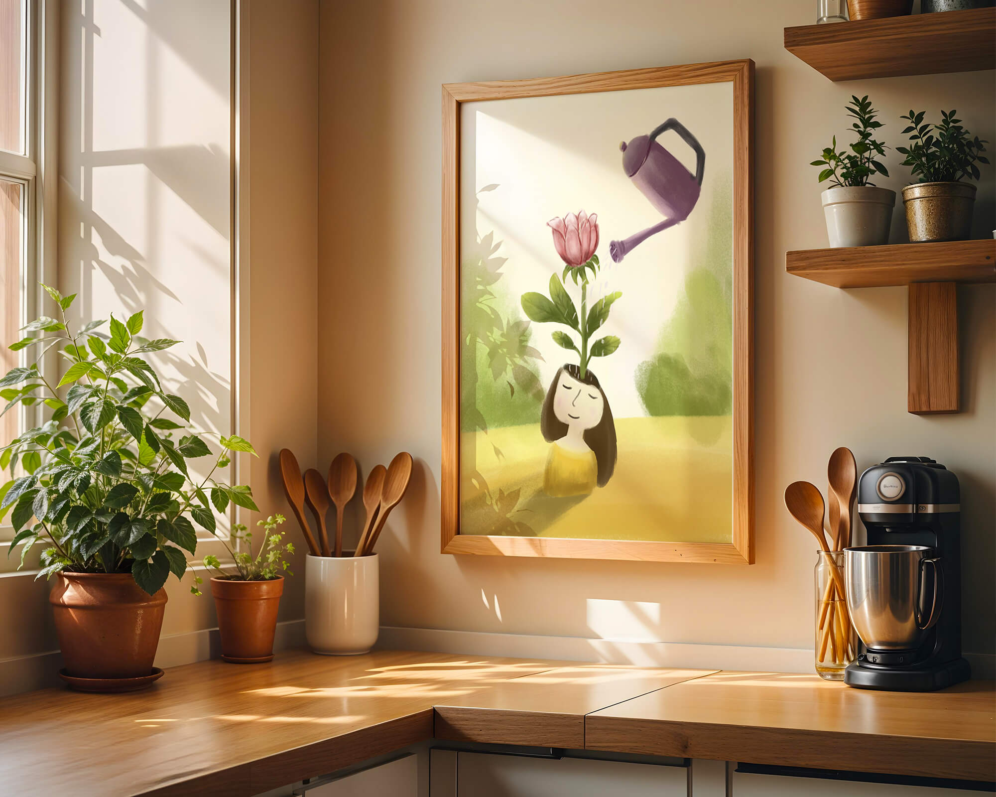 This charming illustration features a whimsical scene of a girl with a flower growing from her head, being thoughtfully watered by a purple watering can. The artwork blends fantasy and creativity, inviting viewers into a serene and imaginative world.