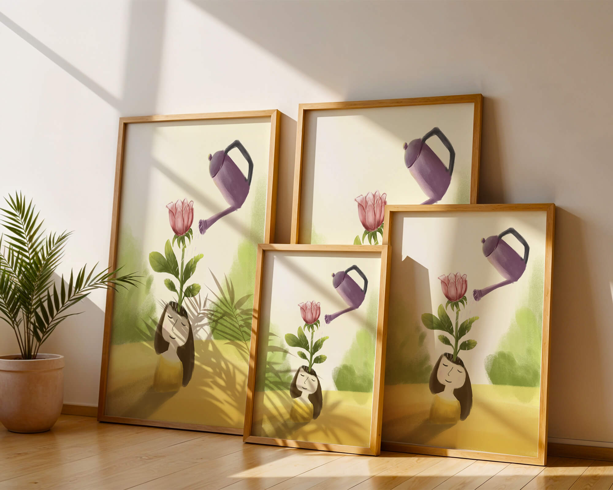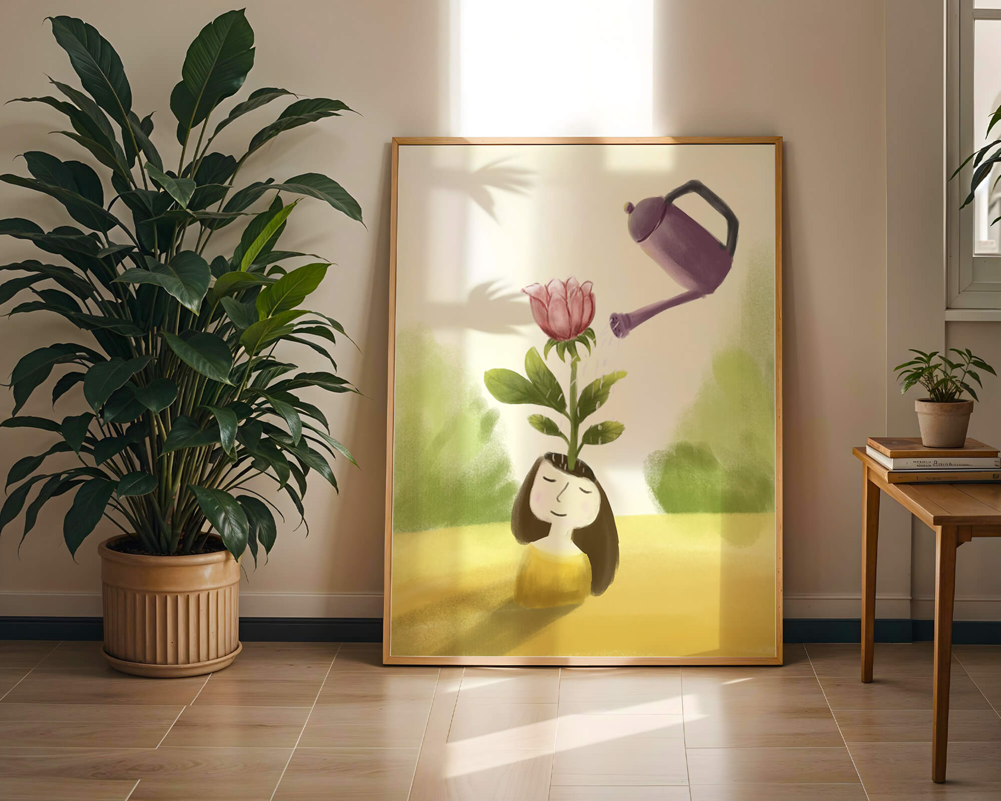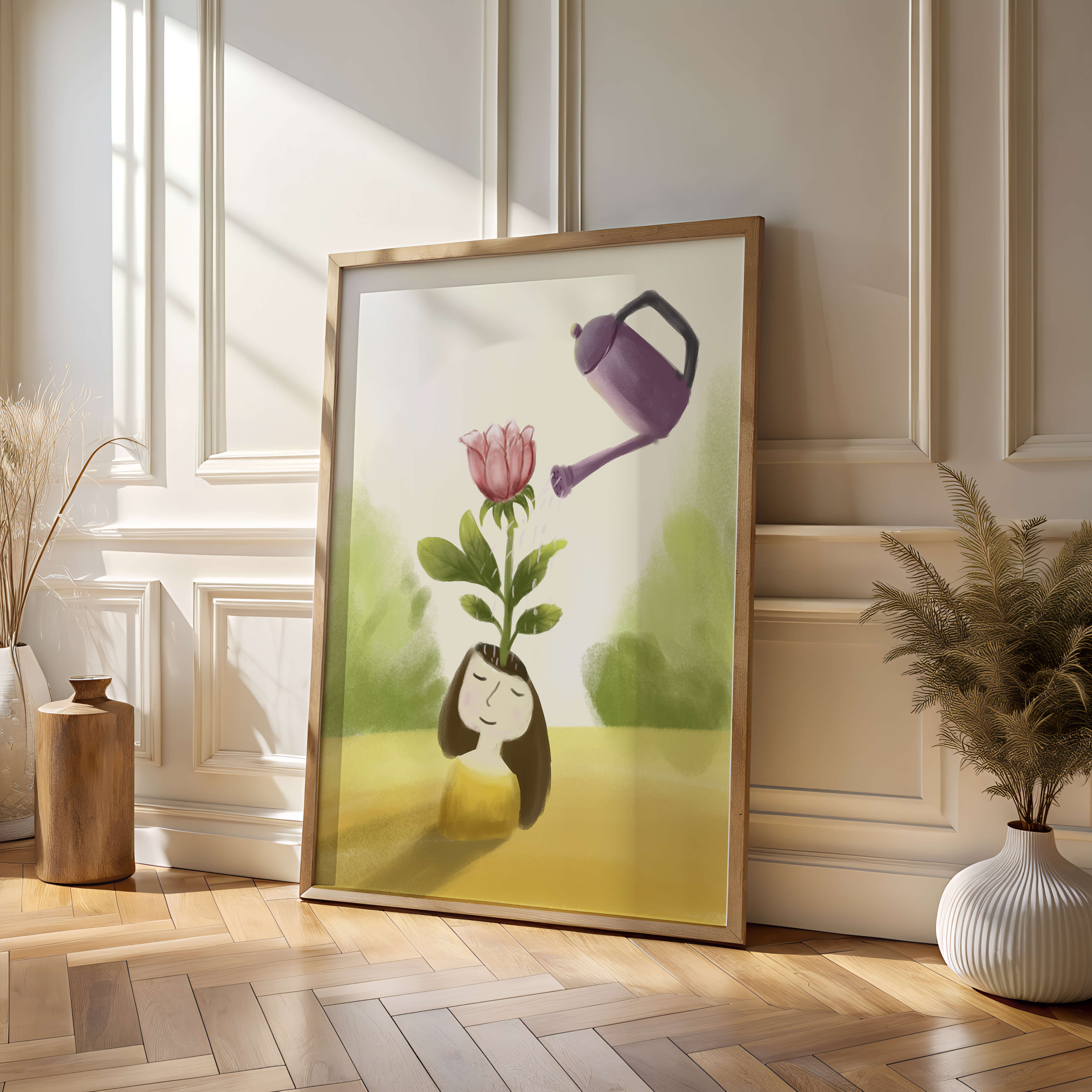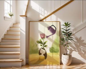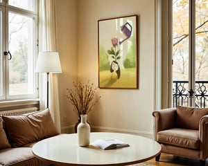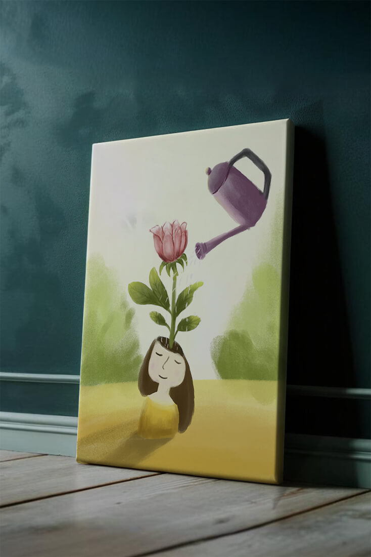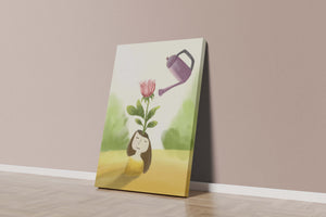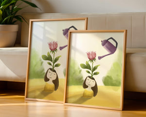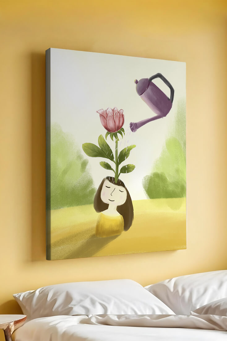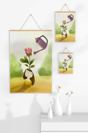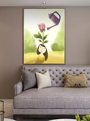 The image captures a moment of quiet reflection as a girl stands with a serene expression, a blooming pink flower sprouting from her head. This surreal concept may symbolize growth and the blossoming of new ideas. The gentle watering suggests nourishment and care, essential for flourishing both plants and minds alike.The soft, pastel colors and dreamy atmosphere enhance the whimsical nature of the illustration, making it a lovely piece for any art lover seeking to add a touch of fantasy and calm into their living room or bedroom. This artwork invites introspection and celebrates the interconnectedness of nature and the imagination.| Type |