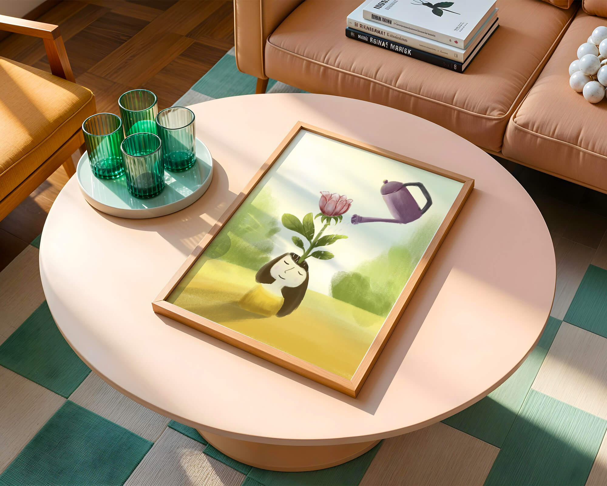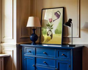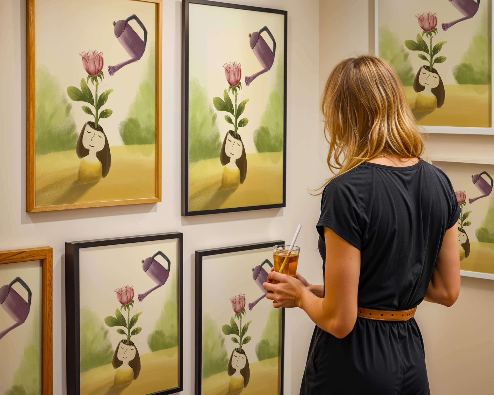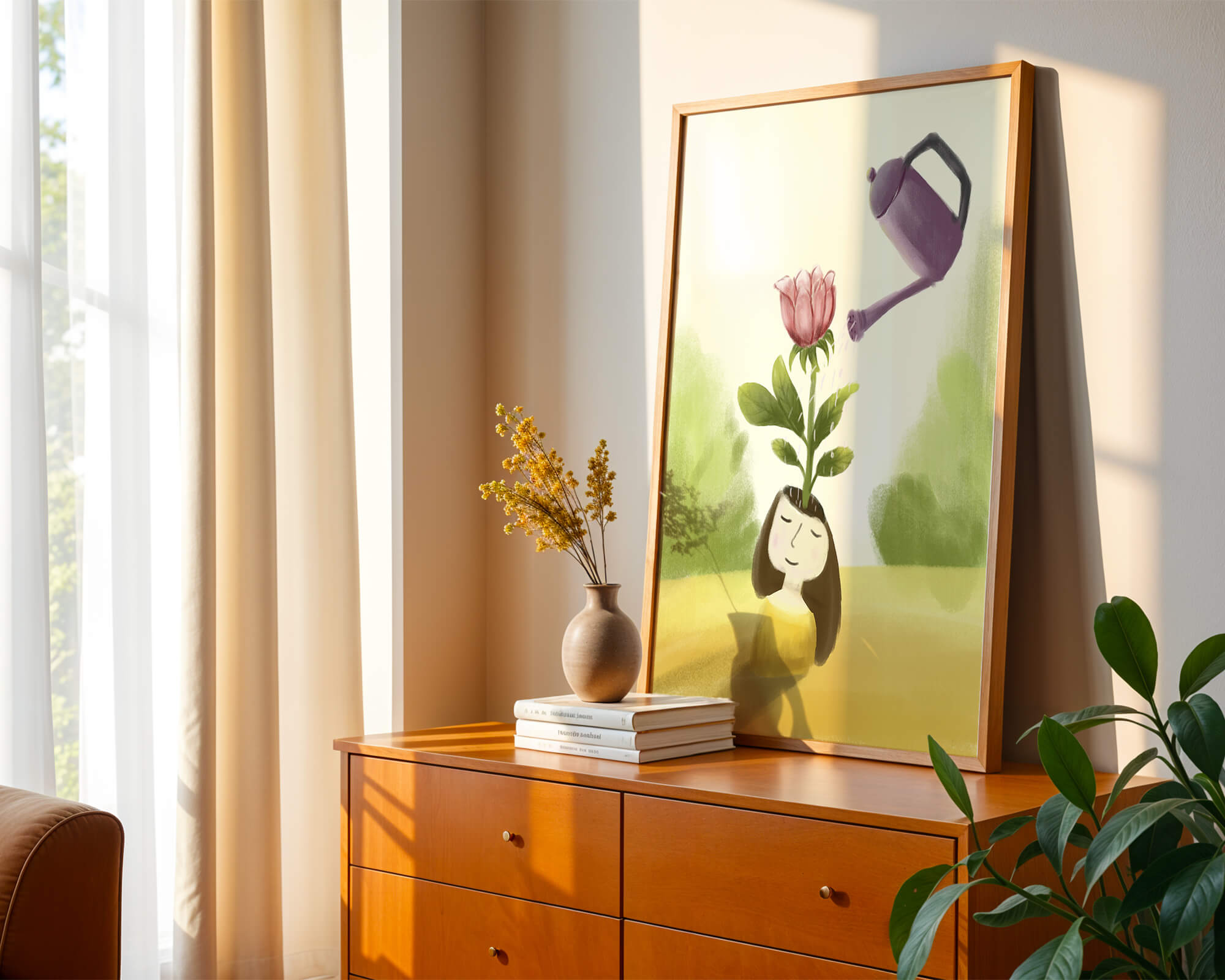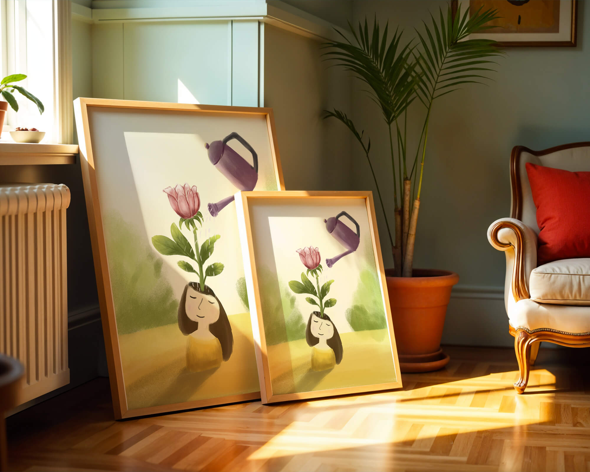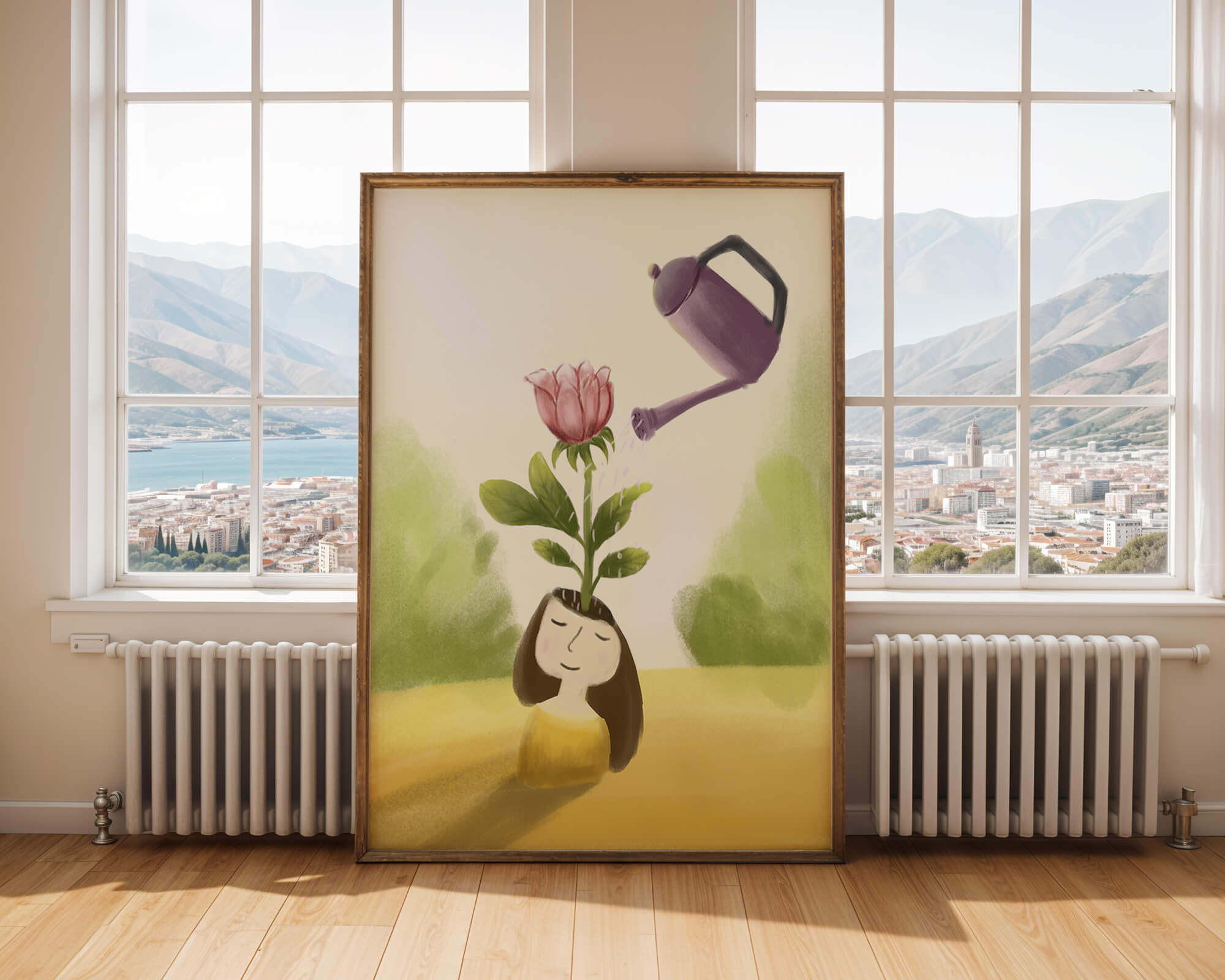 The image captures a moment of quiet reflection as a girl stands with a serene expression, a blooming pink flower sprouting from her head. This surreal concept may symbolize growth and the blossoming of new ideas. The gentle watering suggests nourishment and care, essential for flourishing both plants and minds alike.The soft, pastel colors and dreamy atmosphere enhance the whimsical nature of the illustration, making it a lovely piece for any art lover seeking to add a touch of fantasy and calm into their living room or bedroom. This artwork invites introspection and celebrates the interconnectedness of nature and the imagination.| Type |