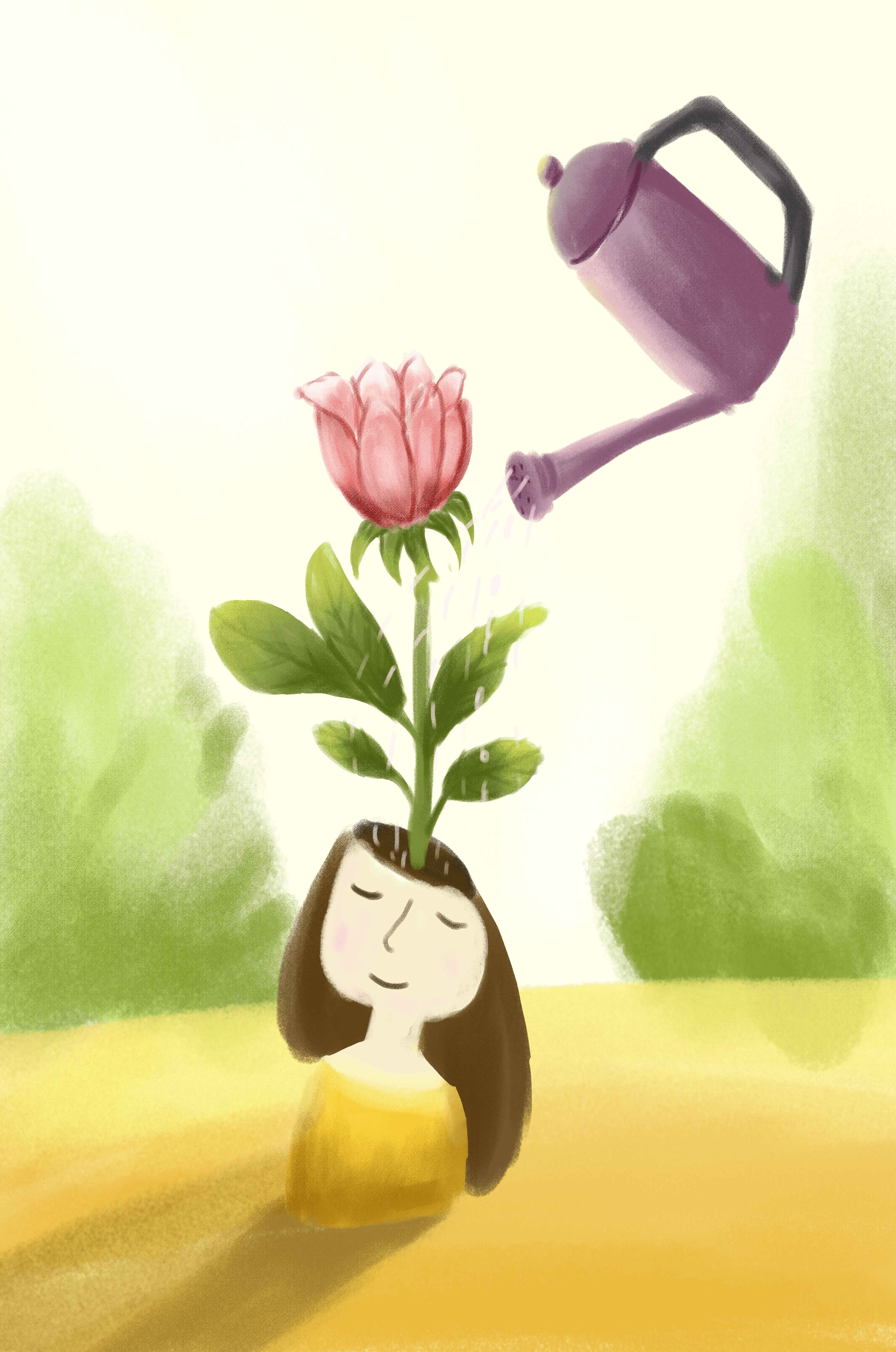Illustration of a girl with a flower growing from her head being watered