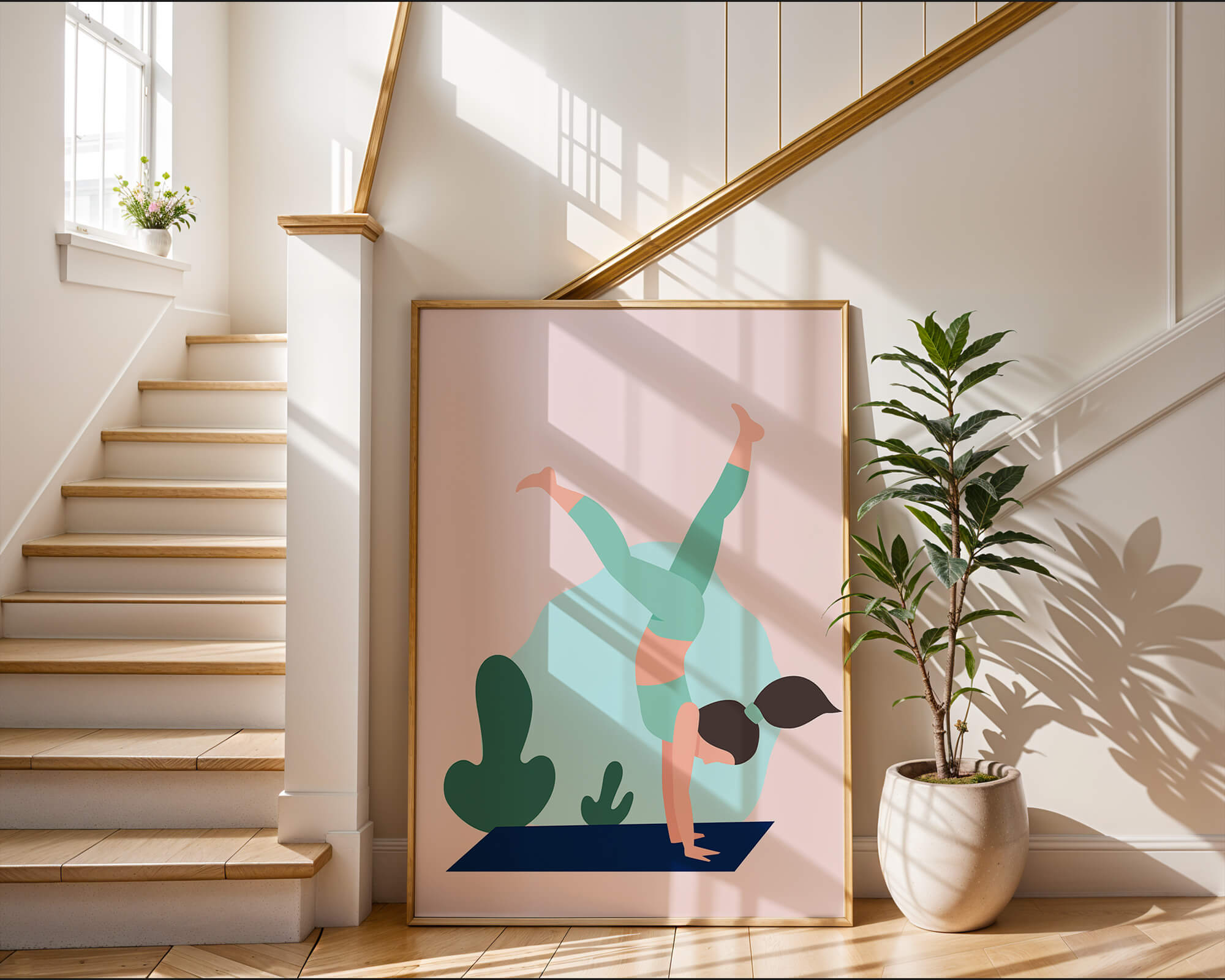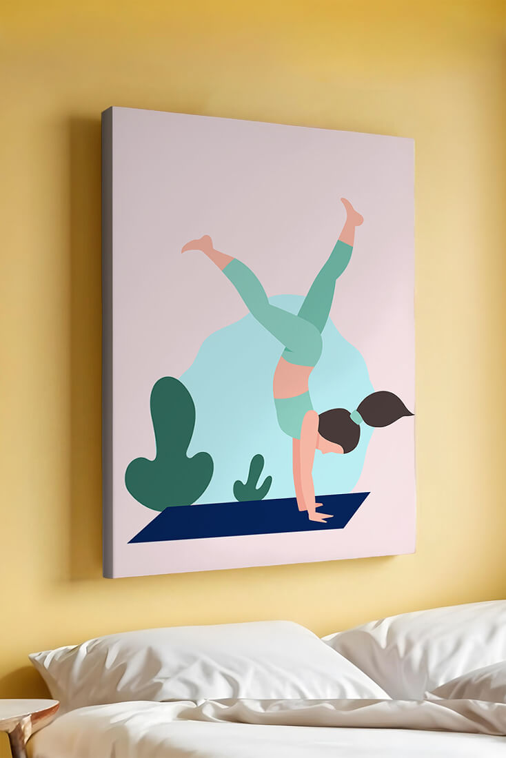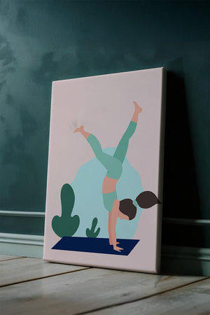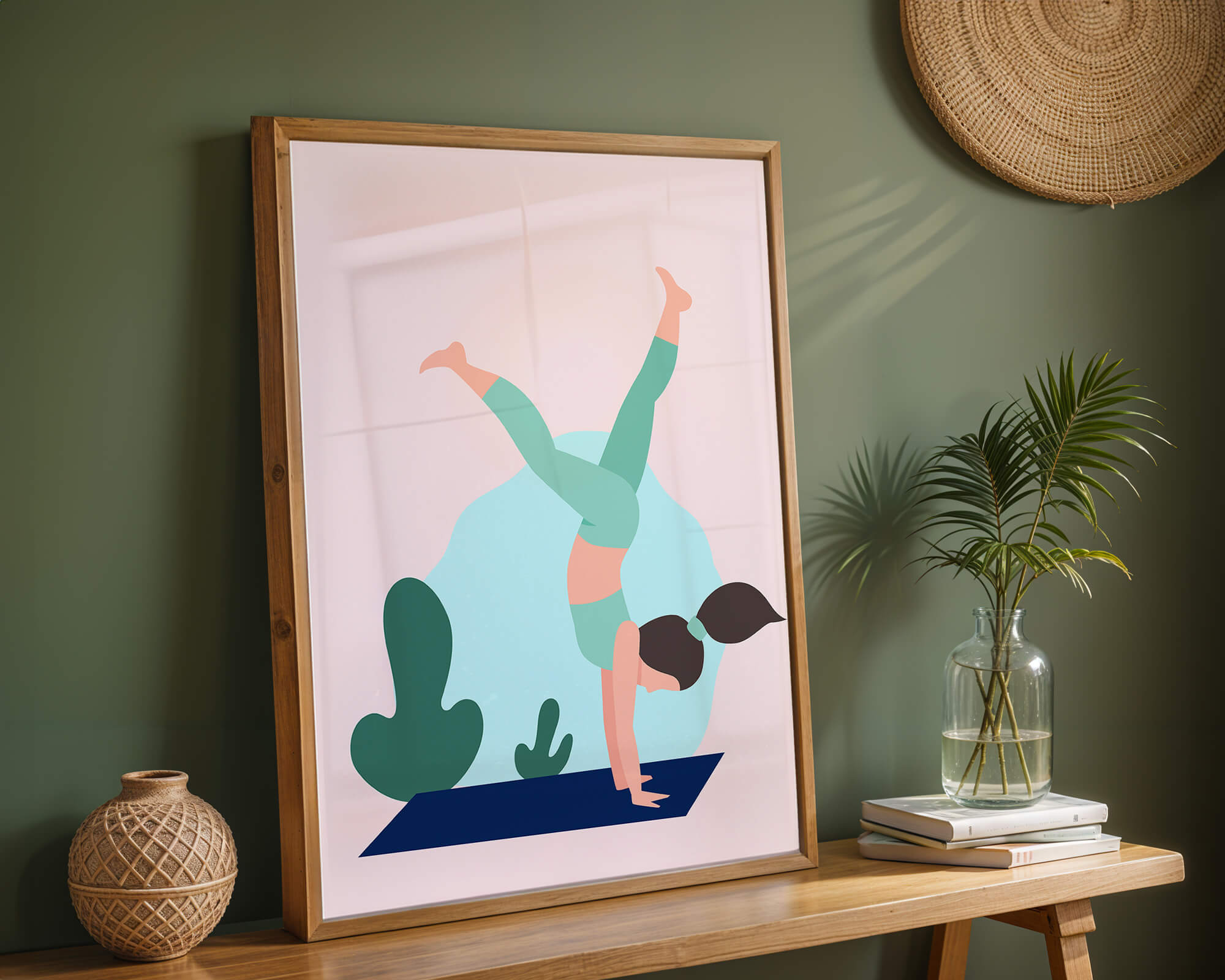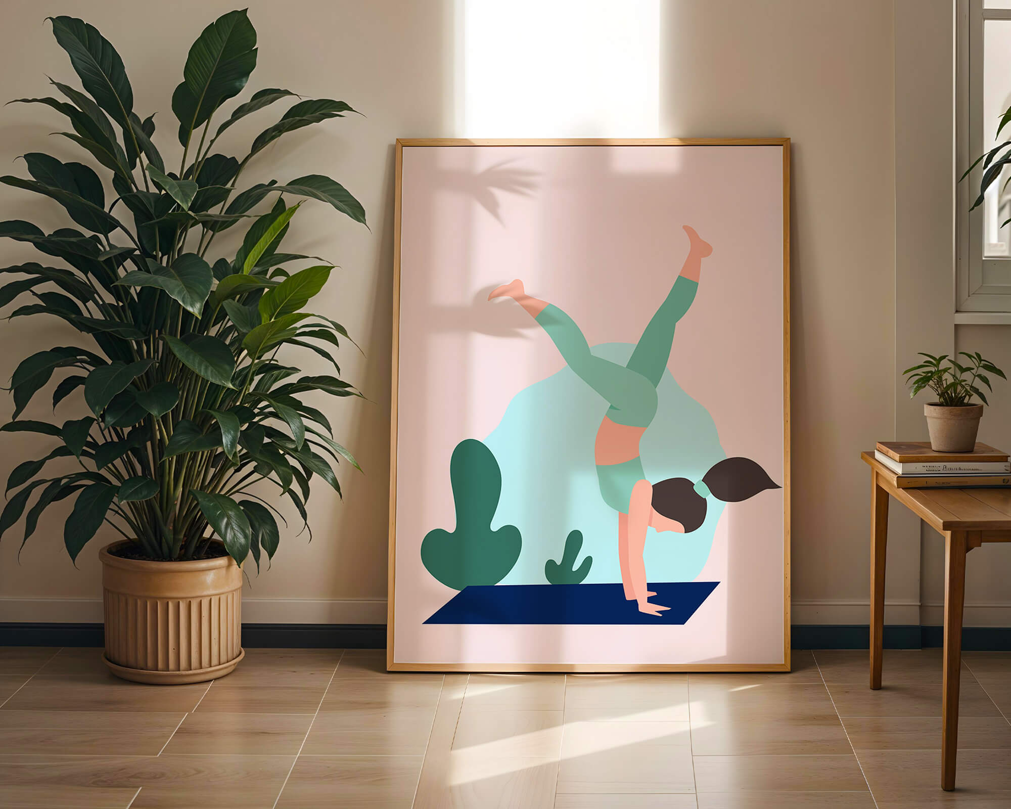 In this artwork, the woman is depicted in a handstand position, showcasing both her strength and balance. Her teal workout attire complements the deep blue of the yoga mat, and her ponytail is highlighted with a matching teal band. The background features abstract plant shapes in various shades of green, adding to the peaceful atmosphere of the scene.The overall composition conveys a message of inner peace and physical strength, making it an inspiring addition to any wellness-focused space. Its perfect for yoga enthusiasts who appreciate both the artistic representation of their practice and the tranquility it brings to their everyday life.| Type |