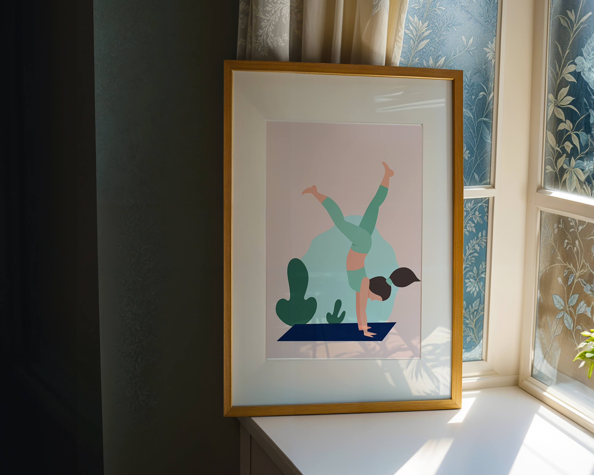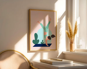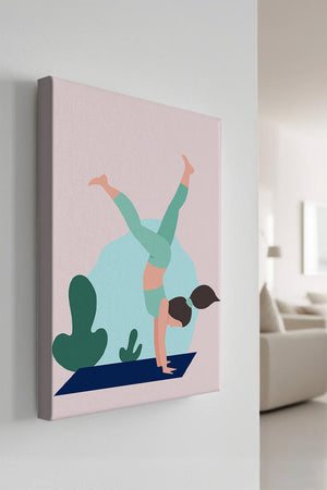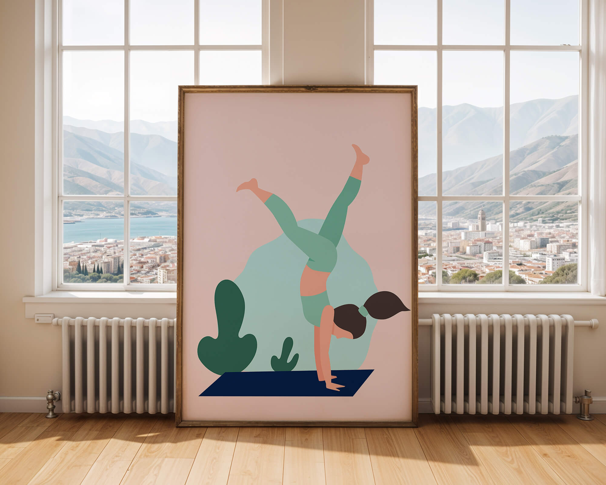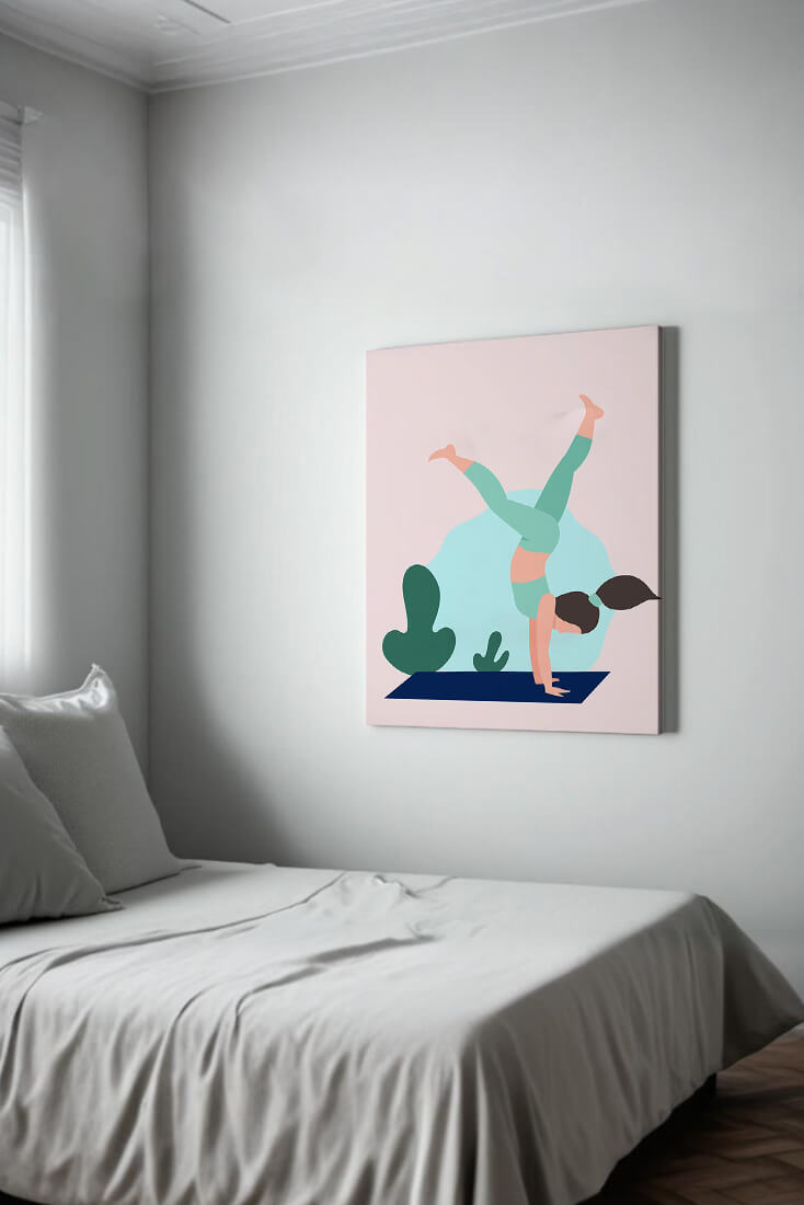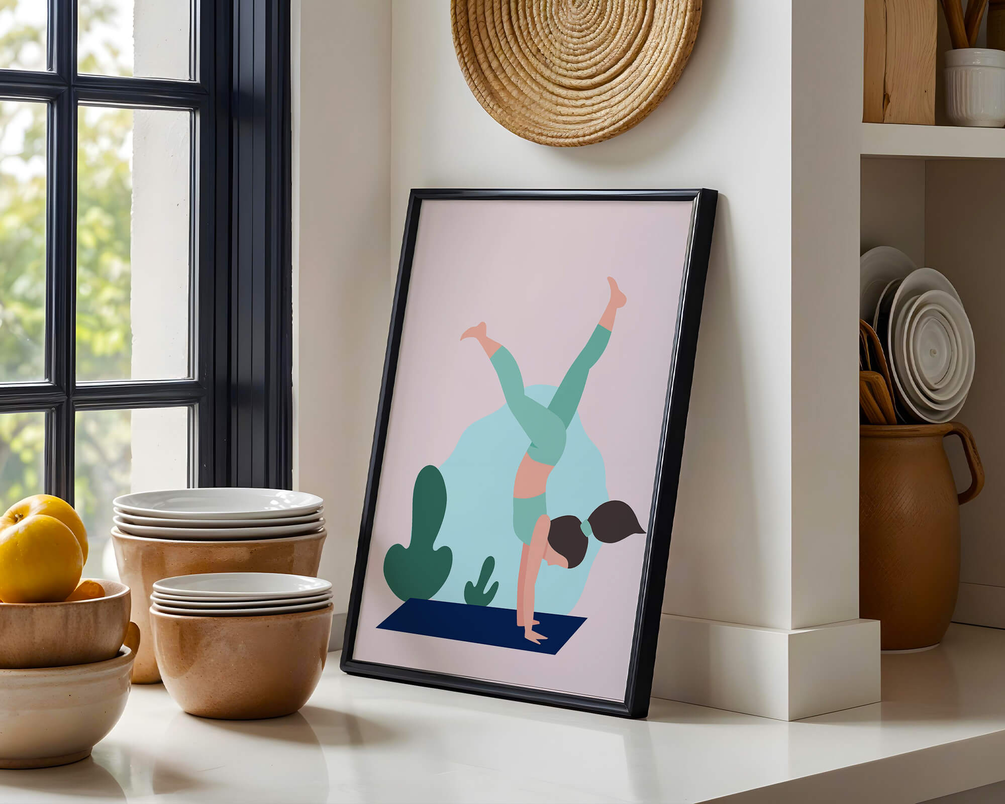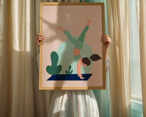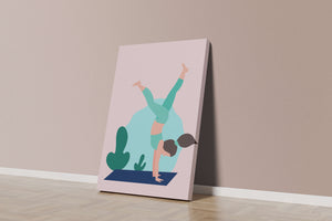 In this artwork, the woman is depicted in a handstand position, showcasing both her strength and balance. Her teal workout attire complements the deep blue of the yoga mat, and her ponytail is highlighted with a matching teal band. The background features abstract plant shapes in various shades of green, adding to the peaceful atmosphere of the scene.The overall composition conveys a message of inner peace and physical strength, making it an inspiring addition to any wellness-focused space. Its perfect for yoga enthusiasts who appreciate both the artistic representation of their practice and the tranquility it brings to their everyday life.| Type |