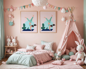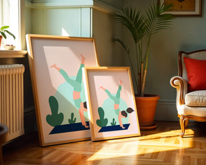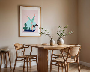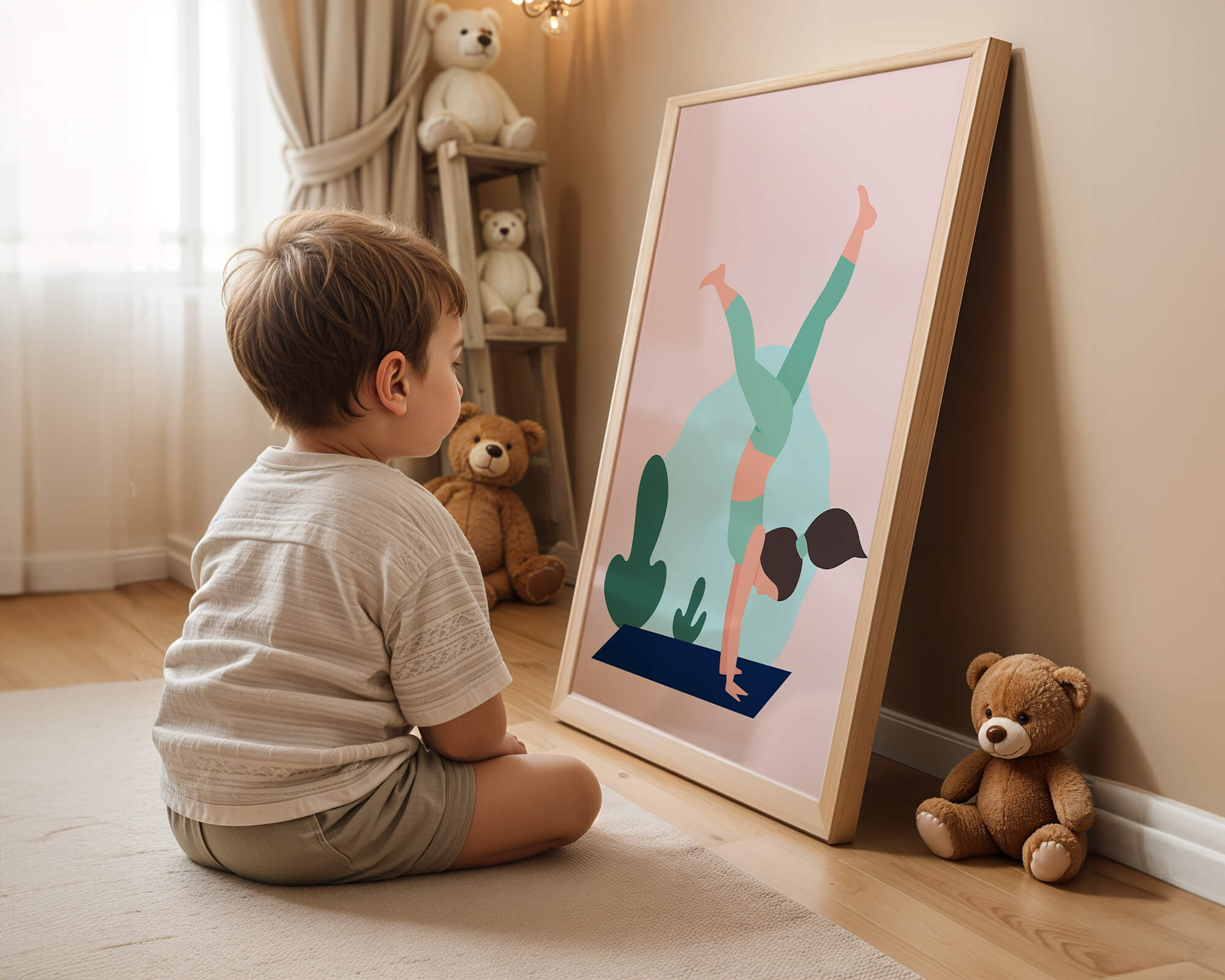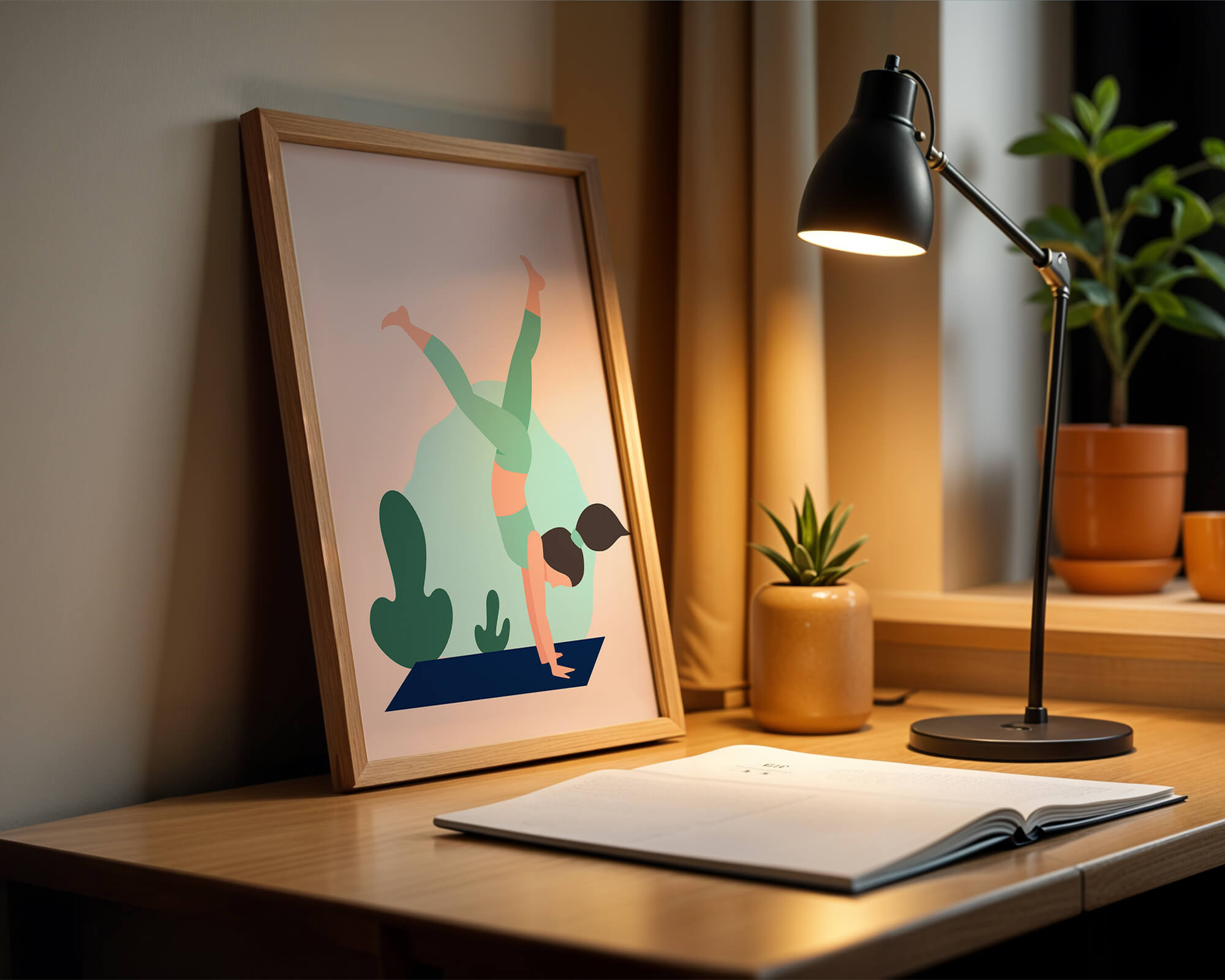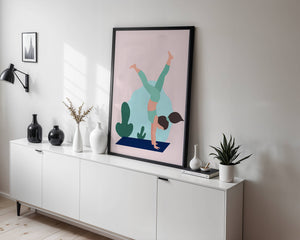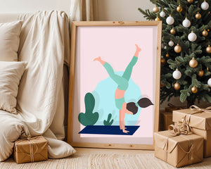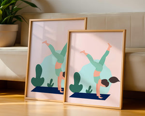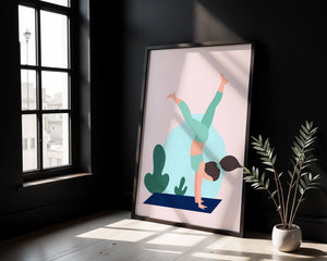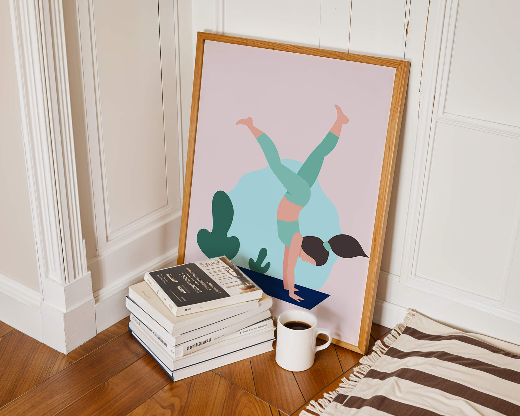 In this artwork, the woman is depicted in a handstand position, showcasing both her strength and balance. Her teal workout attire complements the deep blue of the yoga mat, and her ponytail is highlighted with a matching teal band. The background features abstract plant shapes in various shades of green, adding to the peaceful atmosphere of the scene.The overall composition conveys a message of inner peace and physical strength, making it an inspiring addition to any wellness-focused space. Its perfect for yoga enthusiasts who appreciate both the artistic representation of their practice and the tranquility it brings to their everyday life.| Type |