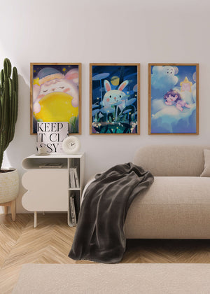 Las ilustraciones representan escenas llenas de ternura y fantasía que capturan la esencia de un mundo soñado por niños. El conejo y el niño parecen coexistir en un universo mágico, donde la luna y las estrellas sirven como telón de fondo, creando una atmósfera de tranquilidad y encanto. Estos diseños son ideales para decorar la habitación de los niños, aportando un toque de fantasía y color. Las ilustraciones capturan momentos de inocencia y sueños, perfectos para estimular la imaginación de los pequeños y proporcionarles un ambiente cálido y acogedor.| Type |