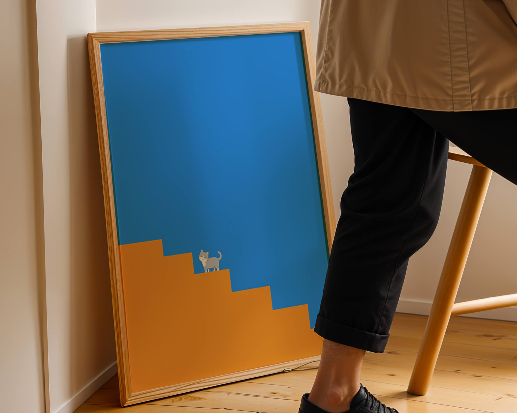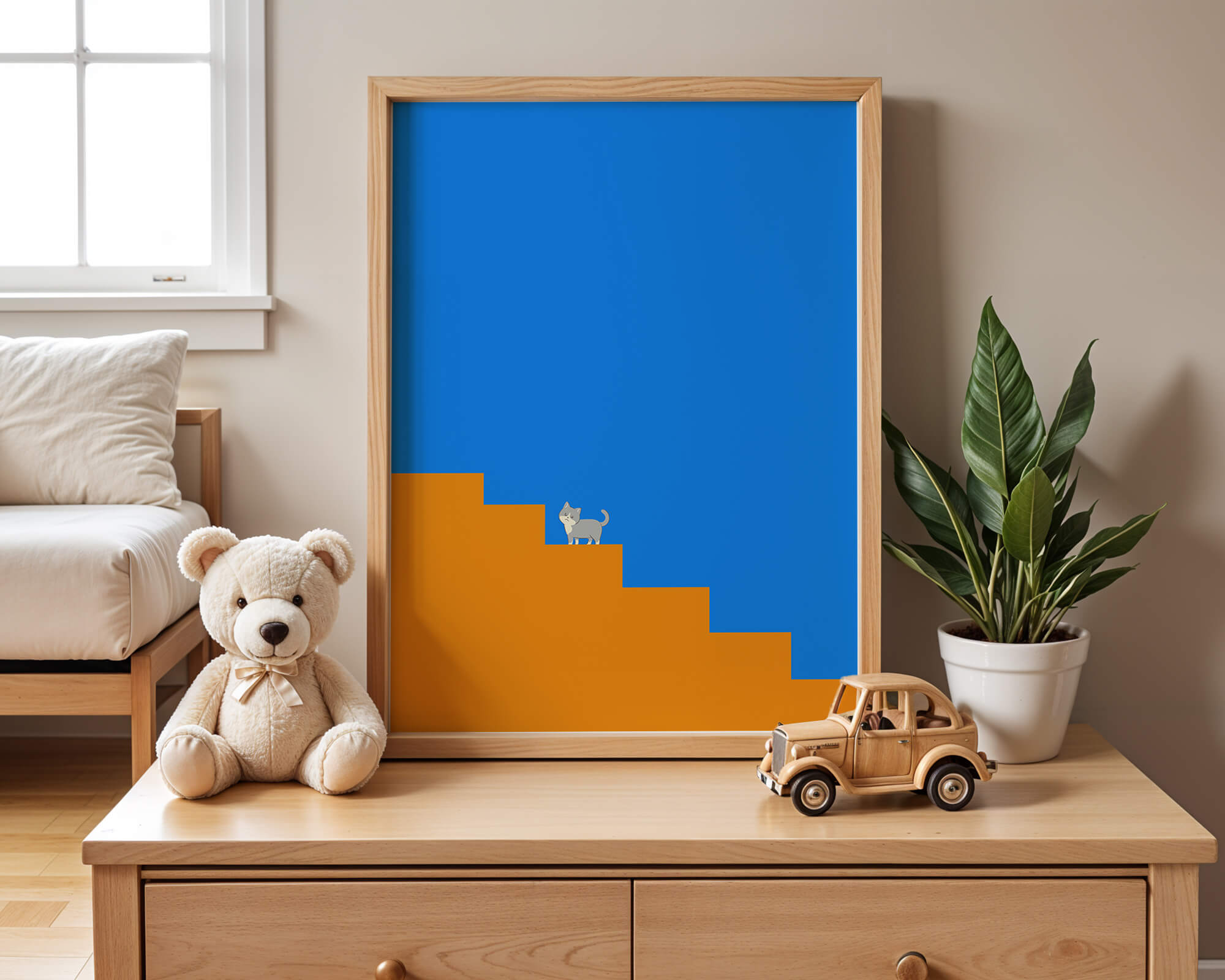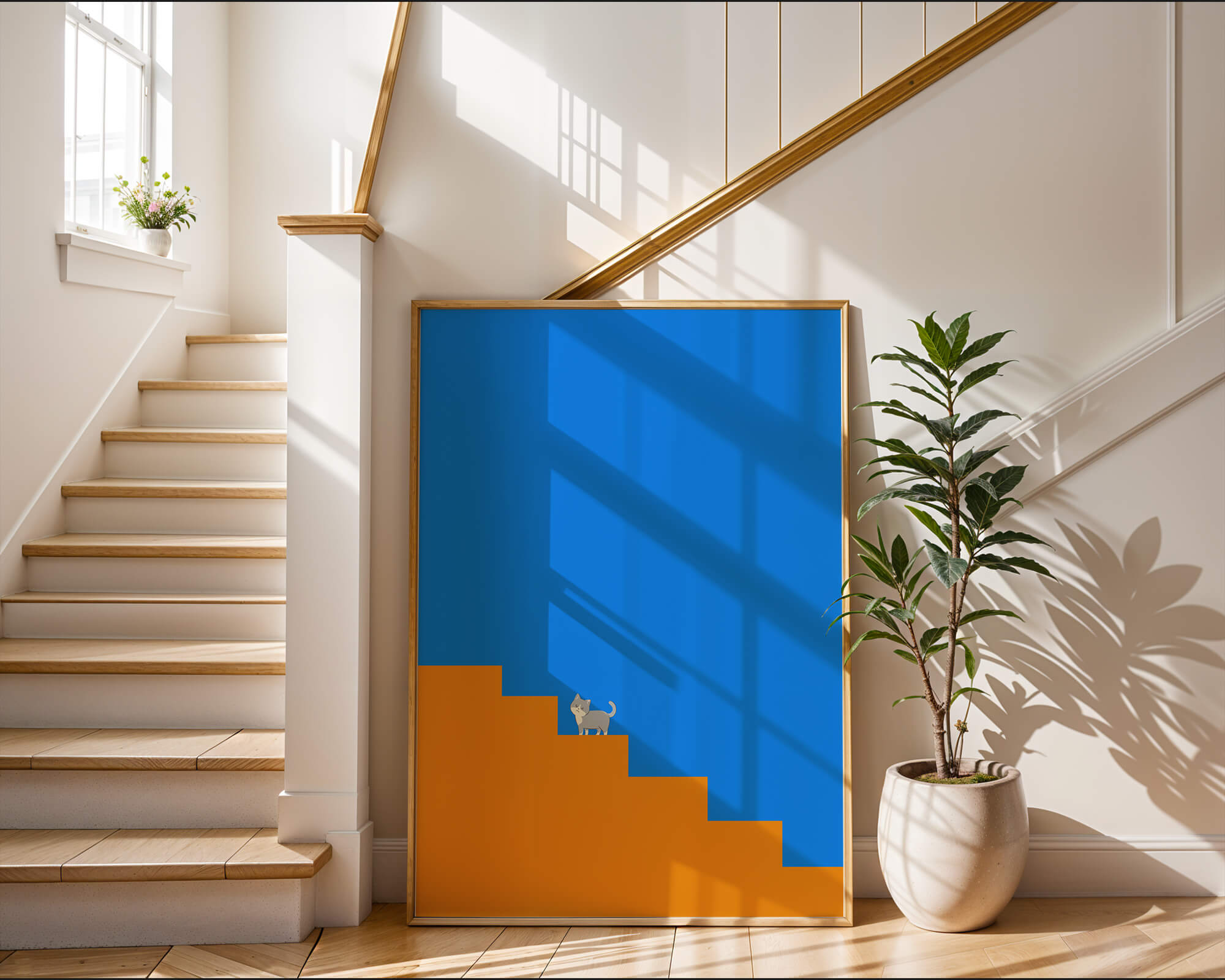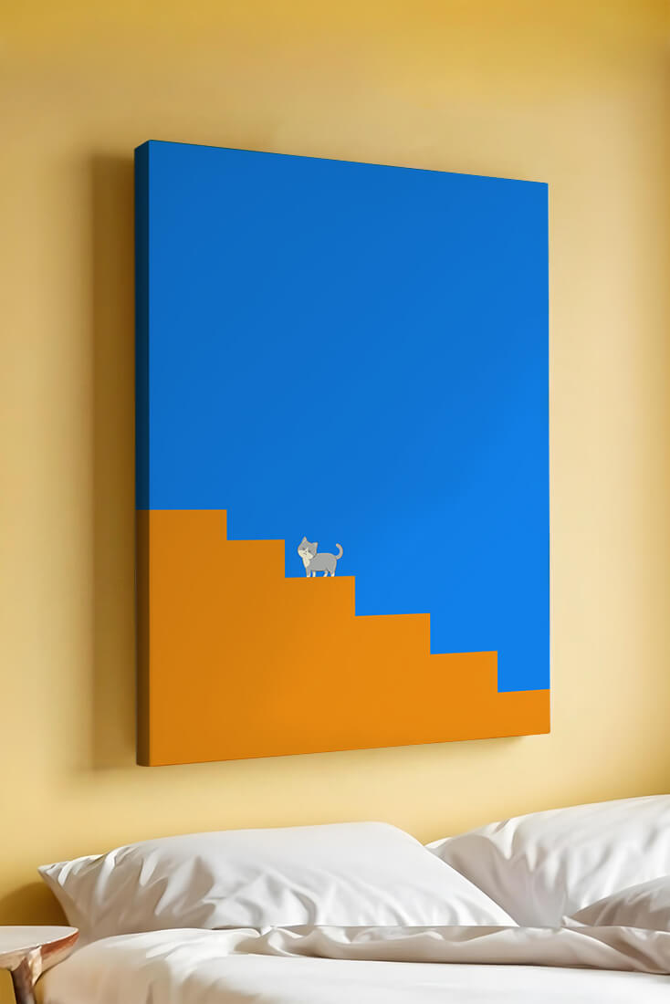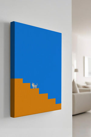 This captivating artwork merges simplicity with a playful sense, portraying a small gray and white cartoon cat climbing an orange stairway. The bright blue backdrop contributes an expansive, sky-like quality to the image, enhancing its visual appeal and making it stand out in any setting.The artworks balanced color palette and whimsical subject matter make it ideal for various rooms, from a lively living space to a cozy childrens room. Its modern and fun aesthetic can elevate any space, infusing it with warmth and personality. Whether youre an art enthusiast looking for something unique or someone who loves cats, this image is sure to bring joy and charm wherever it is displayed.| Type |