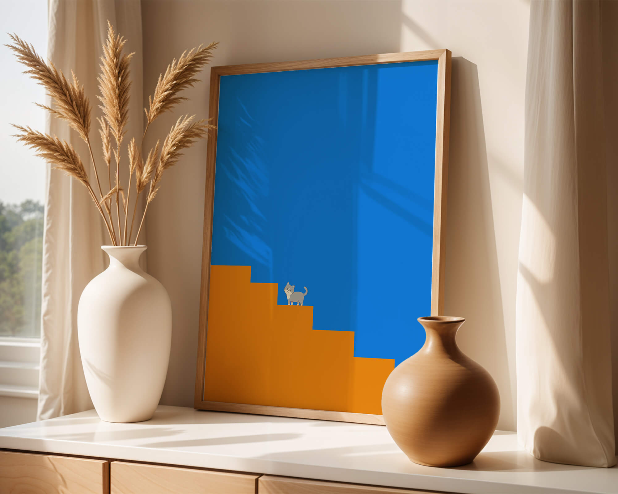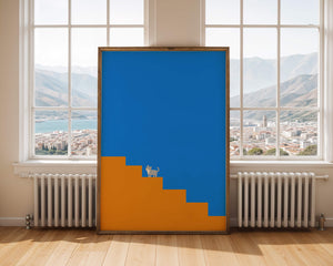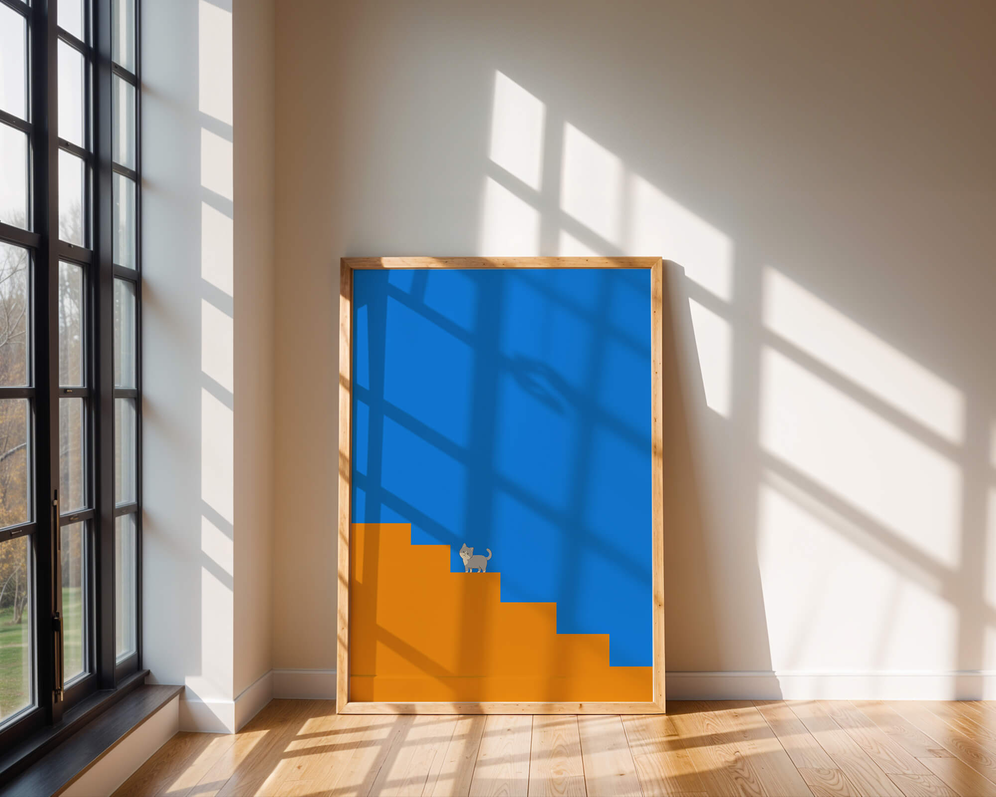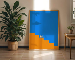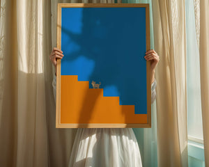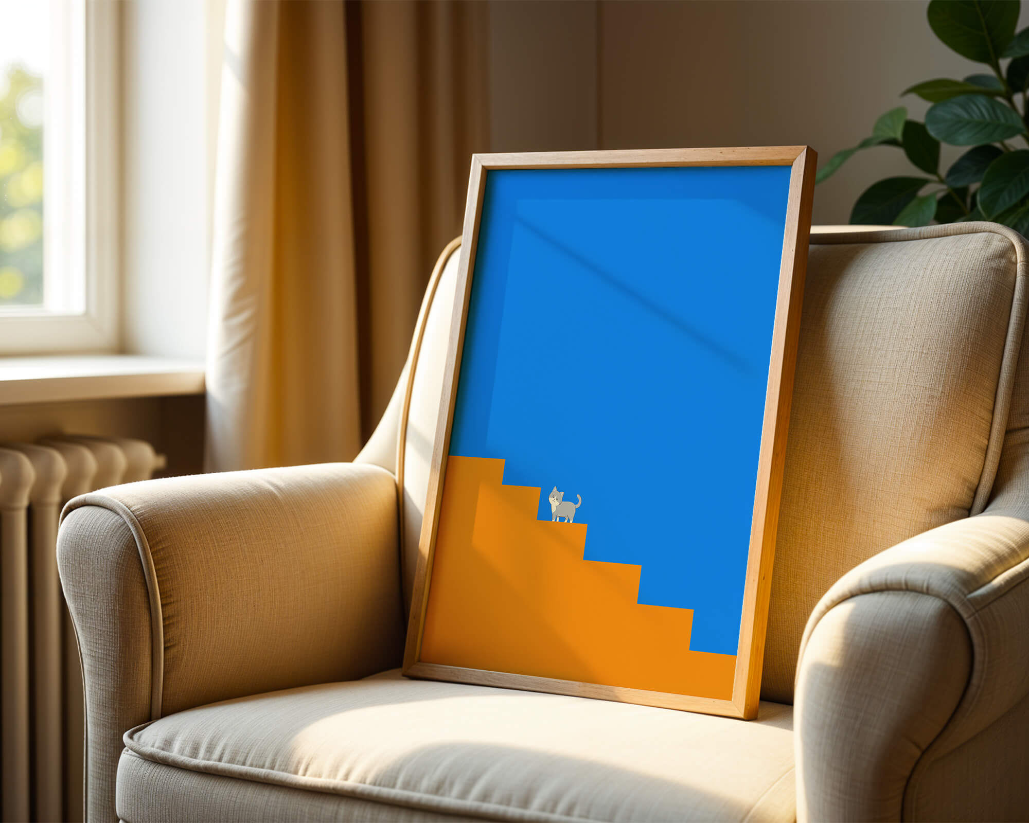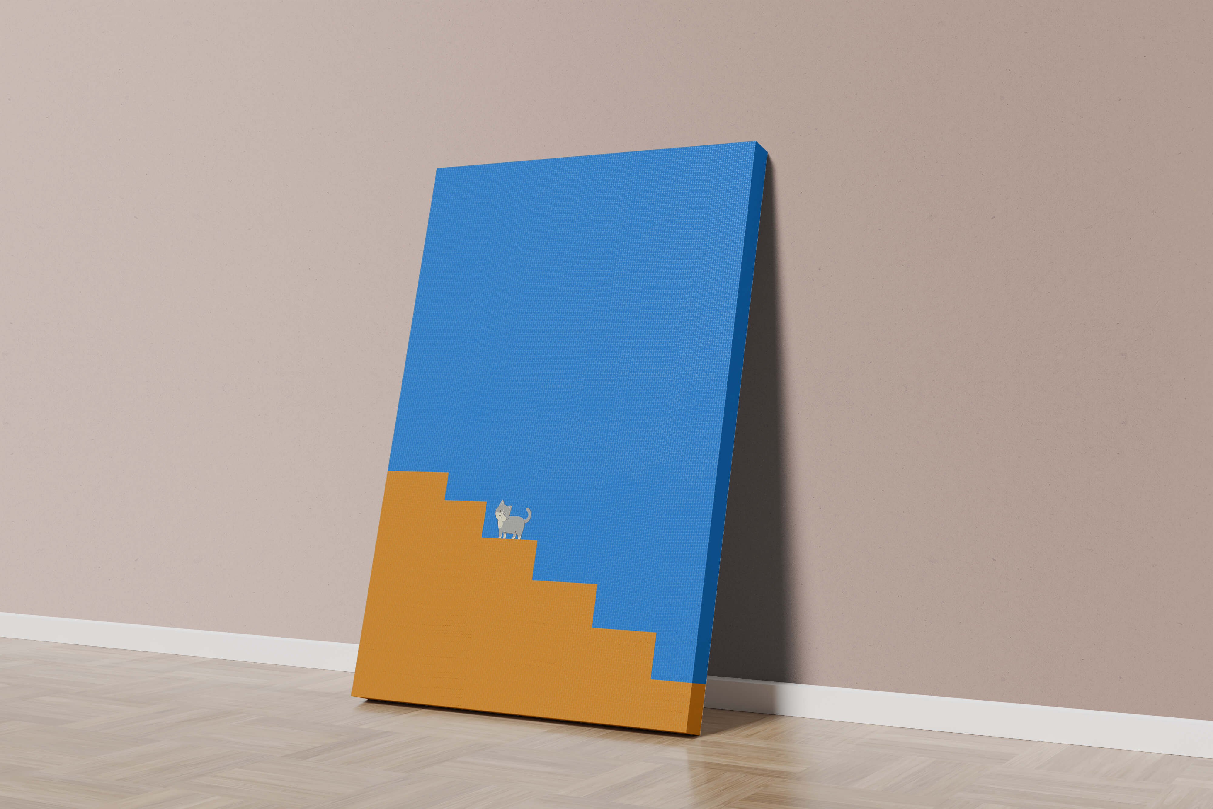 This captivating artwork merges simplicity with a playful sense, portraying a small gray and white cartoon cat climbing an orange stairway. The bright blue backdrop contributes an expansive, sky-like quality to the image, enhancing its visual appeal and making it stand out in any setting.The artworks balanced color palette and whimsical subject matter make it ideal for various rooms, from a lively living space to a cozy childrens room. Its modern and fun aesthetic can elevate any space, infusing it with warmth and personality. Whether youre an art enthusiast looking for something unique or someone who loves cats, this image is sure to bring joy and charm wherever it is displayed.| Type |