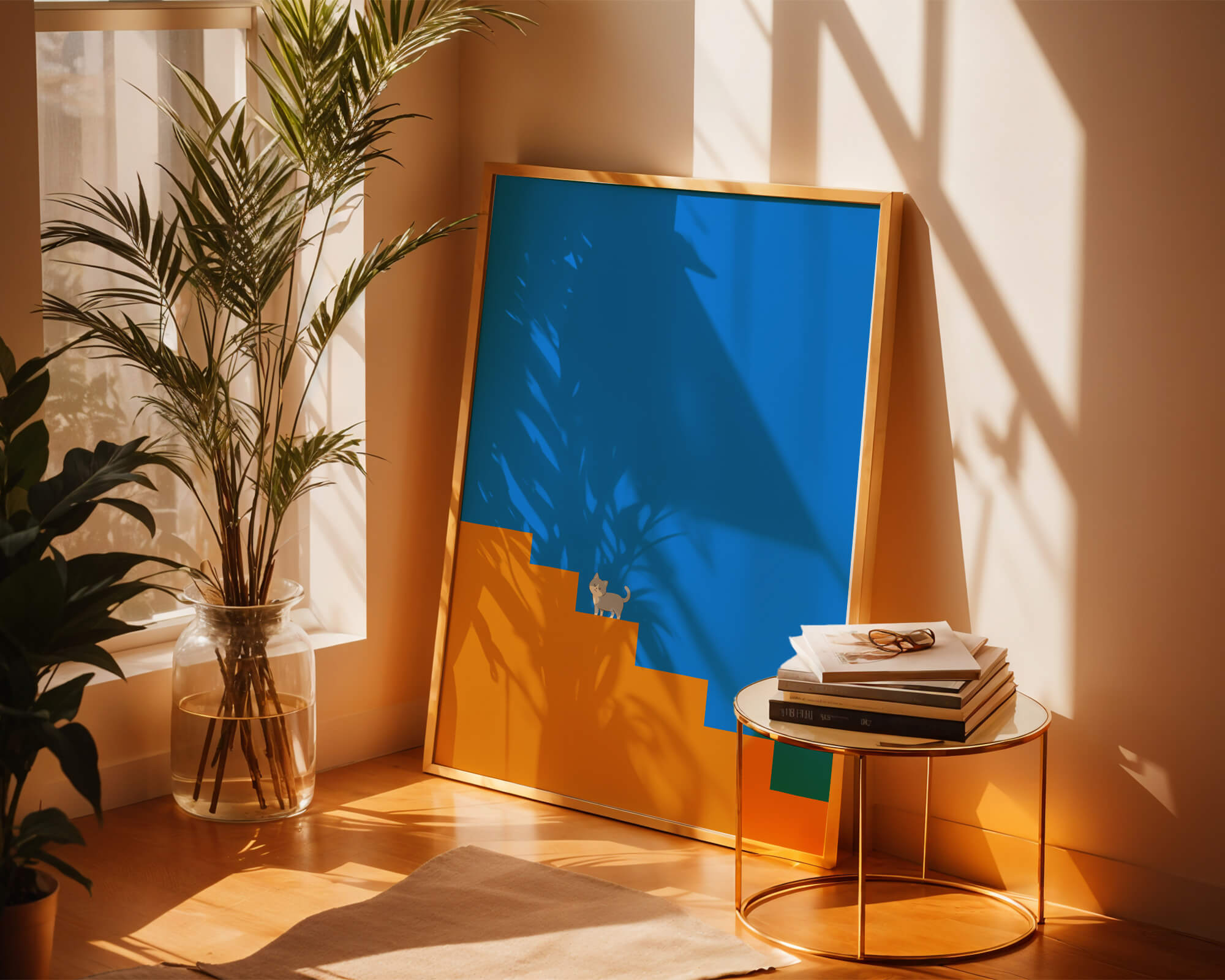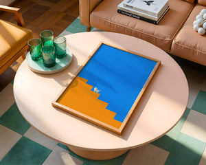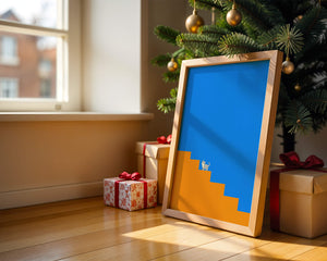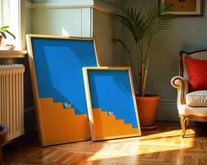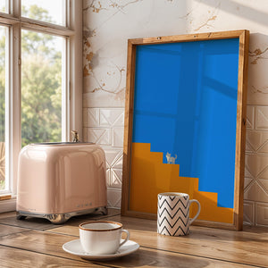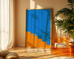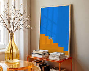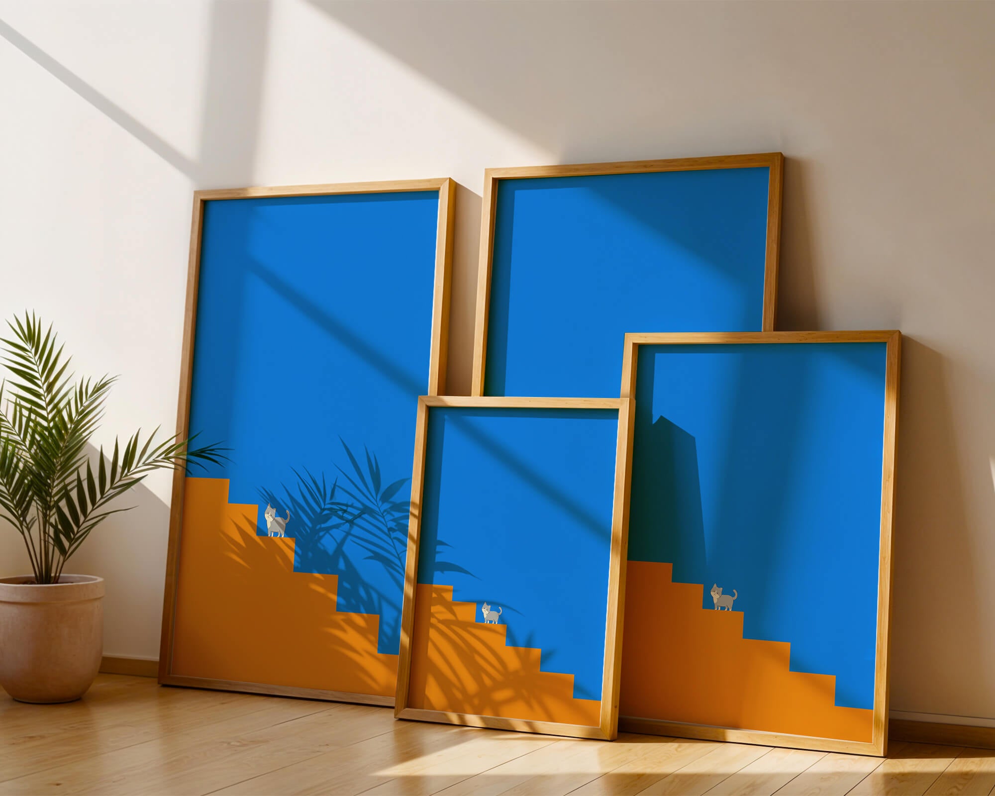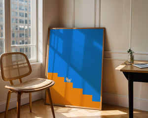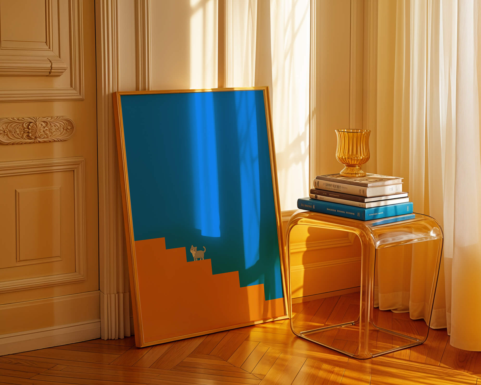 This captivating artwork merges simplicity with a playful sense, portraying a small gray and white cartoon cat climbing an orange stairway. The bright blue backdrop contributes an expansive, sky-like quality to the image, enhancing its visual appeal and making it stand out in any setting.The artworks balanced color palette and whimsical subject matter make it ideal for various rooms, from a lively living space to a cozy childrens room. Its modern and fun aesthetic can elevate any space, infusing it with warmth and personality. Whether youre an art enthusiast looking for something unique or someone who loves cats, this image is sure to bring joy and charm wherever it is displayed.| Type |