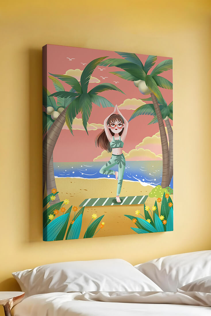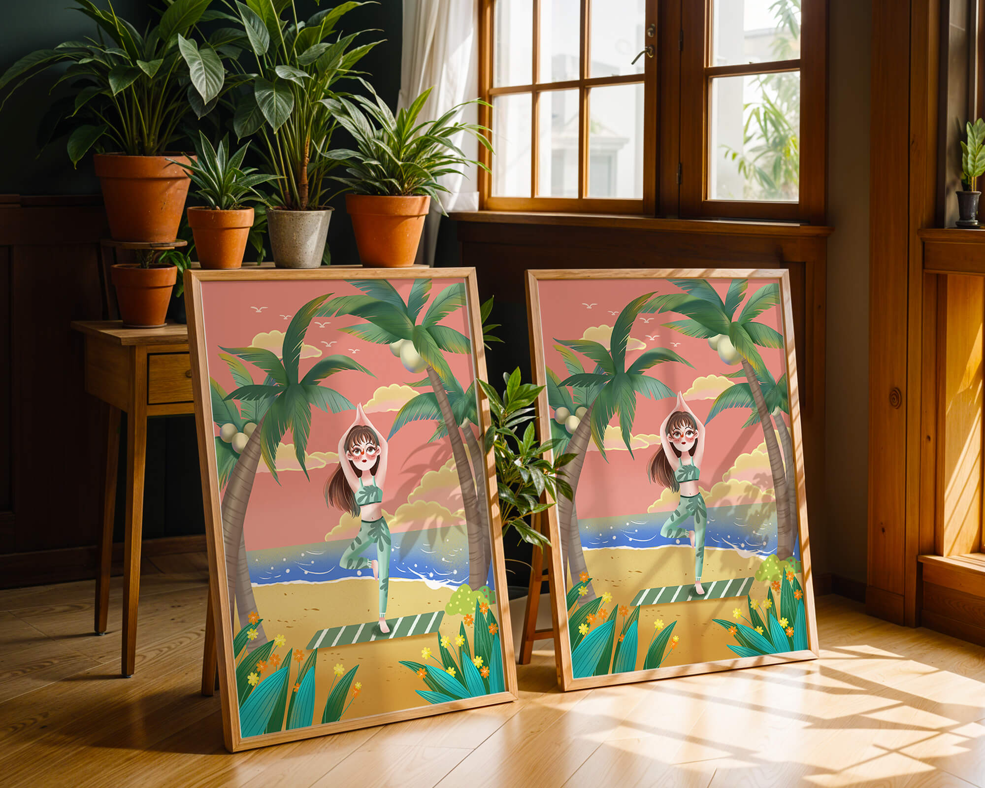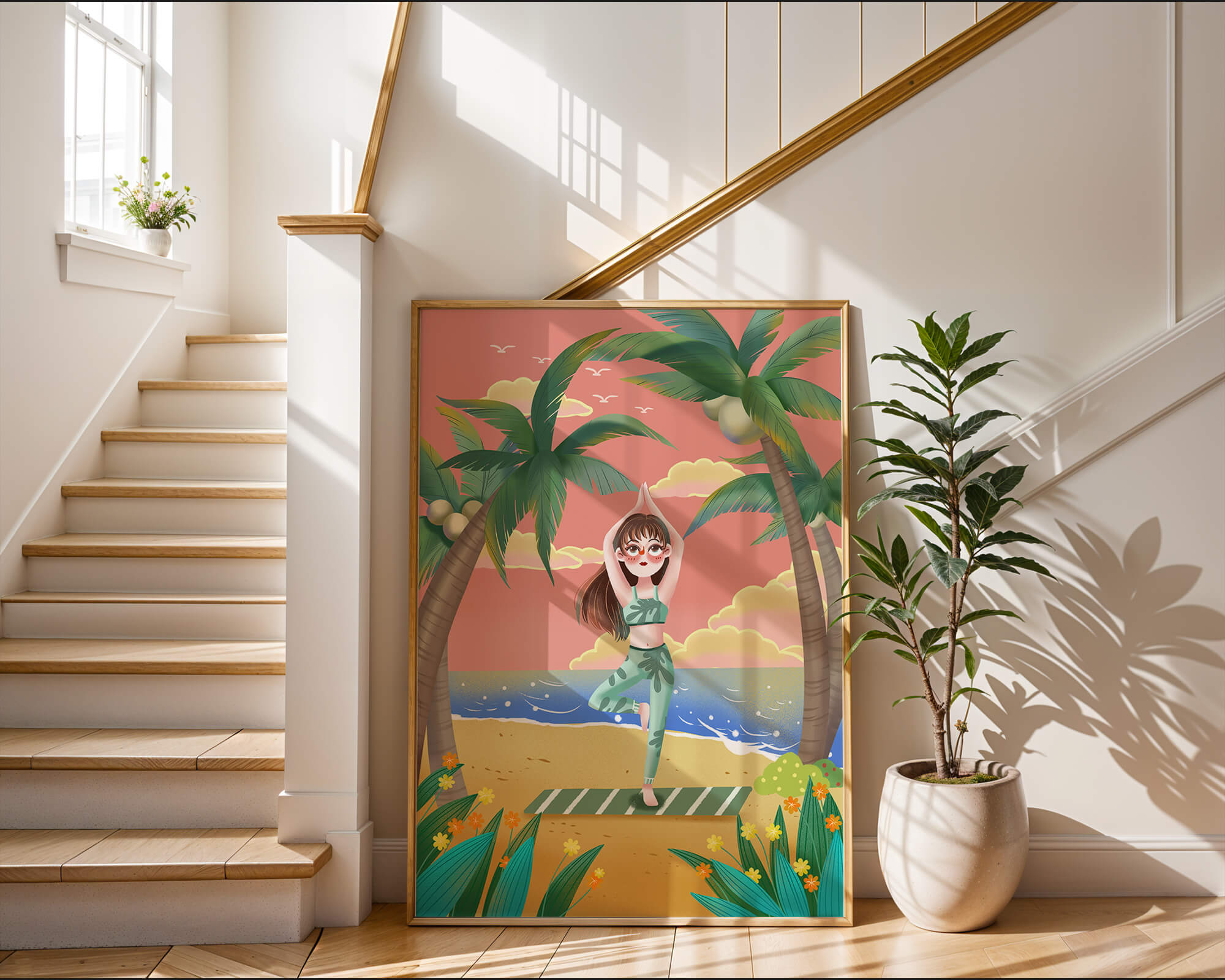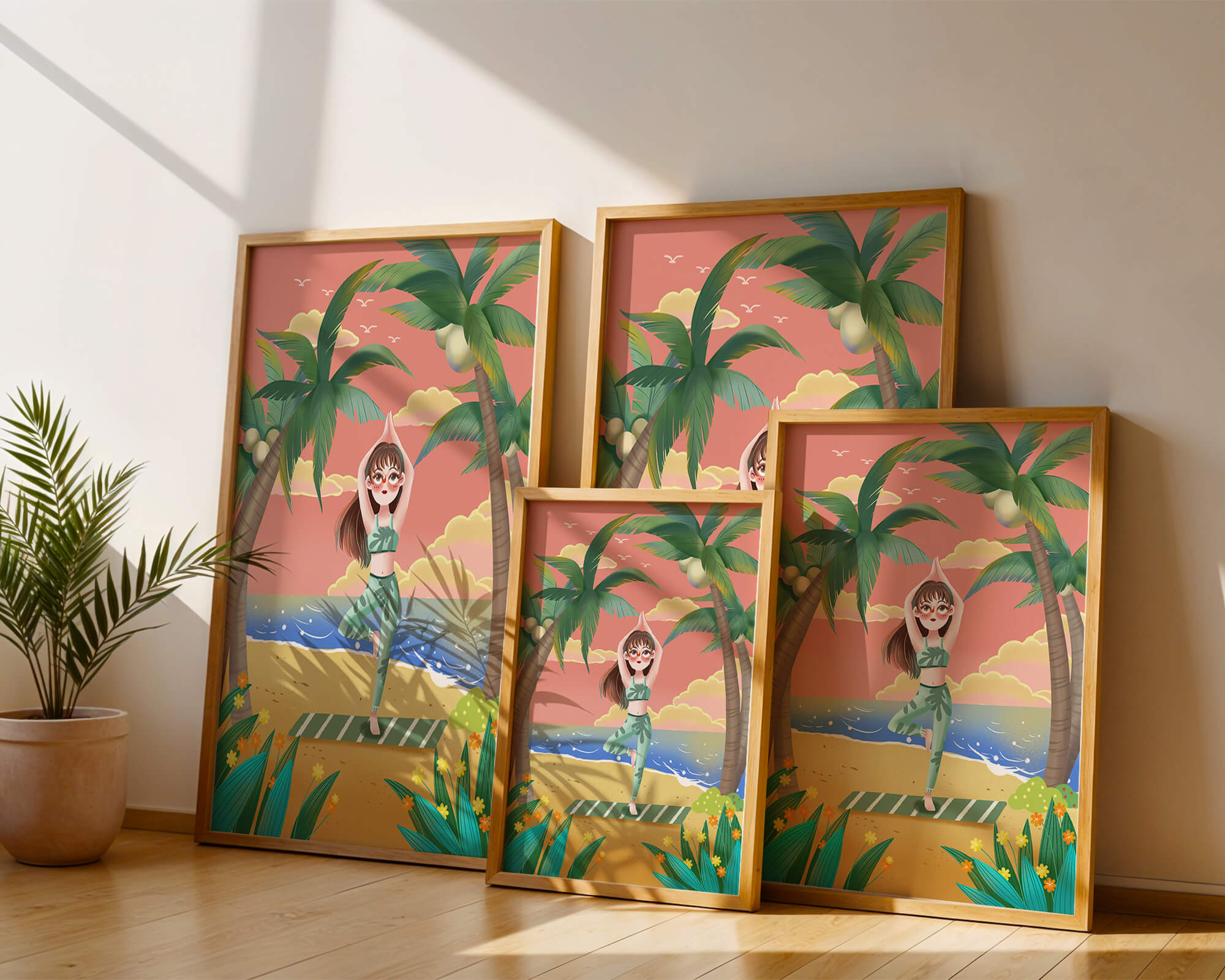 Experience tranquility and harmony with this idyllic beach scene, featuring a yoga practice amidst a stunning tropical sunset. The serene atmosphere invites relaxation and inner peace for both body and mind.