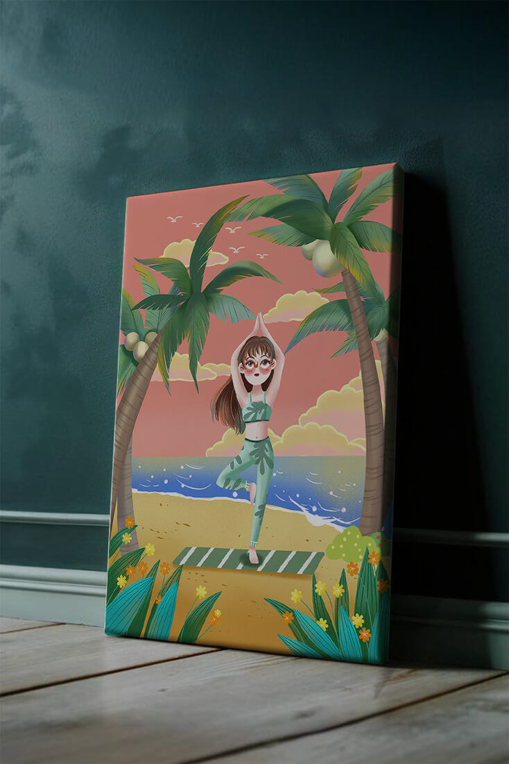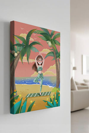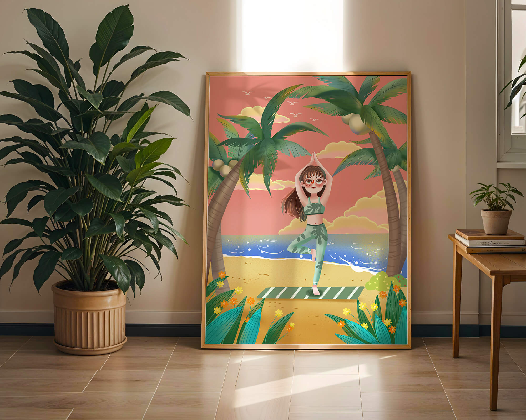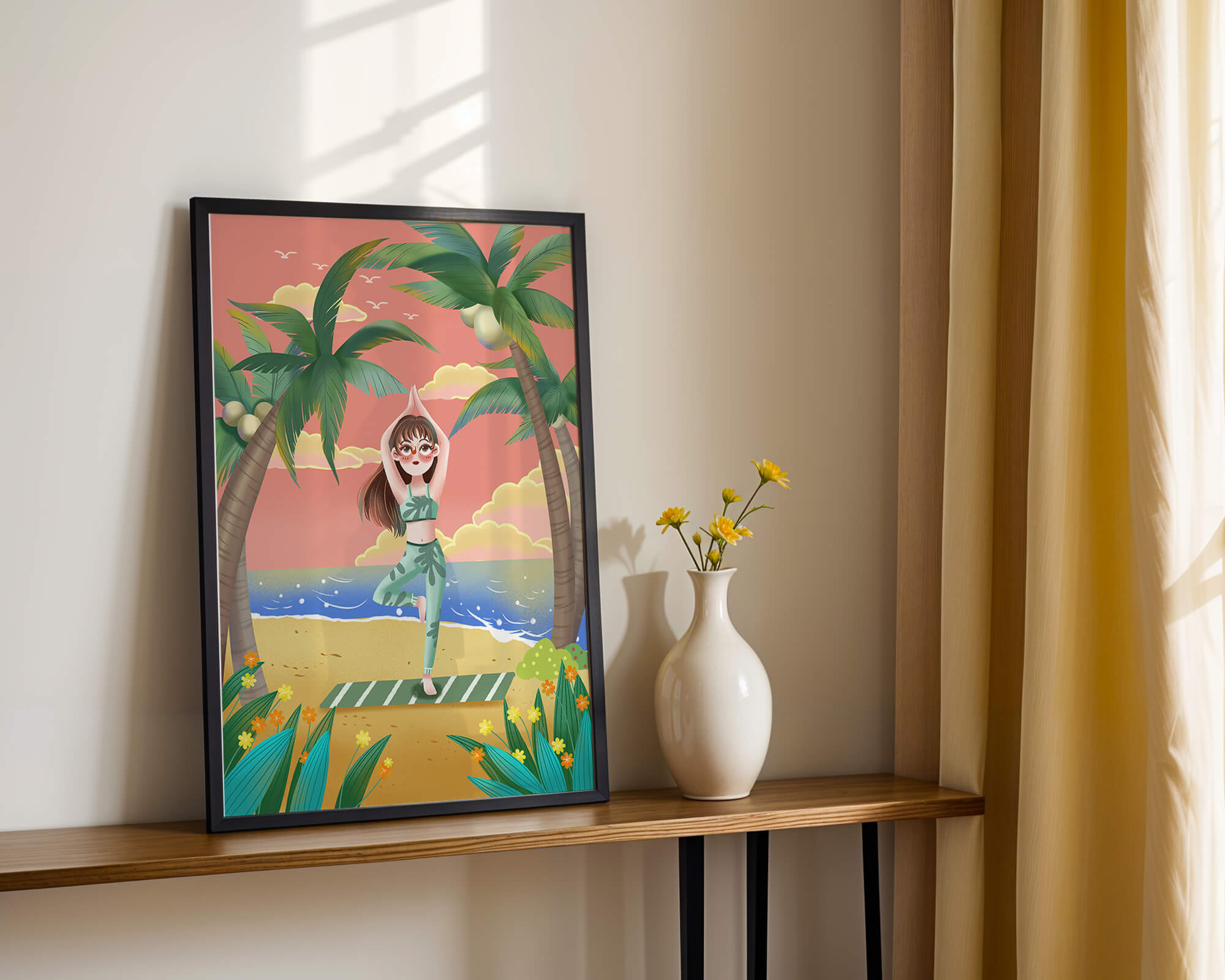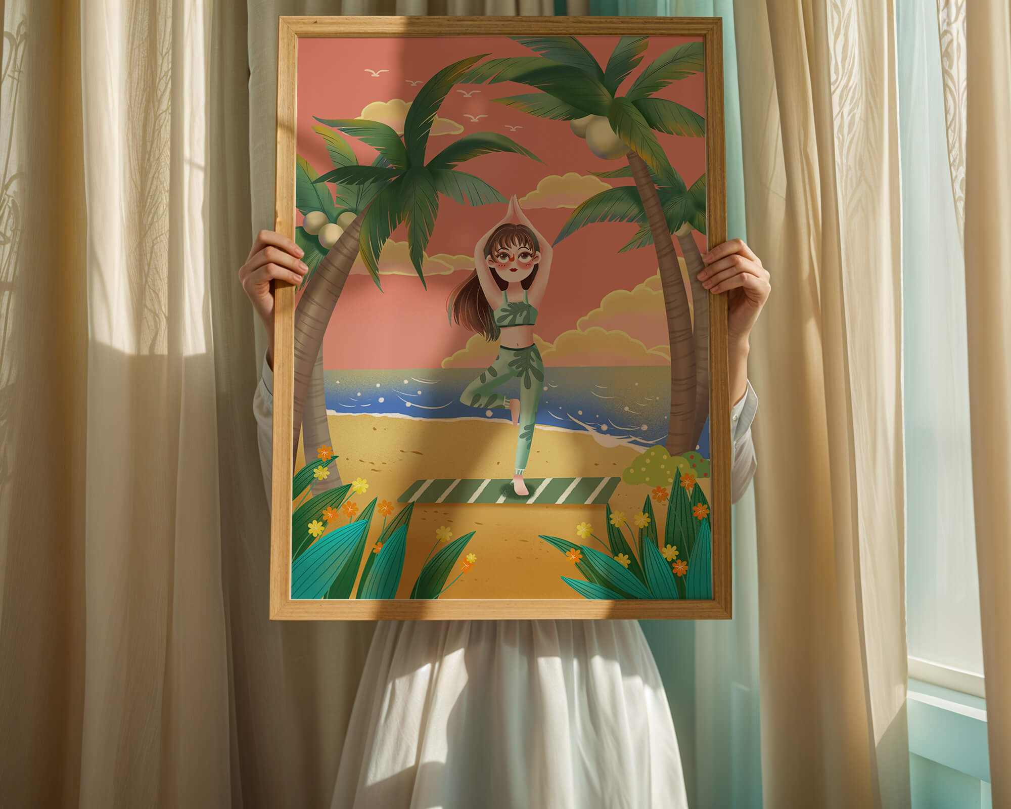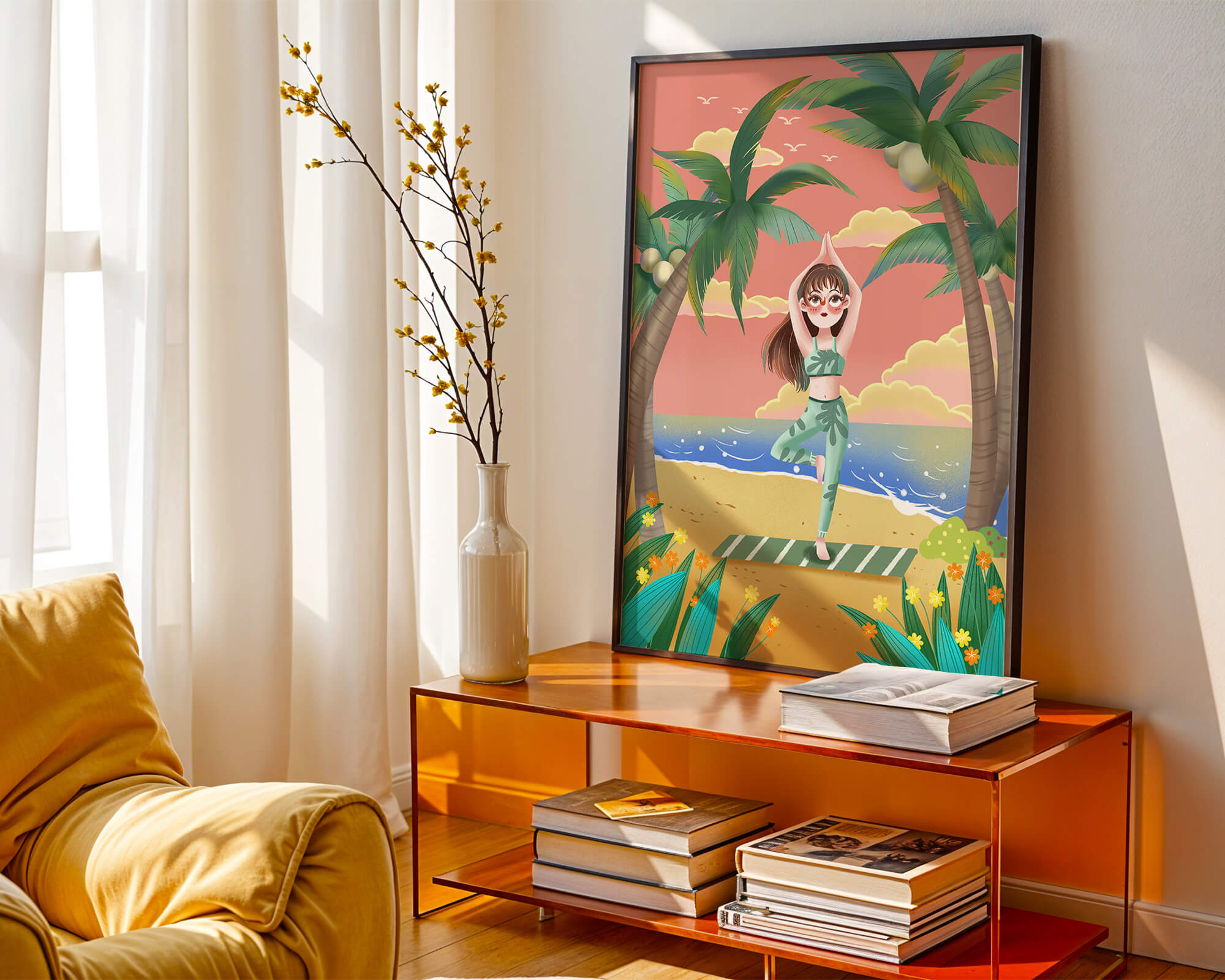Experience tranquility and harmony with this idyllic beach scene, featuring a yoga practice amidst a stunning tropical sunset. The serene atmosphere invites relaxation and inner peace for both body and mind.