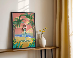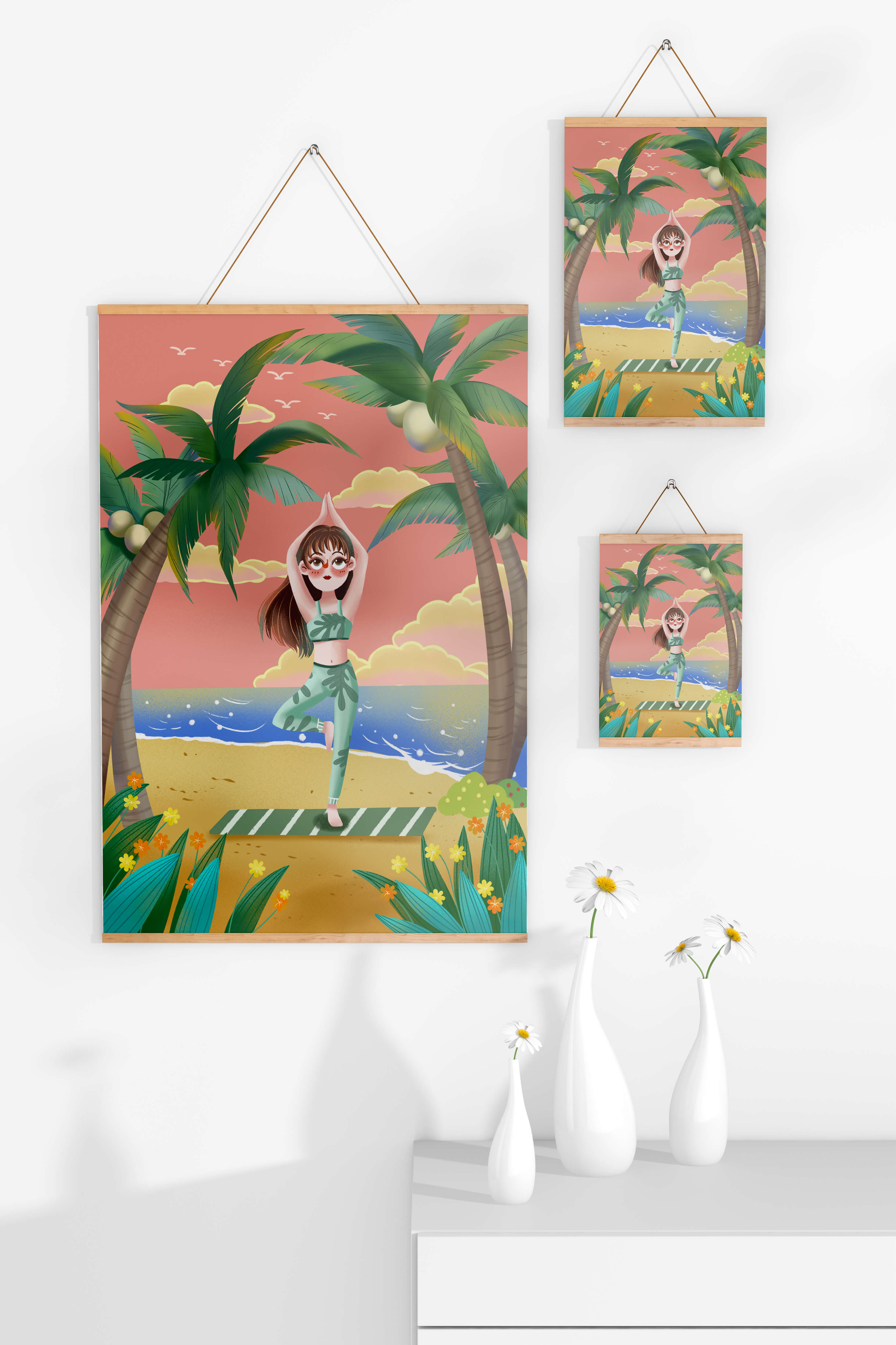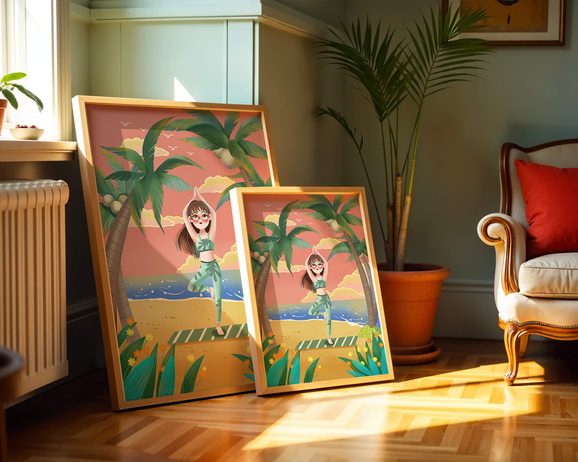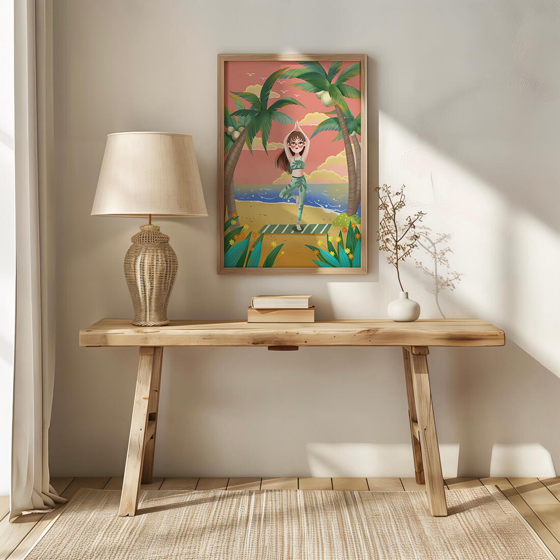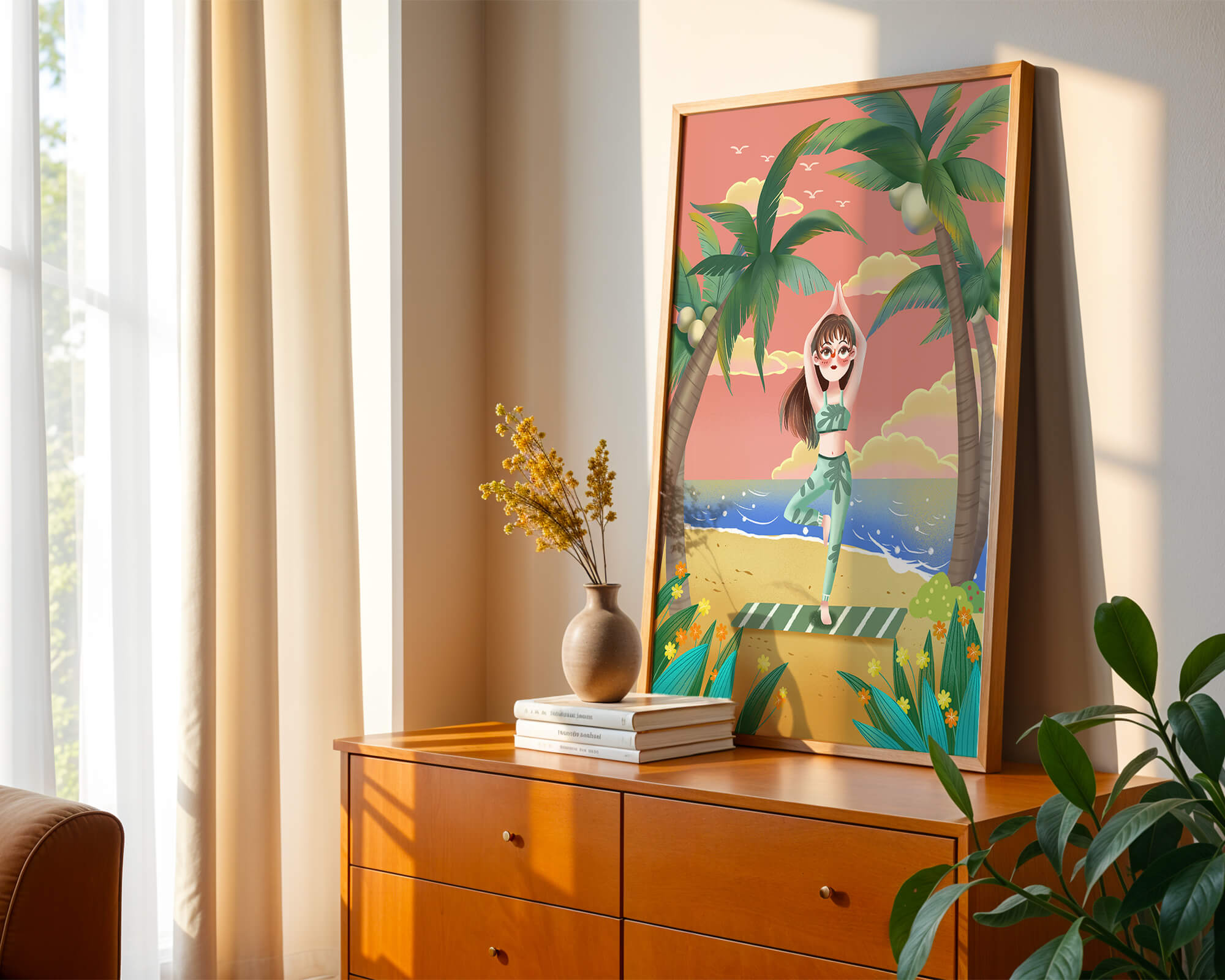 Experience tranquility and harmony with this idyllic beach scene, featuring a yoga practice amidst a stunning tropical sunset. The serene atmosphere invites relaxation and inner peace for both body and mind.