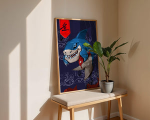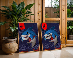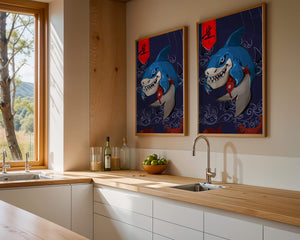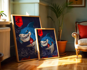 In the center of the composition, the cartoon shark stands out with its lively colors and exaggerated features, capturing a sense of fun and imagination. Its charming expression is complemented by the intricate red banner and swirling wave patterns surrounding it, creating a dynamic sense of movement.The use of bold colors and playful design elements brings the artwork to life, making it suitable for a variety of settings, especially spaces designed for children or those looking to add a touch of the sea to their decor. The illustrations nautical theme is accentuated by the presence of smaller fish and abstract ocean elements, adding depth and detail to the overall piece.| Type |
