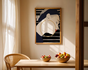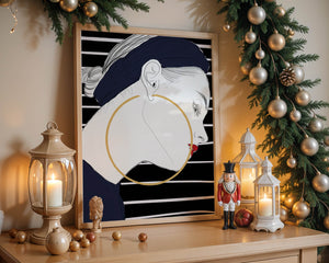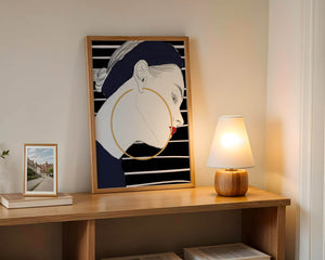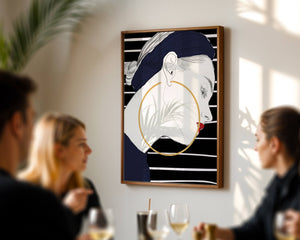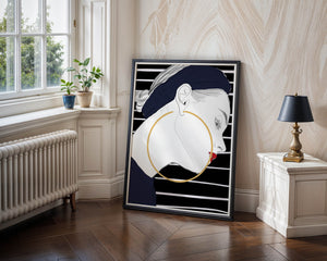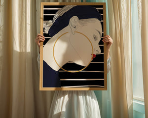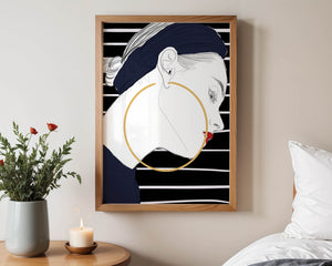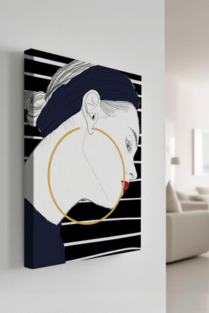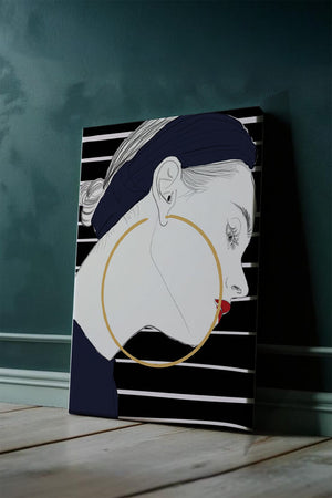The artwork showcases a minimalist yet impactful design, focusing on the sharp lines and contrasts that bring out the elegance of the subject. The gold hoop earrings serve as a striking focal point, adding an element of luxury to the composition. The womans headscarf, adorned with black stripes, complements her overall chic appearance.With its bold use of colors and clean lines, this piece embodies a contemporary aesthetic that appeals to fashion-forward individuals. The red lips provide a vibrant touch, making the artwork not only a visual delight but also a celebration of style and individuality.| Type |