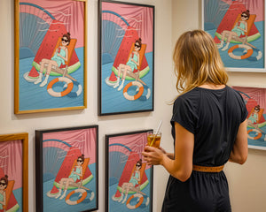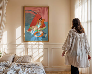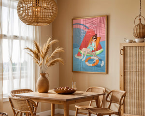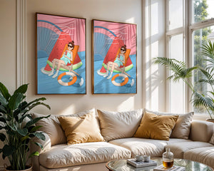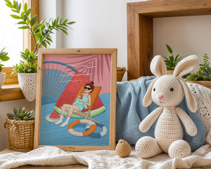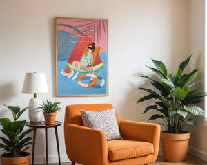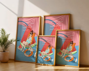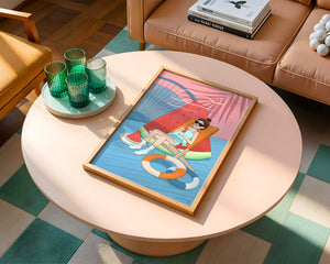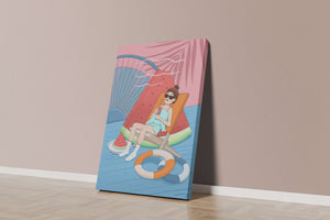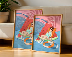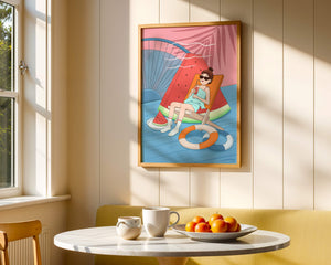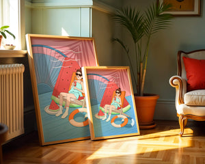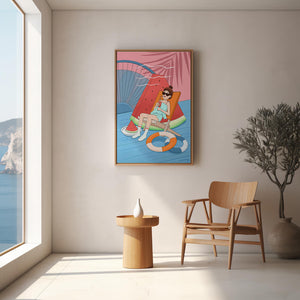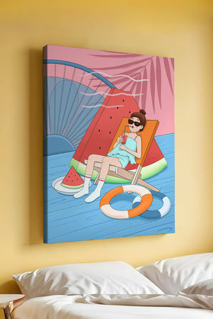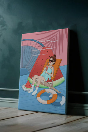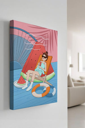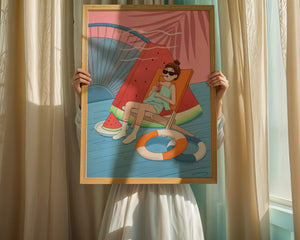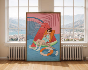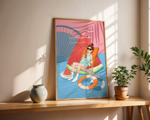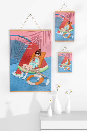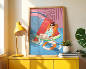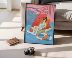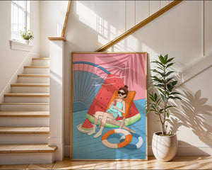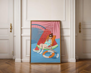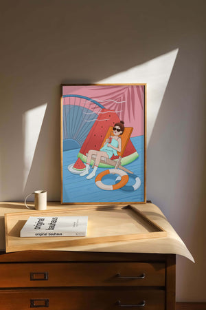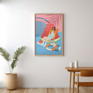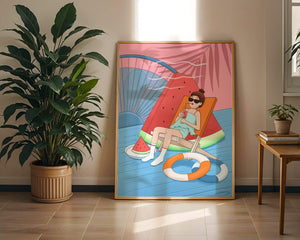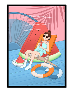 This vibrant illustration captures the essence of summer relaxation by the poolside. A joyful scene unfolds where a person lounges on a chair resembling a slice of watermelon, enjoying a cool drink under the bright sun.The background showcases a serene pool and a large wheel, adding a playful touch to this artistic composition. The combination of vivid colors such as pink, blue, and orange, along with elements like a life ring and palm fronds, evokes a sense of leisure and tropical delight. Perfect for bringing a splash of summer into any space.