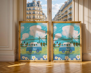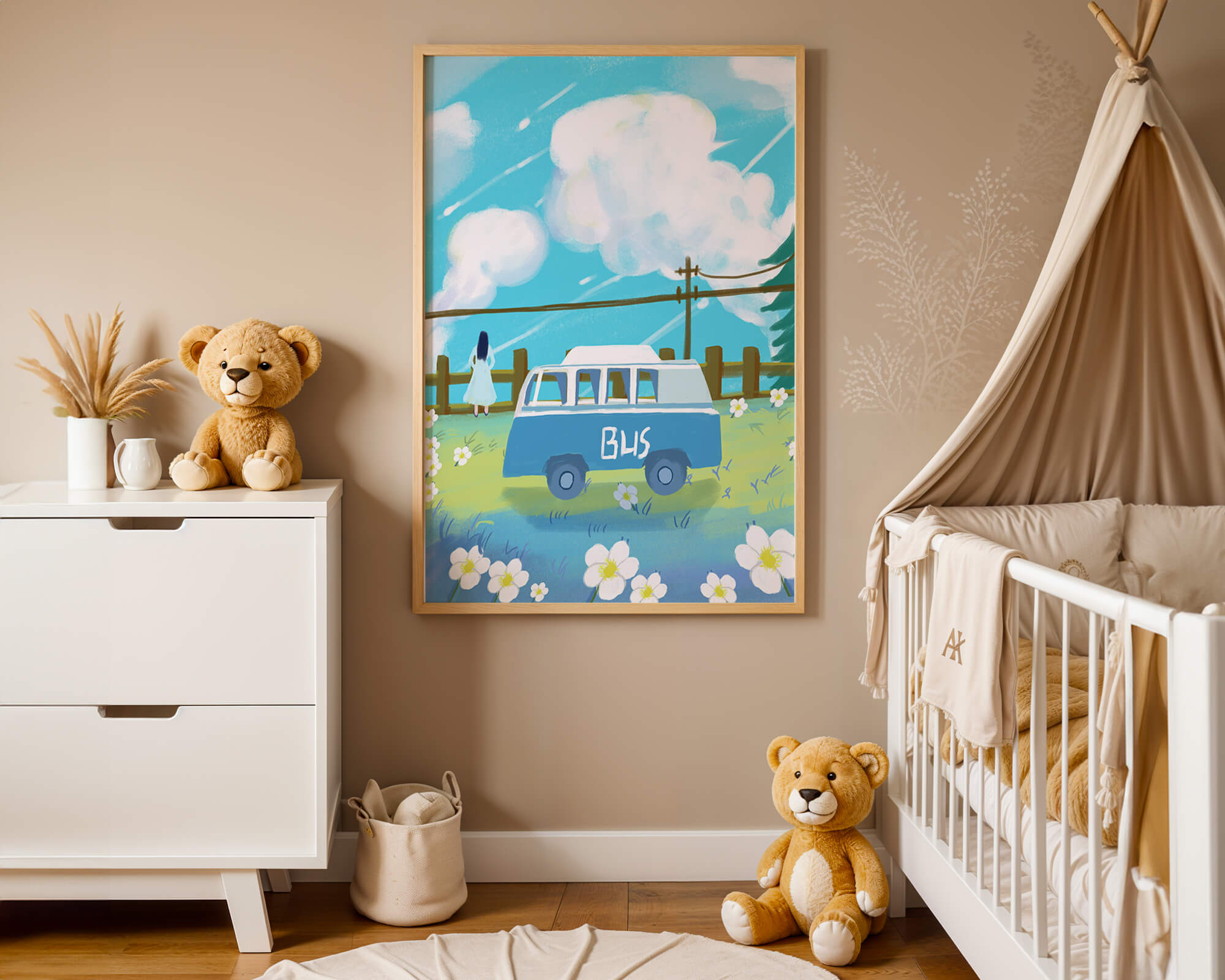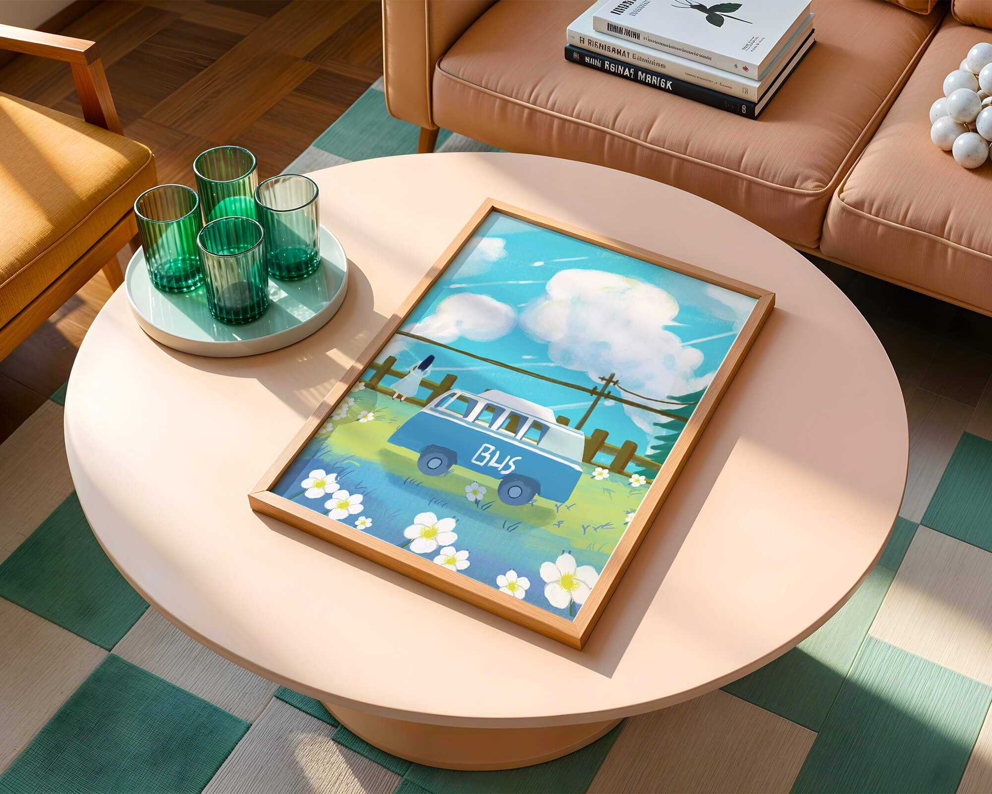 Scenic Illustration with Blue Bus and Blossoming Meadow