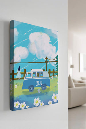 This illustration captures a serene outdoor scene featuring a blue bus on a blossoming meadow, with a backdrop of fluffy clouds and clear sky. A woman stands by a fence, enhancing the peaceful landscape with a sense of human presence.