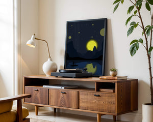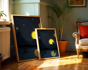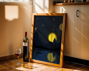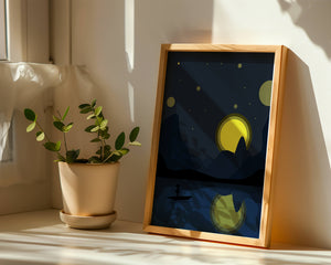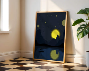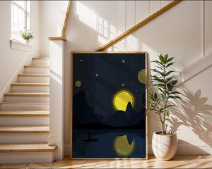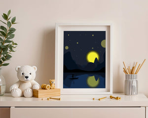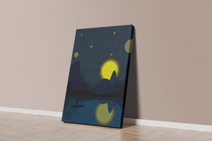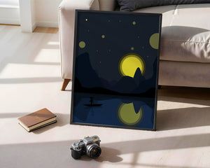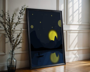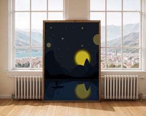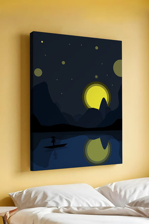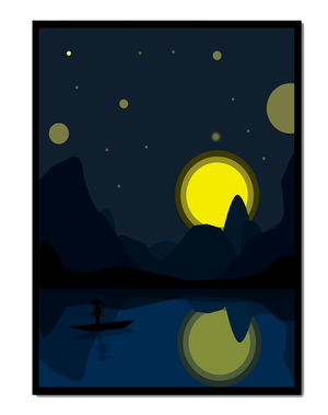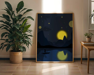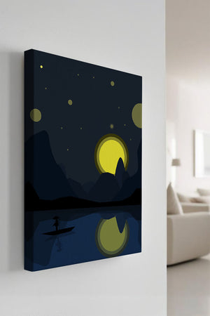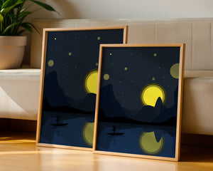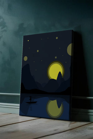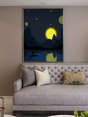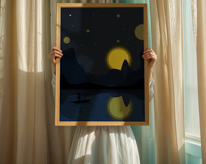 The image showcases a calm river beneath a starlit sky, where the full moon casts its golden glow onto the landscape. The dark silhouettes of distant mountains and a lone boatman navigating the waters contribute to the serene atmosphere. Dotted with small stars, the night sky offers a peaceful backdrop, which is complemented by the reflective surface of the water in the foreground.This scene, with its minimalist use of color and form, creates an artistic expression of nighttime beauty. The use of deep blues and greens along with the contrasting bright moon adds depth and intrigue, making it a perfect piece for enhancing the ambiance of a bedroom, living room, or study. Its calming presence and simple elegance make it an ideal choice for those who appreciate modern, nature-in| Type |