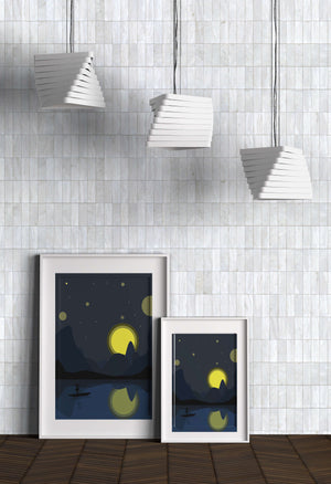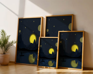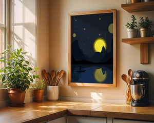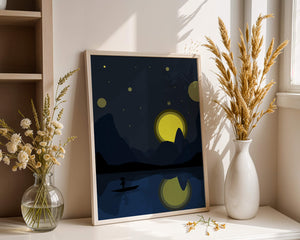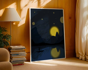 A tranquil night scene captures the essence of serenity with moonlit reflections and a silhouetted boat against a dazzling sky. This illustration brings a sense of calm and modern elegance to any space.