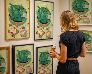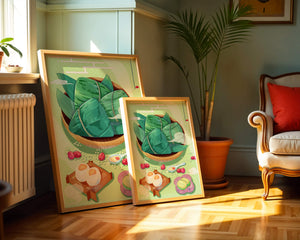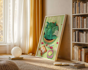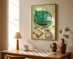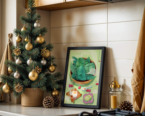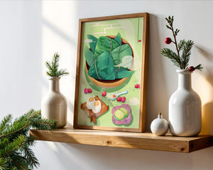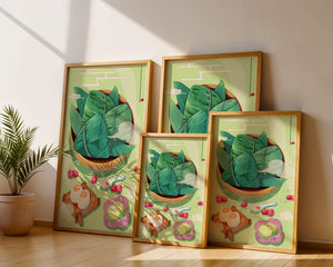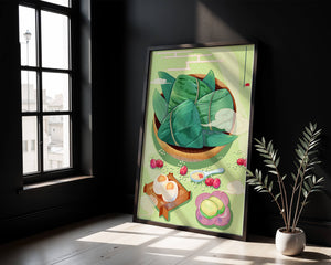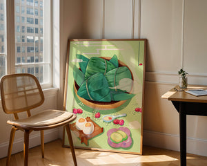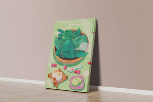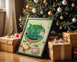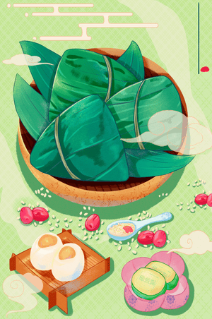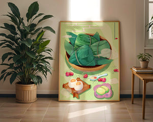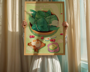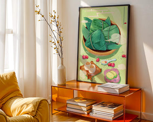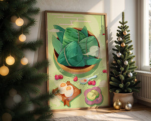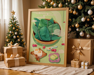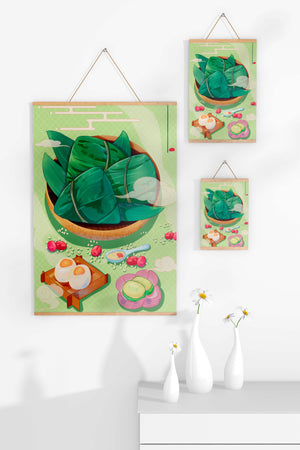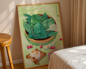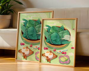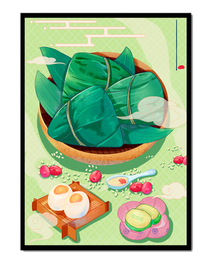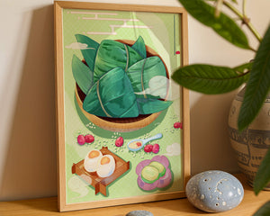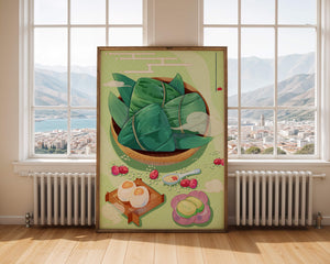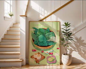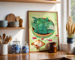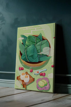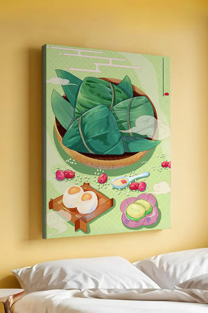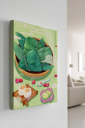 This vibrant illustration captures the essence of traditional Asian cuisine. Set against a patterned green background, the artwork features rice dumplings wrapped in leaves, mooncakes, and various festive ingredients, creating a harmonious blend of color and tradition.