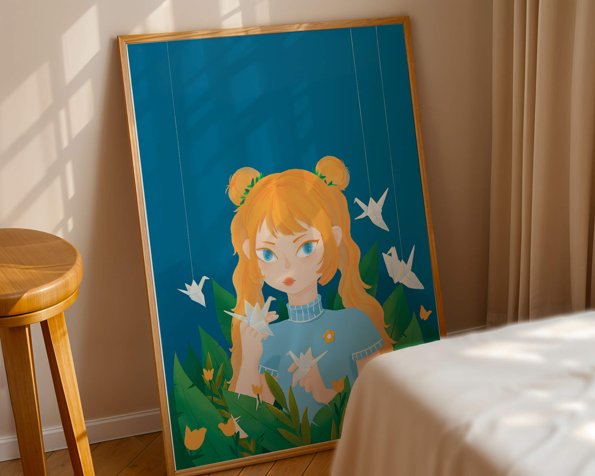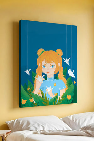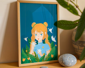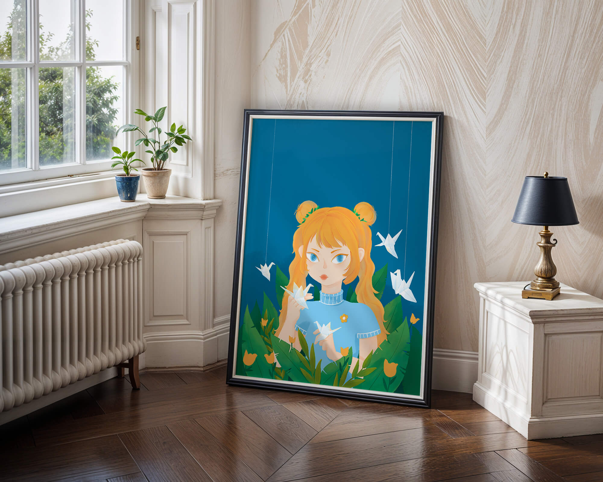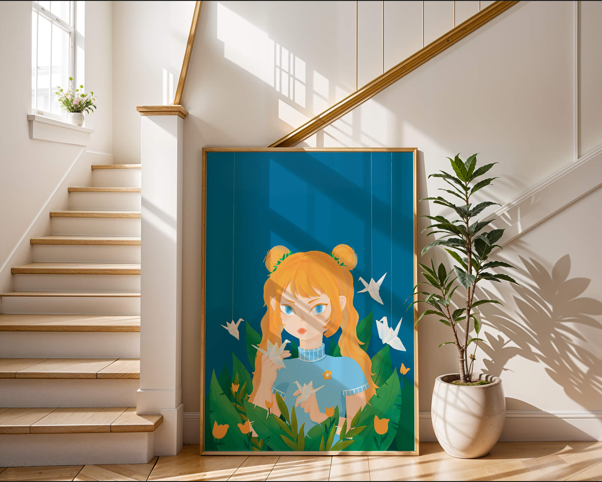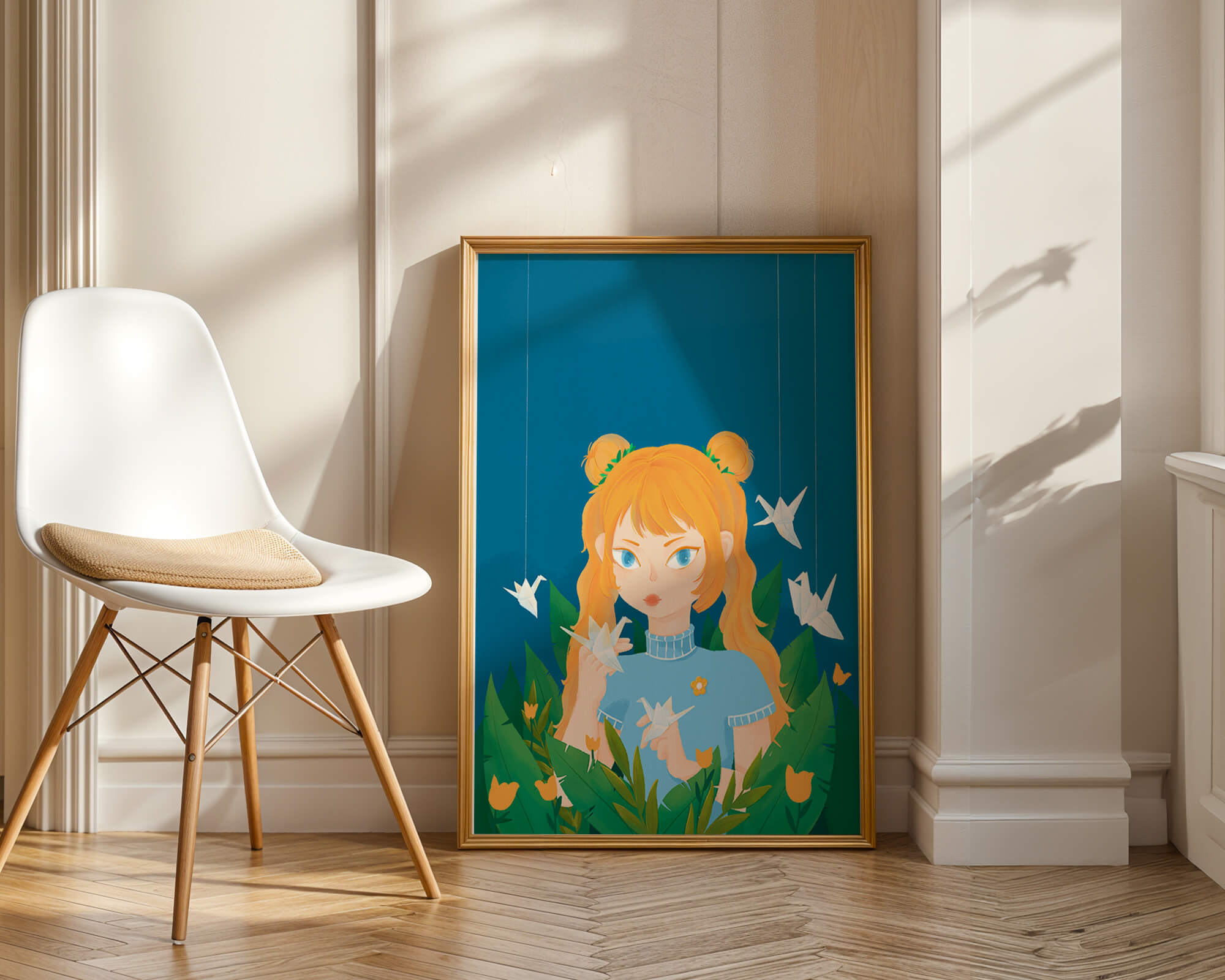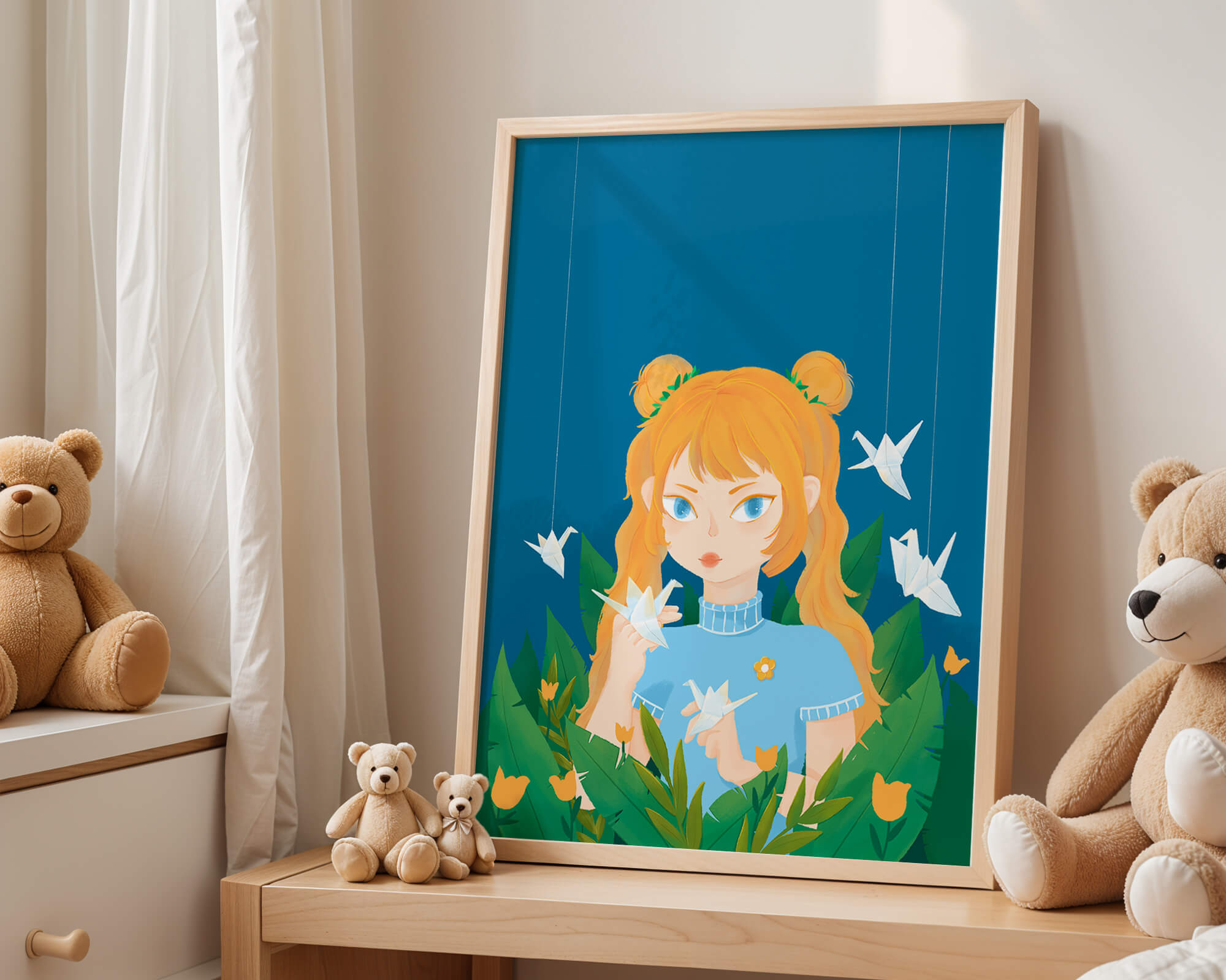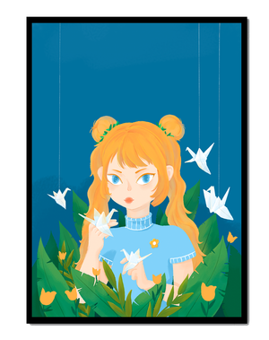 This charming illustration captures a young girl enveloped in a whimsical scene adorned with origami cranes and verdant foliage. Her vibrant orange hair and blue clothing draw the eye, creating a striking contrast against the deep blue background.The girl holds an origami crane in her hand, surrounded by lush leaves and small yellow flowers, conjuring a sense of playfulness and creativity. The suspended origami cranes add a dynamic element to the portrait, giving it an enchanting and youthful vibe. This artwork would make a delightful addition to any room, bringing a touch of color and fantasy to your decor.