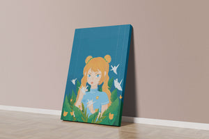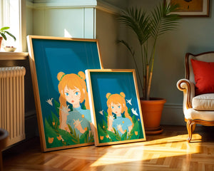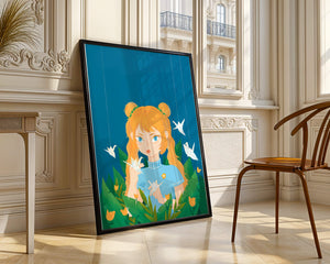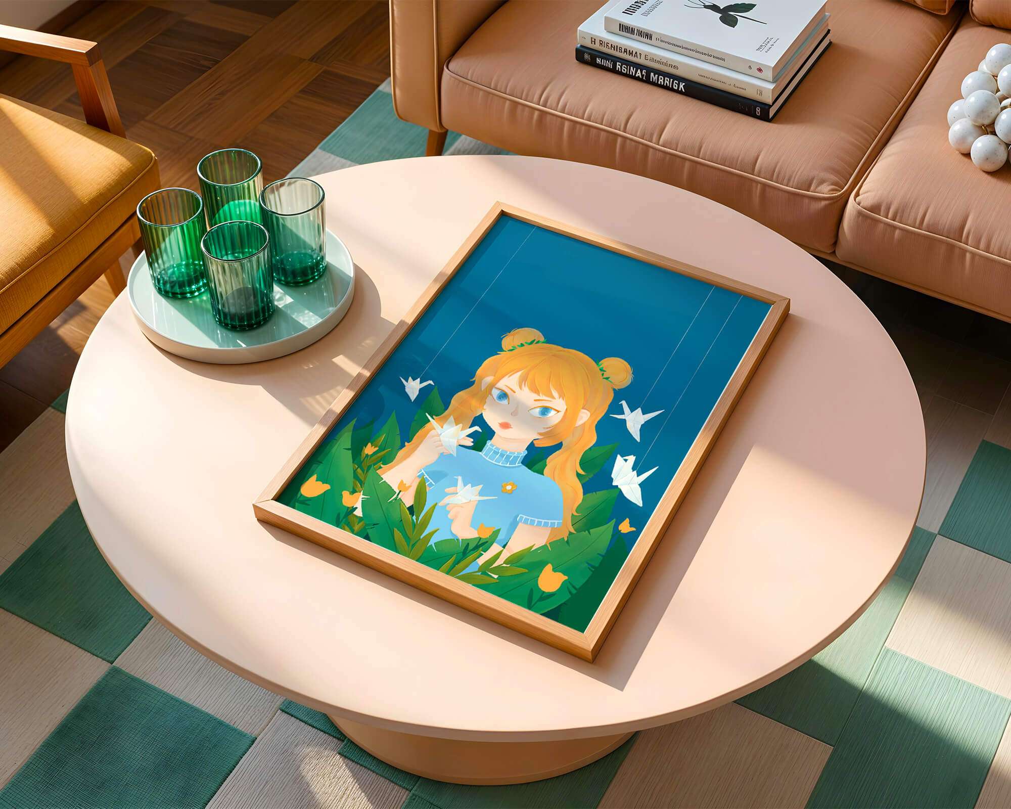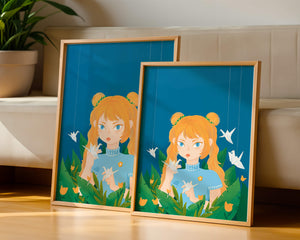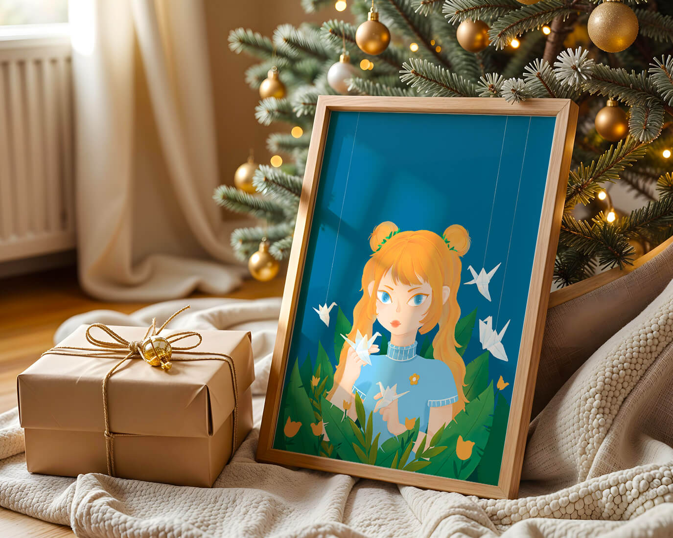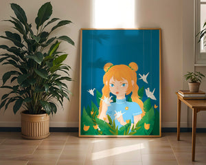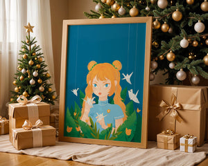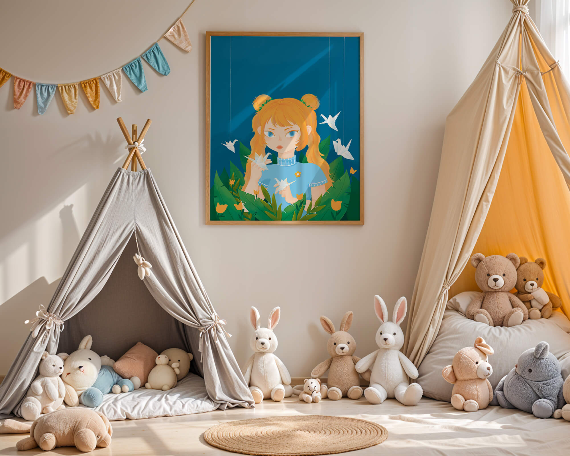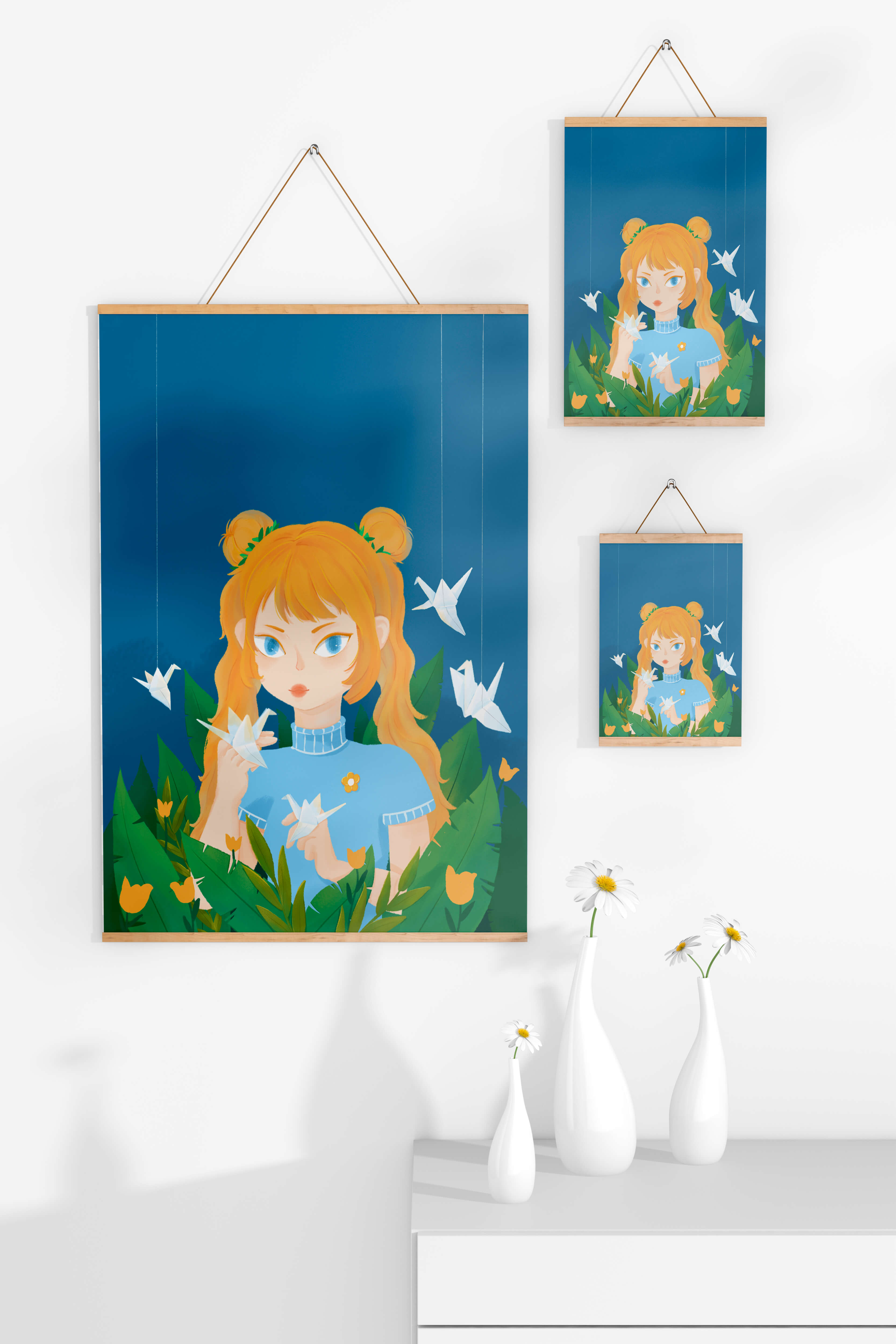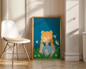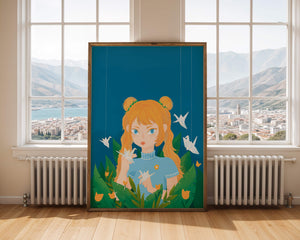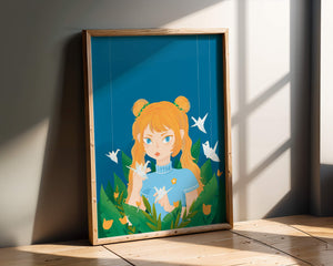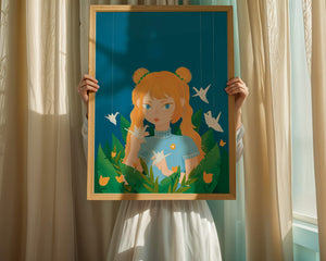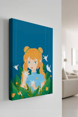 This charming illustration captures a young girl enveloped in a whimsical scene adorned with origami cranes and verdant foliage. Her vibrant orange hair and blue clothing draw the eye, creating a striking contrast against the deep blue background.The girl holds an origami crane in her hand, surrounded by lush leaves and small yellow flowers, conjuring a sense of playfulness and creativity. The suspended origami cranes add a dynamic element to the portrait, giving it an enchanting and youthful vibe. This artwork would make a delightful addition to any room, bringing a touch of color and fantasy to your decor.