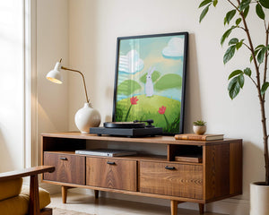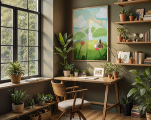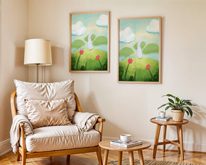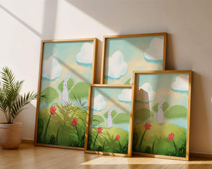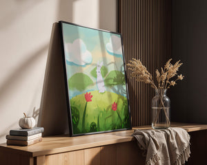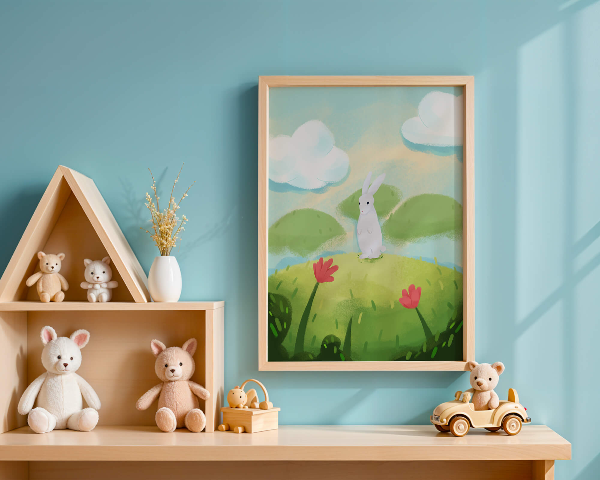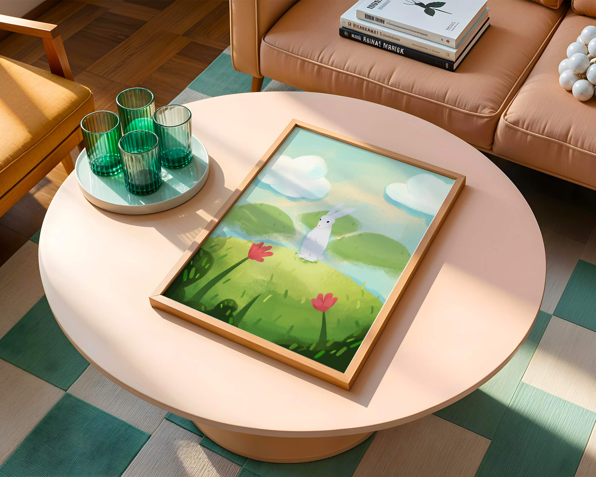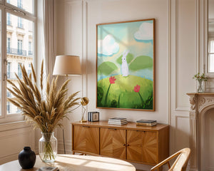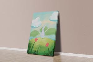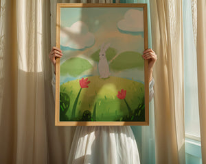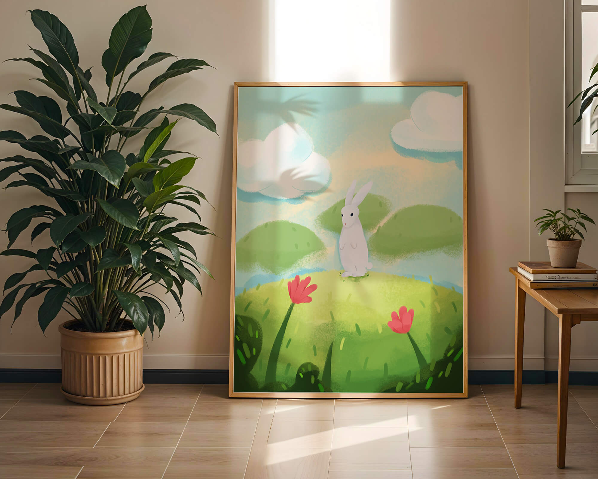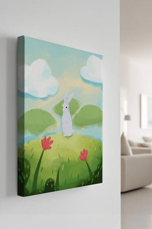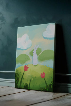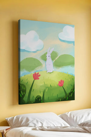 The image captures a moment of whimsical beauty, with the white rabbit positioned prominently on a grassy knoll. Its presence adds a sense of innocence and curiosity to the landscape. Delicate flowers in rich, cheerful hues adorn the foreground, enhancing the fantastical feel of the scene. The rolling green hills stretch into the distance, conveying a sense of endless, open space.Above, the soft, billowy clouds drift across a clear blue sky, evoking a calm and peaceful atmosphere. This image, with its bright and lively colors, brings the vitality of nature indoors, making it an ideal piece for spaces like nurseries or childrens rooms where imagination thrives. Its gentle allure also makes it suitable for home decor in living rooms or other areas seeking a touch of whimsy and