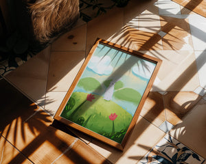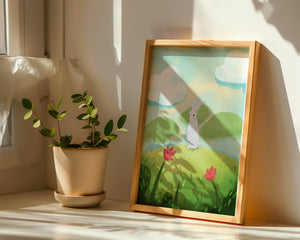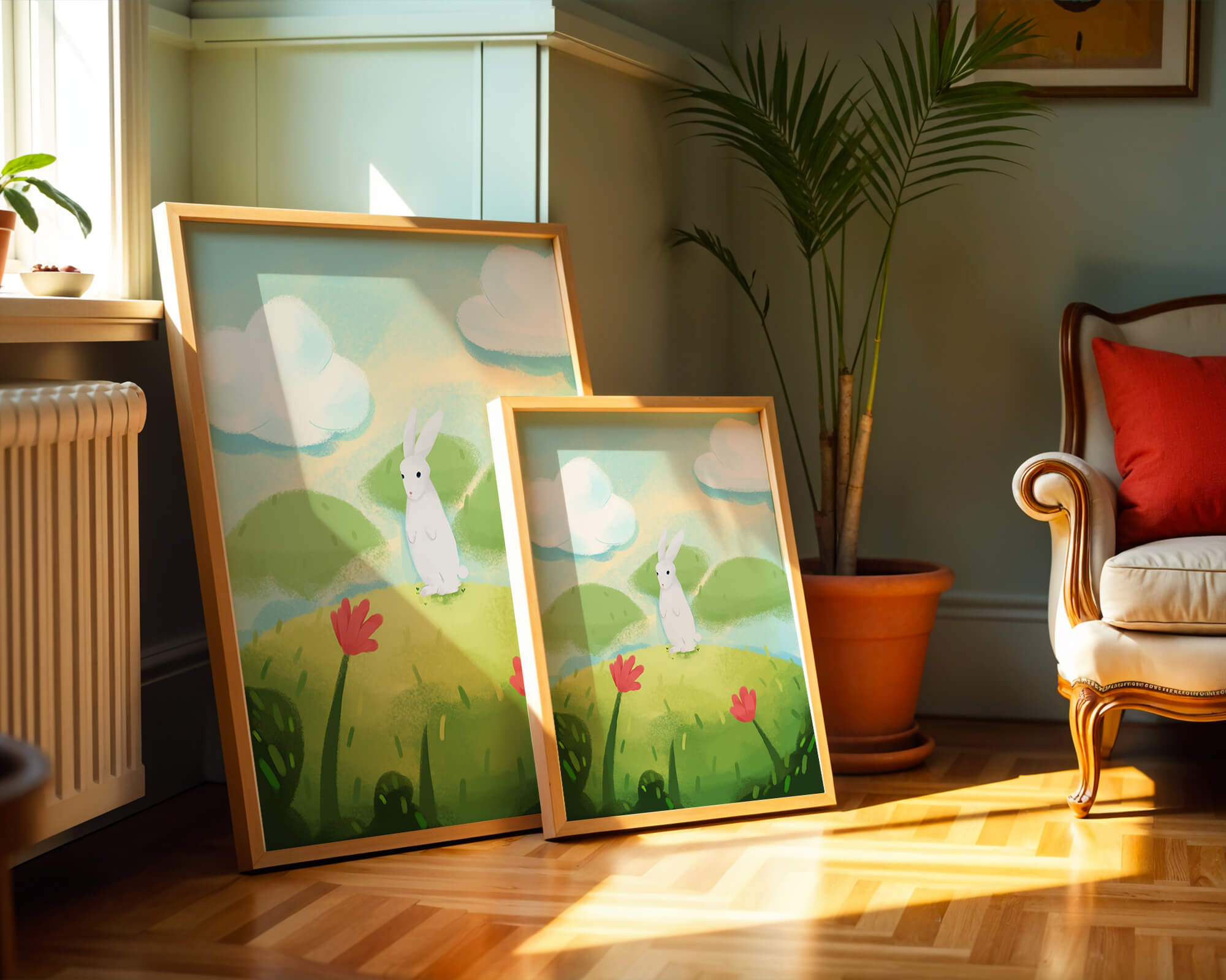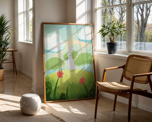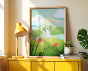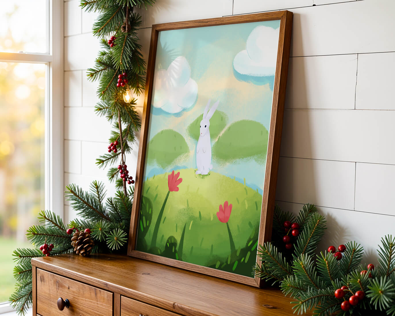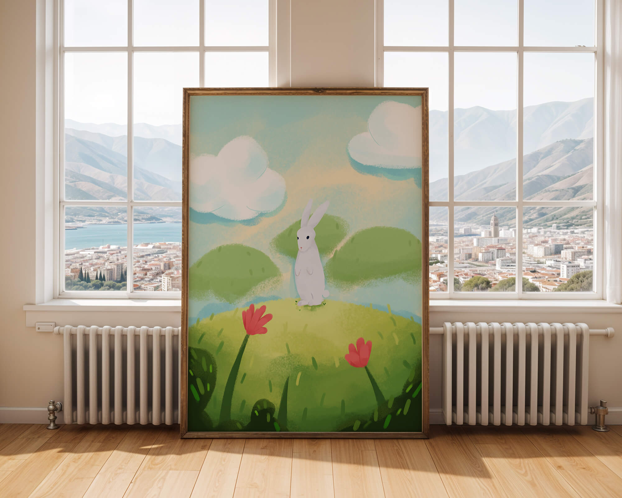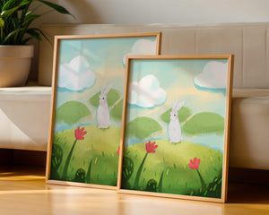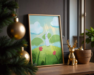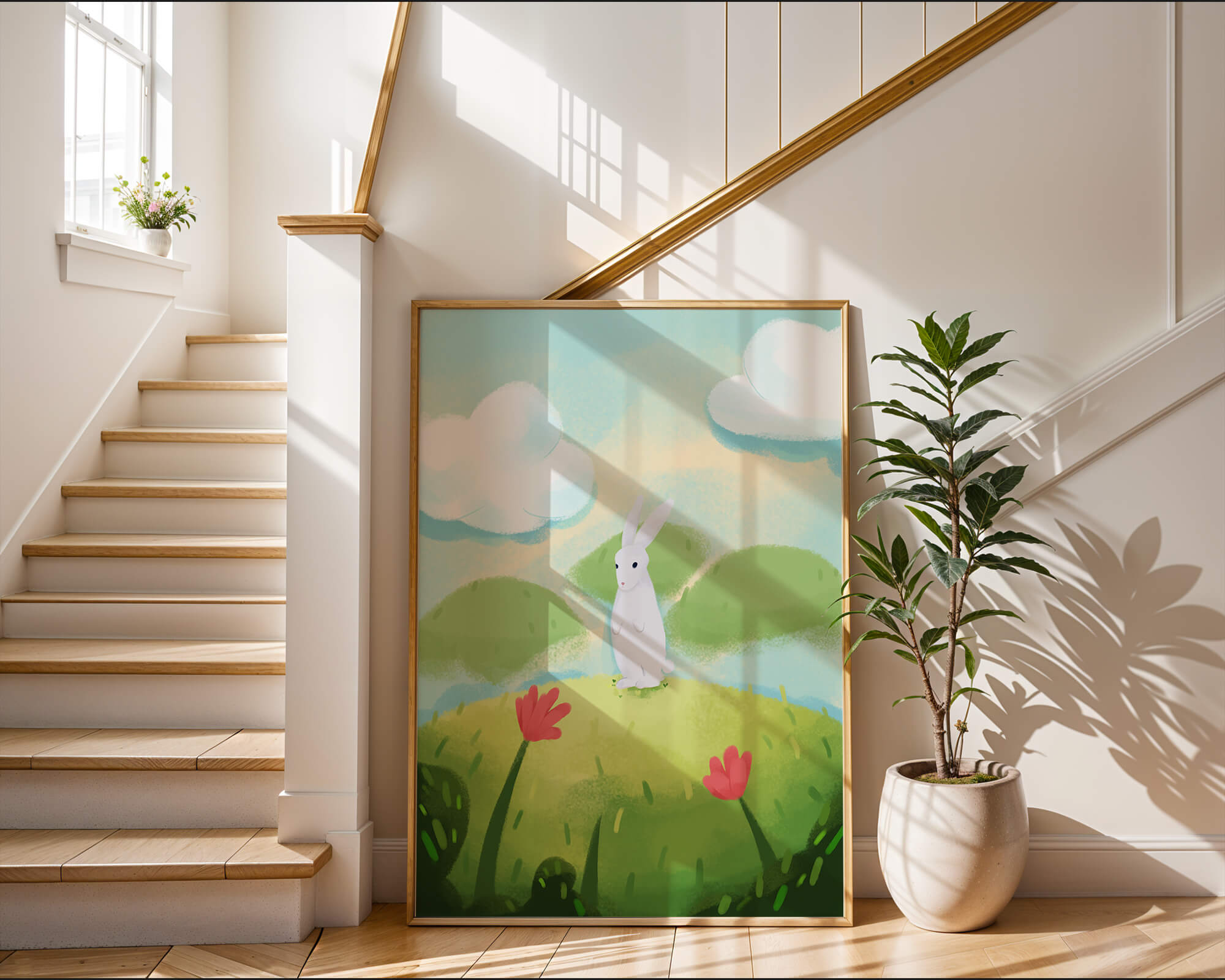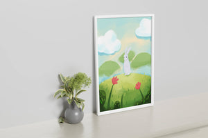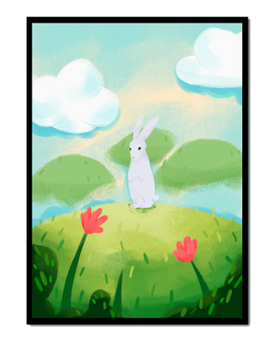 This charming illustration features a serene and playful scene with a white rabbit standing amidst rolling green hills and vibrant flowers under a tranquil blue sky with fluffy clouds.