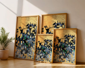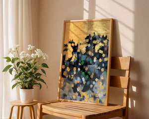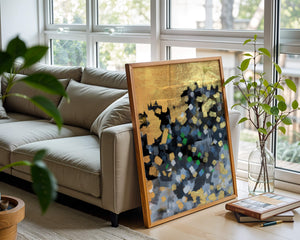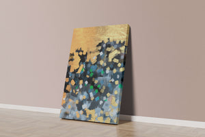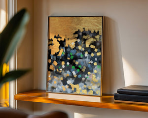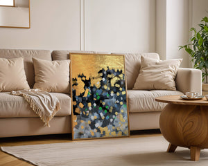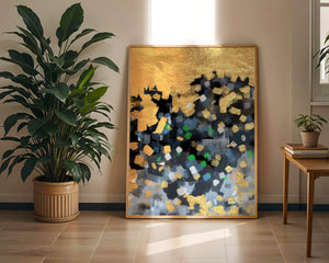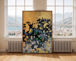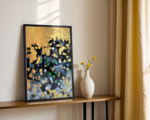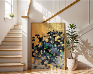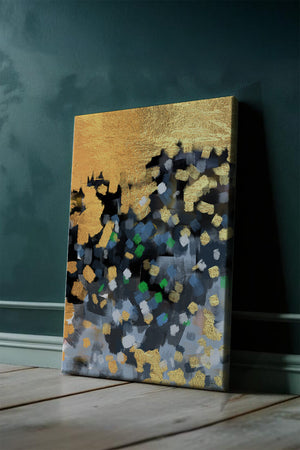 Эта захватывающая абстрактная картина сочетает в себе потрясающее сочетание золота и красочных мазков. Замысловатая текстура и яркая палитра создают визуально захватывающее изображение, которое легко привлекает внимание зрителя.