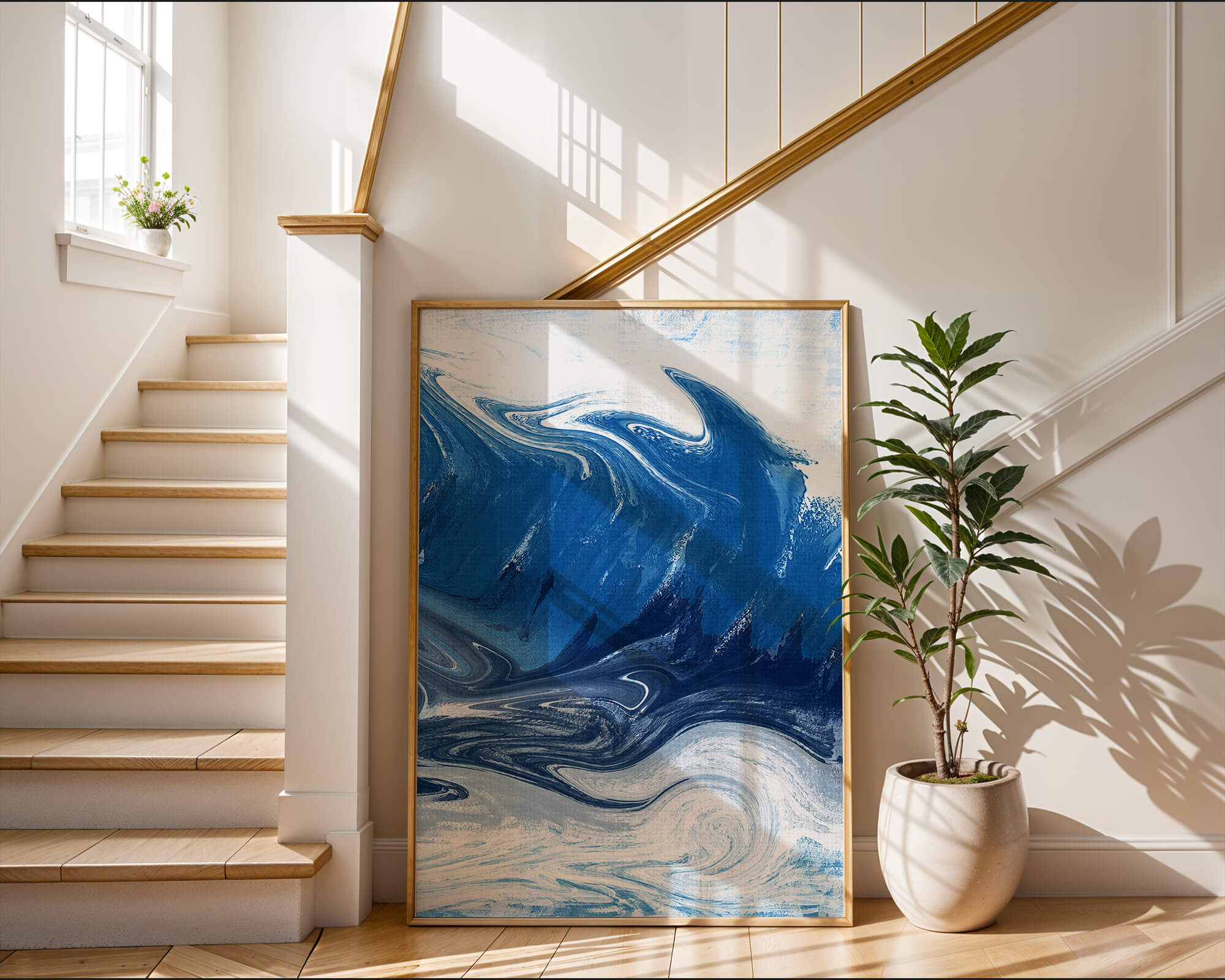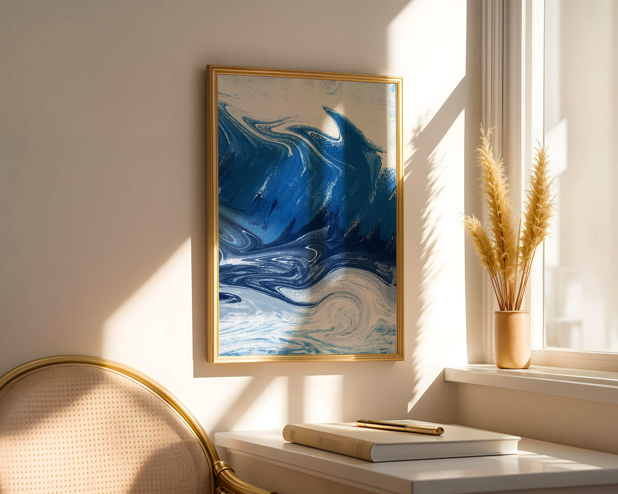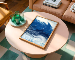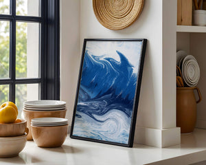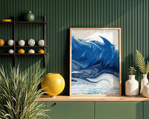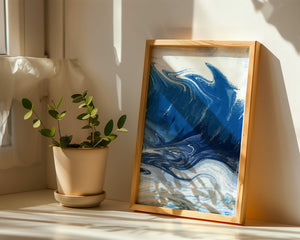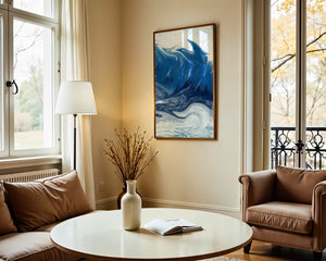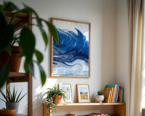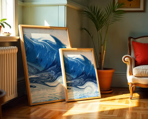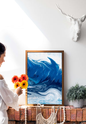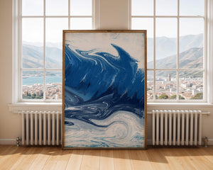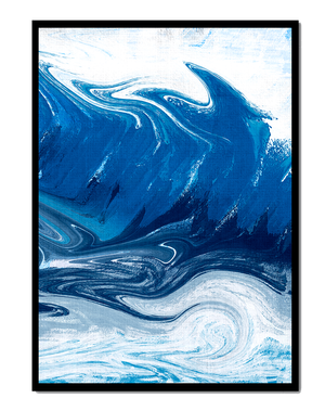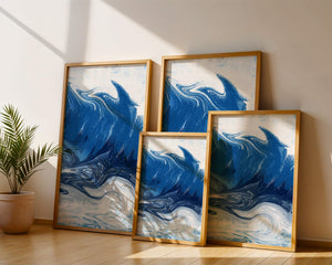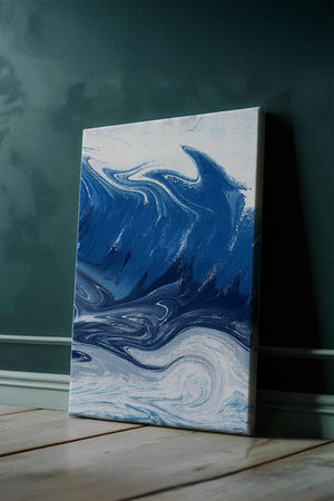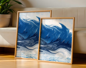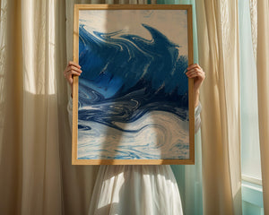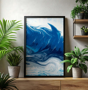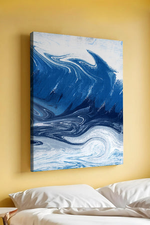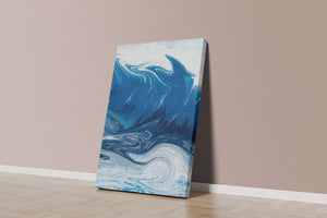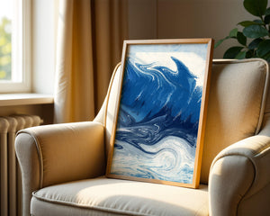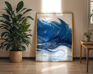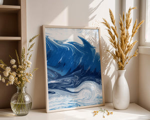 Это захватывающее изображение демонстрирует динамичную и текучую абстрактную картину, характеризующуюся закрученными узорами и яркой синей и белой цветовой палитрой. Это произведение искусства прекрасно передает движение океанских волн и одновременно излучает атмосферу энергии и спокойствия.